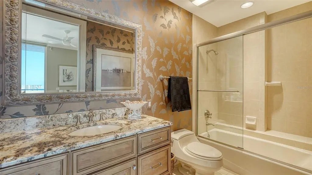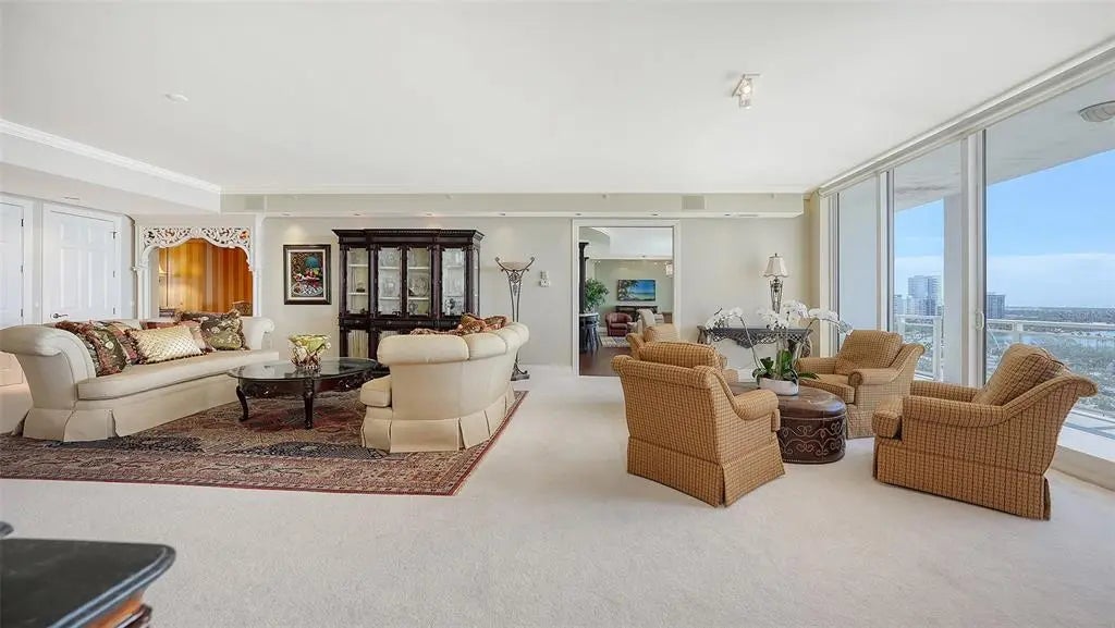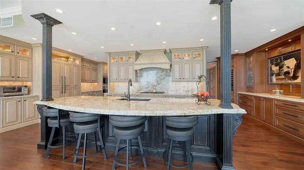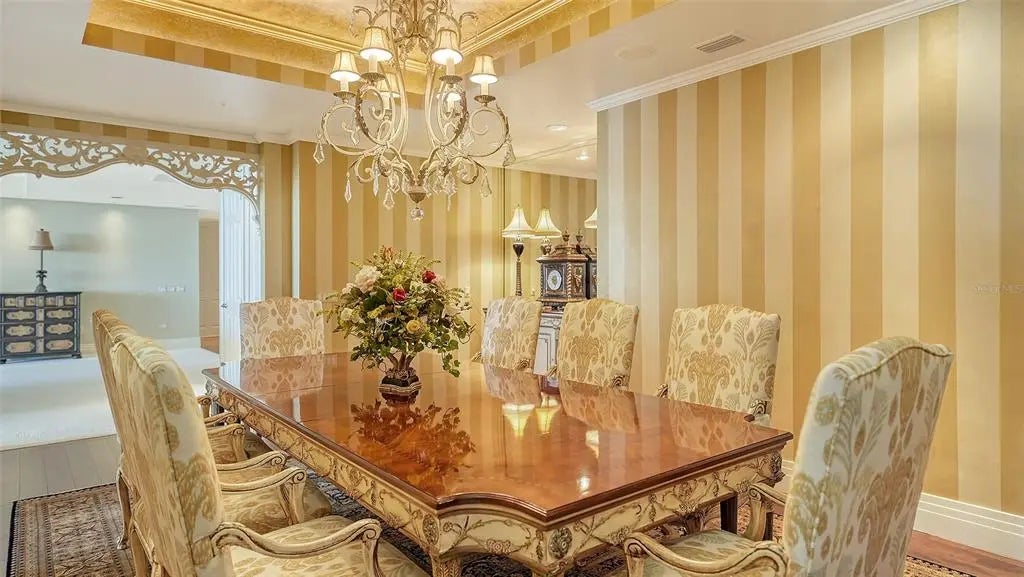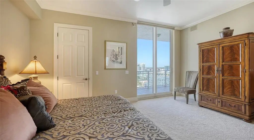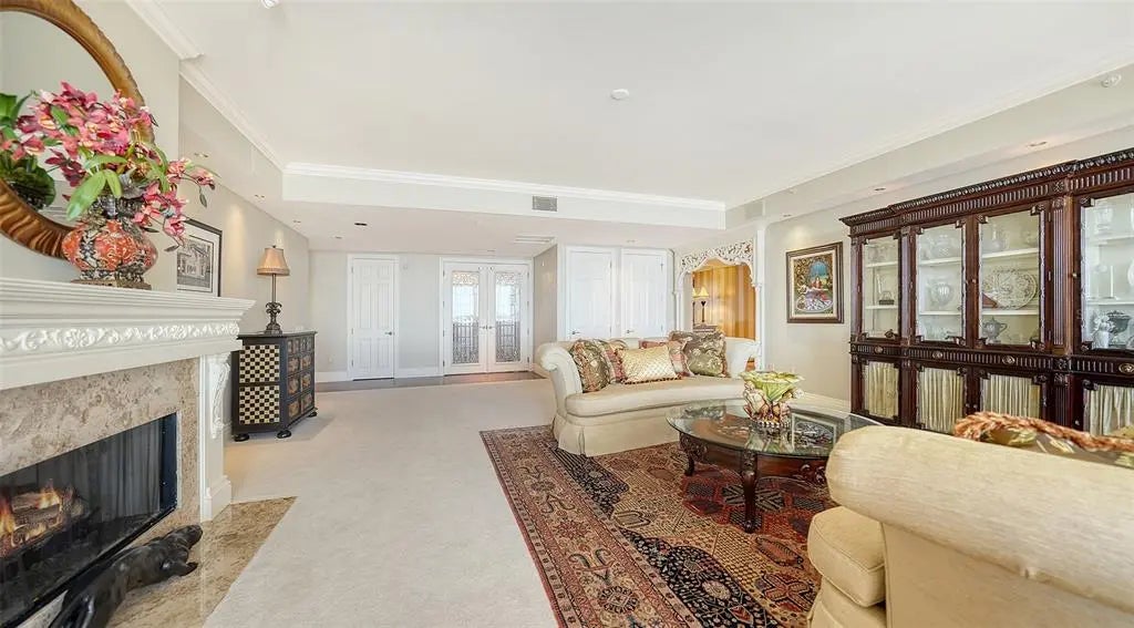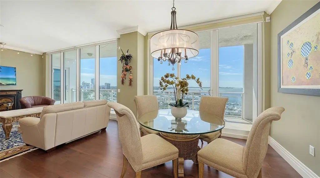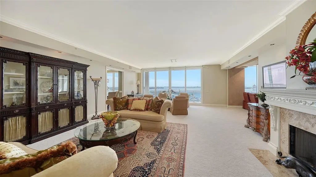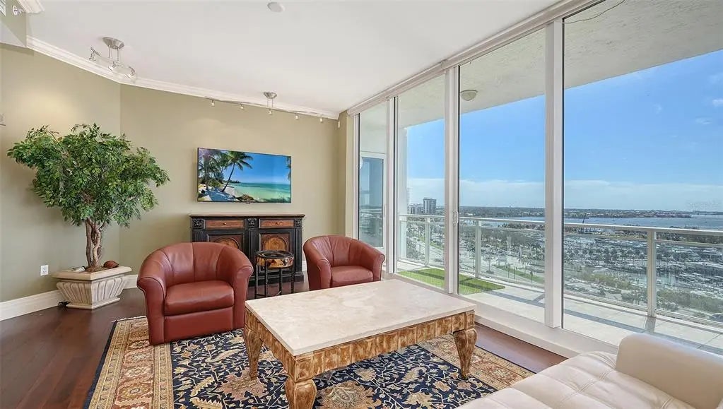 MAJOR PRICE REVISION. Marina Towers, Sarasota’s premier bayfront building is in the heart of downtown and offers 365* views of unimpeded bay, marina, gulf, and city views from this 10th floor, 5,800sf residence with an expanded terrace and high ceilings. A private elevator lobby opens into a Grand Salon featuring a gas fireplace and a wall of floor to ceiling windows overlooking the picturesque vistas. The large rooms throughout the residence with endless panoramic viewpoints make this a unique living experience. Delight in a gourmet chef's kitchen highlighted with top-of-the-line appliances including a Wolf gas range, Wolf ovens, Miele dishwasher and a Sub Zero refrigerator and a large pantry closet. A separate catering kitchen is perfect when entertaining larger groups, and spacious dining room and separate intimate dining space are ideal for family gatherings or intimate dinners. The bar area includes a handsome built-in wine cellar. A home theater and the family living areas are well-designed for everyday living. The floor plan lives like a sizable home accommodating 4-bedrooms, 3 en suite plus an oversized den/office with views for everyone. The primary suite has two large walk-in closets and a spacious bathroom. Both the primary and secondary suites overlook Sarasota Bay. Marina Tower offers the epitome of contemporary living in our vibrant bayfront city, boasting full-service amenities including 24-hour concierge and security. This is a pet-friendly, amenity-rich community featuring a chic outdoor heated pool/spa area, fitness center, and a community room with catering kitchen. Additionally, owners have access to a guest suite. This pet friendly community allows two pets with no weight limit. Clever building design allows owners to drive into the gated building, with concierge service available to assist with shopping bags and packages. Added unique features are room-size storage areas plus four secured parking spaces. Sarasota Bay’s famous sunsets and sparkling blue water as far as the eye can see with the heart of Downtown Sarasota, abundant dining, shopping, and entertainment mere steps away.