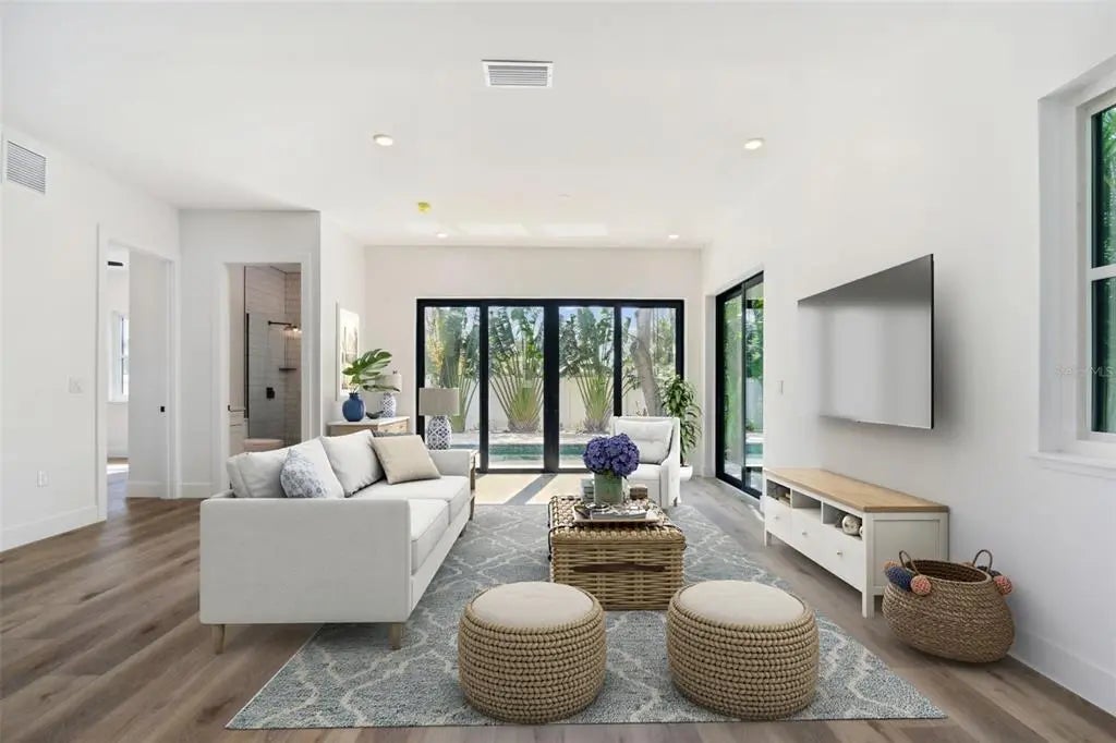 Some Photos Have Been Virtually Staged. HUGE PRICE REDUCTION ! Outstanding opportunity to own a brand-new luxury home in the heart of Sarasota. This Well-Constructed 4-bedroom, 4 full bath custom built 2 story pool home boast 3628 sq ft of living area plus a 2-car garage with epoxy finish. From the paver driveway and walkway with wood ceiling to the elegant hurricane rated Impact glass front door you will feel the quality immediately. The luxury vinyl flooring is carried thru the entire main living area and all 4 baths have upgraded ceramic tile. The gourmet kitchen is very open to all areas of the bottom floor and features quartz countertop, solid wood cabinets with soft closing drawers, high-end Thermador SS appliances including oven, microwave, large refrigerator and gas cooktop on separate kitchen island including custom hood and sitting area also featuring a large quartz countertop. All windows and doors are hurricane rated Impact glass for additional strength and safety. The dining room/living room have high soaring ceilings that adds a feel of spaciousness and there is also a large family room that overlooks the pool and paver deck area. The 2nd bedroom is on the 1st floor along with a guest/pool bath with décorative fixtures and a large shower. A generous laundry room with washer/dryer, upper and lower cabinets with sink is conveniently located adjacent to the garage and has access from the garage and from the main living area. There is storage space under the staircase and includes a tankless water heater. The stylish stair rails lead to a very efficient 2nd story loft area with 2 in-floor electrical outlets and overlooks the dining/living area. The large primary bedroom has a private covered balcony with wood ceiling and overlooks the back yard pool area. The primary bath includes quartz countertop with double sinks, a large glass shower and a free-standing soaking tub and decorative fixtures. Bedroom #3 includes an en-suite bathroom with solid countertop and shower with floor to ceiling tile. Bedroom #4 has private access to bath #4 which includes solid surface counter and tub with floor to ceiling tile. Outside the home is fully fenced with high quality vinyl for privacy and landscaped with large tropical trees. There is a large brick paver courtyard area on the side of the home accessed from the 4 sliding glass doors near the kitchen and includes pre-plumbed for water, gas and electric as well as a pass-thru window from the kitchen. The private backyard is highlighted by the open-air saltwater pool, paver decking and lush landscaping. The exceptional location of the home gives great access to all services including shopping, restaurants, Sarasota Memorial hospital, Downtown Sarasota, Siesta Key and Lido world famous beaches and much more. Call today for your private showing.