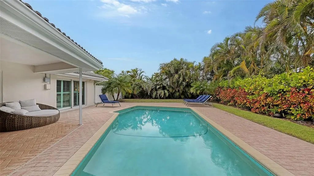 This lovely Bird Key garden home resides on a corner lot with a large circular paver driveway and beautiful landscaping that leads to the front door with the 2 car garage located on the side of the house. Inside, you will find abundant natural light with many windows and glass sliders that afford a splendid view of the large yard and pool area with a private garden wall. This three-bedroom residence has a split floor plan offering a private master suite, complete with 2 walk-in closets, an en-suite bathroom, and sliding doors to the pool deck. The two guest bedrooms and a second bathroom complete the other end of the house. A powder room and an oversized laundry room with a sink and loads of storage are a bonus not found in many garden homes. The kitchen overlooks the large backyard and pool area, with granite countertops, stainless steel appliances, and a breakfast bar overlooking the family/dining room. The house has high-impact windows & sliding doors, a heated pool, a well for irrigation, and mature lush landscaping that provide privacy and a large fenced back yard. The most recent upgrades and improvements from the interior to the exterior include re-ling the plumbing under the slab. The garage was gutted, painted and the floor epoxied. Updated interior baseboards and stunning interior lighting were installed throughout the home, giving it an updated, sleek look. This home is move-in ready. Live the comfortable Florida dream by opening large sliders to the pool area, with neutral tile throughout and a spacious flowing floorplan that makes the indoor-outdoor lifestyle easy. This residential island has its own optional Bird Key Yacht Club, tennis courts, swimming pool, fitness room, social scene, boat slips, marina, indoor and outdoor dining. These are the perfect ingredients for making this your private island retreat, complete with nearby beaches, dining, shopping, excellent schools, and the beautiful downtown area.