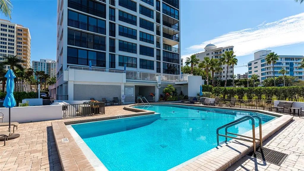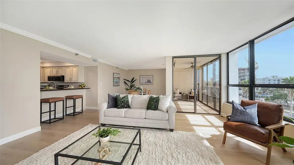 Don't miss out on this one. The seller is offering the buyer a 6-month credit for condo fees at closing. Sunset Towers is a stunning and perfectly located property in Sarasota! Just renovated with new wood floors throughout the living room, dining room, kitchen, and halls, carpeted bedrooms, entirely freshly painted top to bottom, updated kitchen, solid surface counter tops, and lighting. Additionally, important updates, some newer impact windows, a washer, a dryer, a stainless steel dishwasher, a new stove, oven, and microwave make this property stand out and ready to move in. The floor-to-ceiling windows let you enjoy the breathtaking views of the Intracoastal Waterway and Ringling Bridge—secure entry to the luxury lobby with private mailboxes, elevator to your condo. You'll have easy access to the city's cultural treasures, year-round entertainment, including St. Armand's Circle events and Sarasota's Saturday Farmer's Market. Just minutes from the famed Sarasota Opera House, The Ringling Museum, beautiful Lido Beach, and Longboat Key. Walkable to Downtown Sarasota, Marina Jacks, and St. Armand’s Circle. In addition, many activities, restaurants, world-class shopping, and weekly events will be sure to fill your days. The beautifully maintained and updated public spaces include a two-story deck overlooking Sarasota Bay, a fully updated saltwater heated pool, a private beach, kayak storage, a fitness center, covered assigned parking, and secure entry, all overseen by a manager who lives onsite. The same family has owned the unit itself since the building was constructed in 1960. Enjoy the lovely views of Golden Gate Point, Sarasota Bay, and the Ringling Causeway. With two spacious bedrooms, the master bedroom features an ensuite bath. This is a fantastic opportunity to own your own Downtown Sarasota oasis!