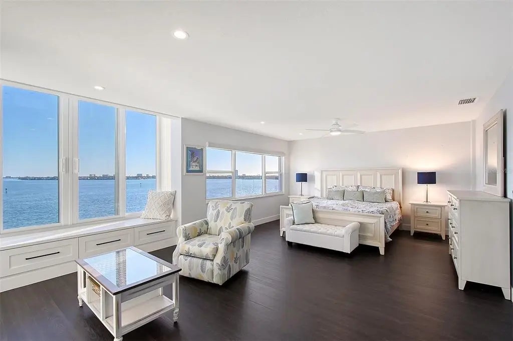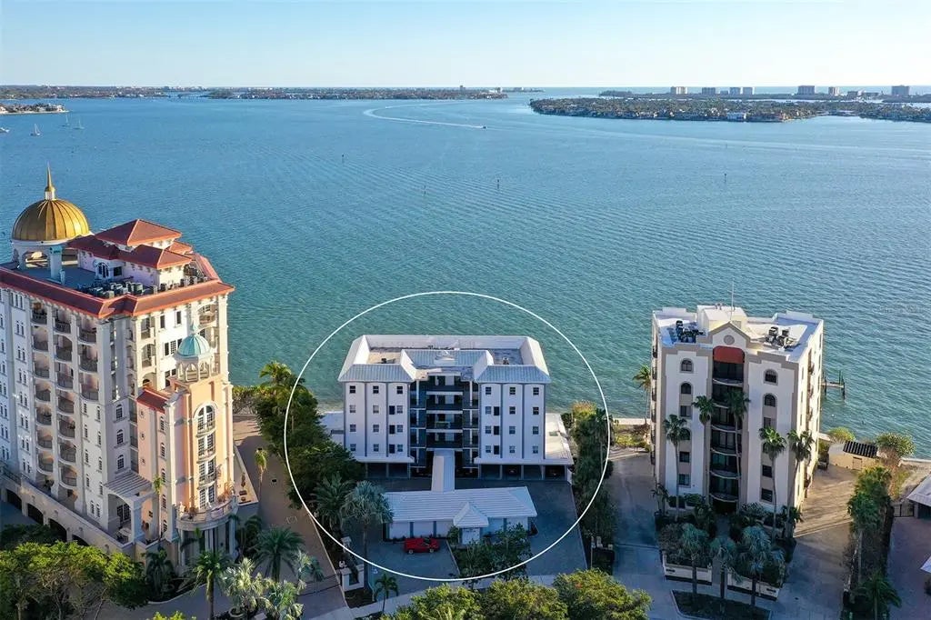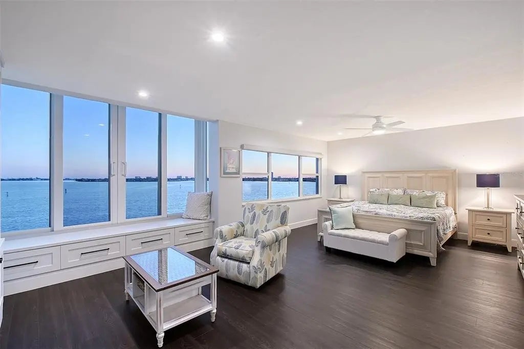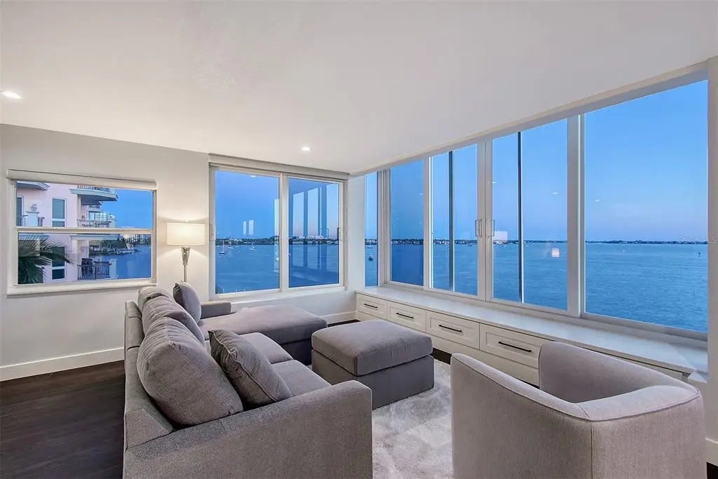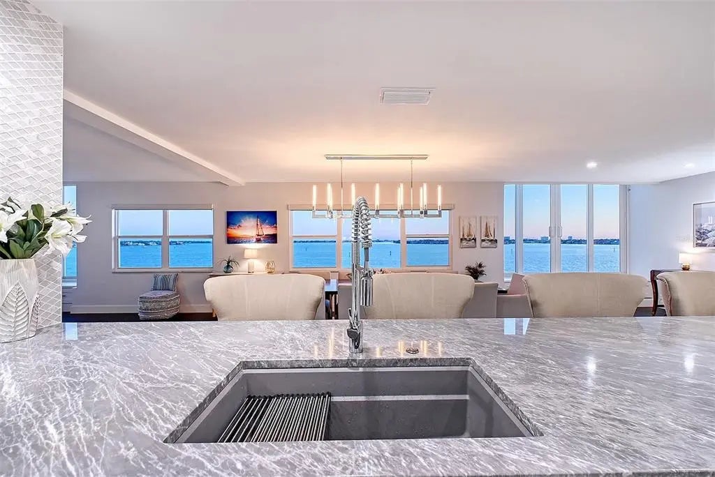 One of the most unique waterfront penthouses on Golden Gate Point in downtown Sarasota, this fully renovated condo was combined from two units and designed with an open floor plan to maximize the best views in the community. At the tip of Golden Gate Point, you will enjoy 180-degree panoramic views from the city to the marina, to the Ringling Bridge with sunrises, sunsets, marine life and boating activity. With nearly 3,000 square feet and 75 linear feet of living space, there is plenty of room for relaxing or entertaining while enjoying the amazing views of the bay from the floor-to-ceiling windows. With three bedrooms and three-and-a-half baths, this is the condominium for families or for hosting guests. The main bedroom suite features waterfront views and includes a large closet with built-ins and an upgraded bath with dual vanities, soaking tub and shower. The gourmet kitchen features an expansive granite island with Bosch appliances and looks out toward the dining area with windows providing endless water views. A split floor plan, the other side of the condominium features an en-suite bedroom, second guest bedroom, full bath, half bath, laundry and utility room. The spacious front porch is a great place to enjoy the outside with convenient access to the elevator. Two parking spaces with a storage closet come with this condominium and are conveniently under the building. The location doesn't get much better than this, just a few minutes to Marina Jacks and downtown Sarasota and less than 10 minutes to St. Armands Circle and Lido Beach. Don't miss this opportunity to own a one-of-a-kind modern renovated condominium with some of the best views on Golden Gate Point.