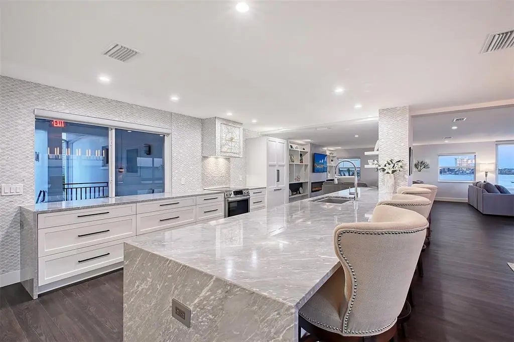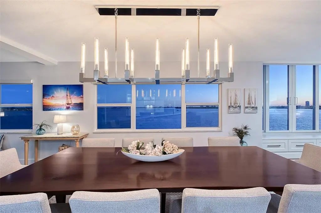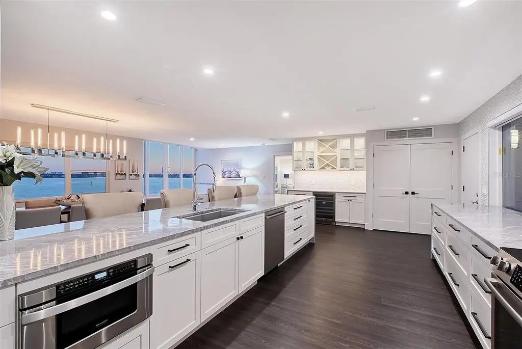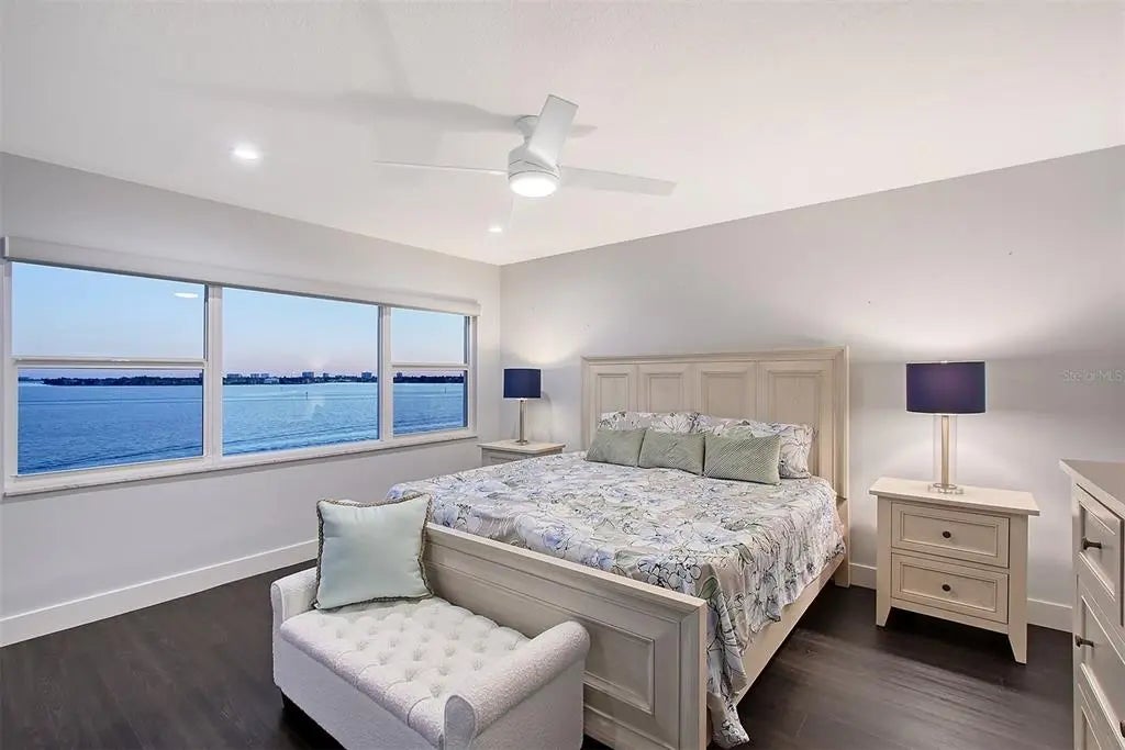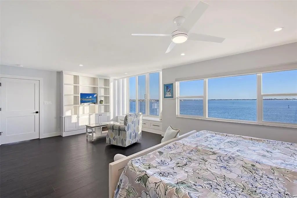 One of the most unique waterfront penthouses on Golden Gate Point in downtown Sarasota, this fully renovated condo was combined from two units and designed with an open floor plan to maximize the best views in the community. At the tip of Golden Gate Point, you will enjoy 180-degree panoramic views from the city to the marina, to the Ringling Bridge with sunrises, sunsets, marine life and boating activity. With nearly 3,000 square feet and 75 linear feet of living space, there is plenty of room for relaxing or entertaining while enjoying the amazing views of the bay from the floor-to-ceiling windows. With three bedrooms and three-and-a-half baths, this is the condominium for families or for hosting guests. The main bedroom suite features waterfront views and includes a large closet with built-ins and an upgraded bath with dual vanities, soaking tub and shower. The gourmet kitchen features an expansive granite island with Bosch appliances and looks out toward the dining area with windows providing endless water views. A split floor plan, the other side of the condominium features an en-suite bedroom, second guest bedroom, full bath, half bath, laundry and utility room. The spacious front porch is a great place to enjoy the outside with convenient access to the elevator. Two parking spaces with a storage closet come with this condominium and are conveniently under the building. The location doesn't get much better than this, just a few minutes to Marina Jacks and downtown Sarasota and less than 10 minutes to St. Armands Circle and Lido Beach. Don't miss this opportunity to own a one-of-a-kind modern renovated condominium with some of the best views on Golden Gate Point.