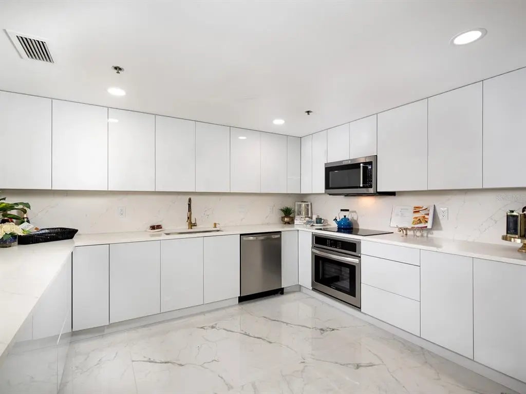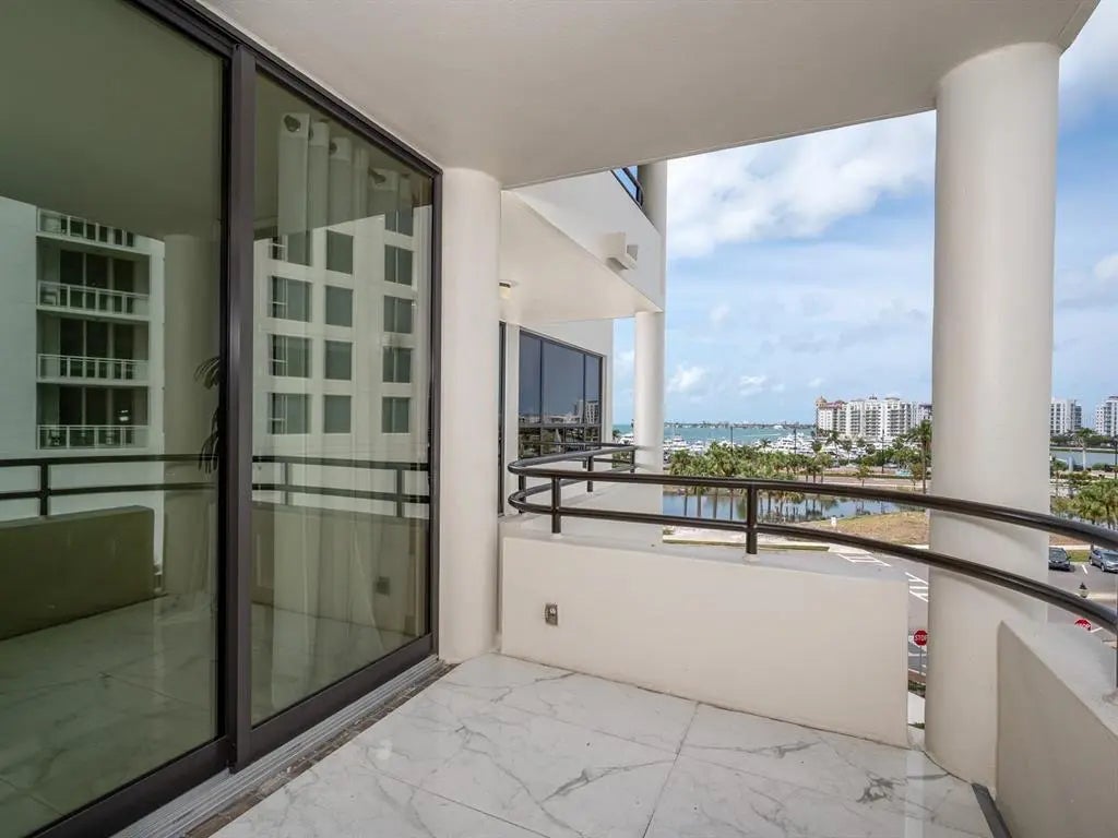 One or more photo(s) has been virtually staged. This extraordinary unit has been exquisitely remodeled to an impeccable standard, utilizing only the finest materials. Every detail has been meticulously crafted to provide an unparalleled luxurious living experience. Prepare to be enchanted by the breathtaking views of Sarasota Bay from three expansive balconies that showcase both waterfront and vibrant downtown panoramas. The sophisticated marble flooring extends seamlessly throughout the entire unit, including the balconies, creating an elegant atmosphere. Eye-catching design elements include brushed gold finishes on all faucets and door handles, low-profile lighting, complemented by custom European doors and exquisite trim work. An open floor plan ensures the views can be enjoyed from every corner of this city dwelling. The modern European kitchen features high-end appliances and elegant finishes, such as marble countertops, a breakfast bar, and a matching backsplash, while maintaining the home's aesthetic. It also includes a convenient service entrance with private laundry facilities. The thoughtfully designed split floor plan guarantees privacy for you and your guests, featuring two primary suite options, each with en suite baths. You can relax in one that has an indulgent soaking tub and dual sinks with LED backlit mirrors, while both include luxurious showers with glass doors and custom fixtures. Plus, this coveted Bay Plaza residence has an exceptional rarity of a third bedroom and third full bath! As a resident, you will enjoy unparalleled amenities, including 24/7 valet parking, convenient EV charging stations, and round-the-clock concierge services that are second to none. The building has recently been transformed with the installation of impact-resistant glass, elevating its sophistication and ensuring both style and safety. Unwind in the luxurious heated swimming pool, soak in the rejuvenating Jacuzzi spa, or maintain your fitness routine in the state-of-the-art fitness room, complete with a European sauna and steam room. Nestled in the heart of downtown Sarasota, this prestigious building is surrounded by various trendy restaurants and boutiques. Residents can effortlessly immerse themselves in the vibrant cultural scene, with Whole Foods, the Theatre, and the Opera just moments away. Enjoy the spectacular 4th of July fireworks at Marina Jacks from the comfort of your balcony. With its unbeatable location just minutes from St. Armands Circle, Longboat Key, and Sarasota’s stunning beaches, this unit offers an unparalleled opportunity to embrace the dynamic social lifestyle that downtown Sarasota proudly provides. Don't miss your chance to make this exquisite residence your own!