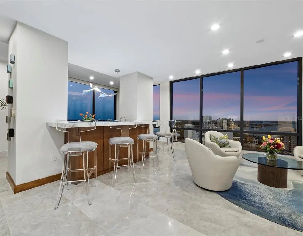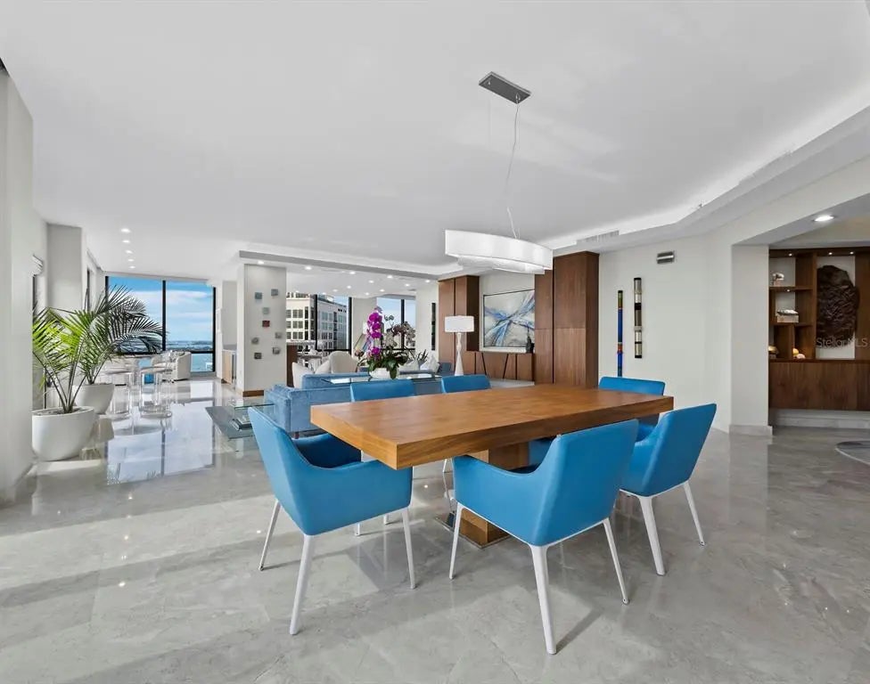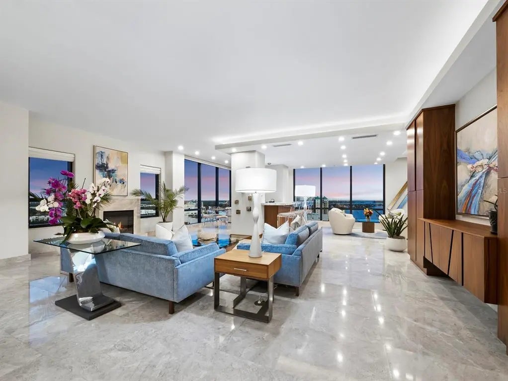 Penthouse Perfection in the Heart of Downtown Sarasota â The Plaza at Five Points Poised high above the vibrant cultural epicenter of Sarasota, this exceptionally renovated 17th-floor penthouse at The Plaza at Five Points epitomizes modern elegance and urban sophistication. Perfectly situated across from Five Points Park, The Selby Library, and the Sarasota Opera House, this distinguished residence places you steps from world-class dining, galleries, theaters, and boutique shopping. With floor-to-ceiling windows and an expansive open-plan layout, this luxurious home in the sky offers breathtaking, panoramic vistas that sweep across the city skyline, Sarasota Bay, the marina, and onward to the shimmering horizon of the Gulf of Mexico. The terrace invites tranquil mornings and unforgettable sunsets, framing the coastal beauty of Florida at its finest. Designed for both effortless entertaining and serene living, the interior boasts soaring volume ceilings and exquisite contemporary finishes throughout. The main living space is a masterclass in modern design, featuring refined stone flooring, custom built-ins, a striking marble-clad gas fireplace, and a fully integrated wet bar with stone counter and led illumination. The gourmet kitchen is a chefâs dreamâadorned with new sleek cabinetry, stone countertops, cabinet paneled refrigerator and high-end stainless-steel appliances, a spacious island, large eat in area, and designer tile backsplash - all blending style with functionality. The primary suite is a private sanctuary, complete with a secluded terrace, dual luxurious bathrooms, and generous his-and-her walk-in closets. A sumptuous Jacuzzi tub, separate walk-in shower, and elegant stone finishes elevate the spa-like ambiance. Two additional en-suite bedroomsâone of which serves as a sophisticated study with built-in storage and a hidden Murphy bedâoffer privacy, versatility, and guest accommodations of the highest standard. Life at The Plaza at Five Points is defined by its world-class amenities and unwavering attention to detail. Residents enjoy a private, secured lobby entrance, full-time concierge, and valet services. Socialize or entertain in the elegant club room with a fireplace and catering kitchen, hold meetings in the professional conference room, or unwind in the rooftop heated pool and spa, surrounded by expansive sun decks and covered lounging areas. Additional amenities include a fully equipped state-of-the-art fitness center, a furnished guest suite, gazebo and grill area, and a Grand Motor Court. This penthouse residence also includes two secure garage parking spaces and an oversized, climate-controlled storage unit ideally located just steps from the unitâs hallway. The pet-friendly building offers the ultimate convenience for those seeking refined urban living in one of Floridaâs most sought-after coastal cities. Don't wait to build, this new apartment is ready for you. Where Sophistication Meets the Sky â Experience the Pinnacle of Sarasota Living.