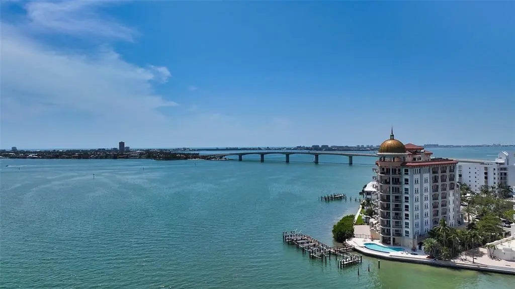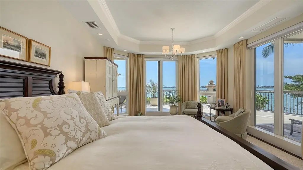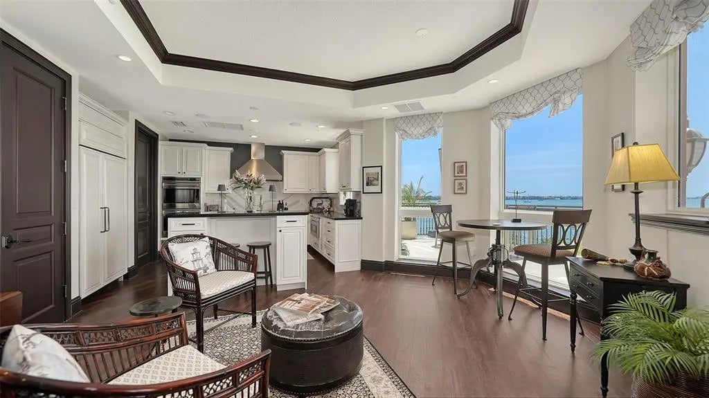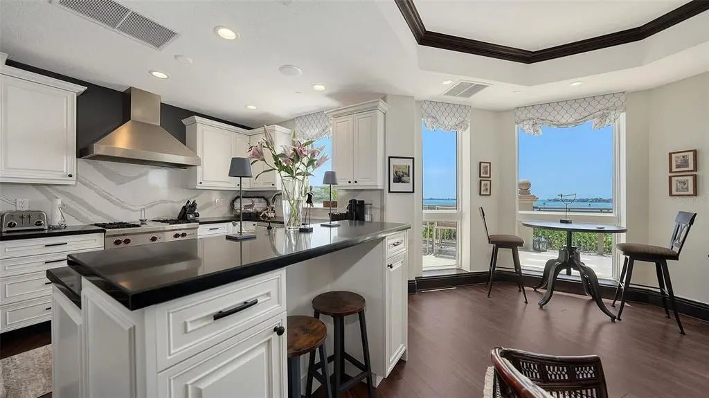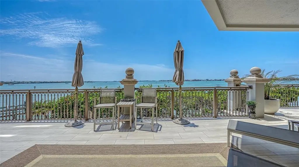 Experience the epitome of elegance and timeless sophistication in this exquisitely appointed three-bedroom residence. at the exclusive Grande Riviera, a breathtaking architectural gem nestled in the prestigious Golden Gate Point neighborhood. Meticulously maintained, this classic condominium offers panoramic views of Sarasota Bay and the sparkling downtown skyline, setting a new standard for luxury waterfront living. This residence boasts the largest terrace in Grande Riviera, approximately 2300 square feet, providing the ultimate setting for sunsets and entertaining friends and family. One of only 13 exclusive residences, this home offers an intimate and private lifestyle, with a private elevator entrance leading directly to the elegant foyer. Designed for both comfort and grandeur, the residence features arched walkways, rich crown molding, and expansive living spaces ideal for entertaining or quiet reflection. The heart of the home is a remodeled chef’s kitchen, outfitted with a large center island, solid wood cabinetry adorned with sleek black hardware, a quartz backsplash, granite countertops, and a Sub-Zero refrigerator and freezer, as well as a Wolf gas range and double wall oven. Deluxe Laundry room with custom cabinetry and workspace conveniently located near the kitchen. A wet bar with a Sub-Zero wine fridge seamlessly connects the open living space to the elegant dining and living areas, creating a perfect flow for gatherings. Step outside onto the largest private wraparound terrace in the building, where you’ll enjoy breathtaking, unobstructed views of the bay. This is truly one of the most distinguished outdoor living spaces in the complex. The owners’ suite is a serene retreat, featuring dual walk-in closets with custom built-ins, and a spa-like bathroom with marble floors, a dual quartz vanity, walk-in shower with dual showerheads, and a private water closet. The suite also offers direct access to the terrace, allowing for peaceful mornings with stunning bay views. The guest suite boasts a private terrace entry, en suite bath, and walk-in closet, while a versatile third bedroom/ den with double glass doors can serve as an office, sitting room, or additional guest space. Additional features include a private, deeded two-car garage with storage, resort-style pool, rooftop terrace, boat docks, on-site management, and private secured access. This is a rare opportunity to own a distinguished waterfront home in one of Sarasota’s most coveted locations, a residence that masterfully blends classic design, modern comforts, and breathtaking surroundings.