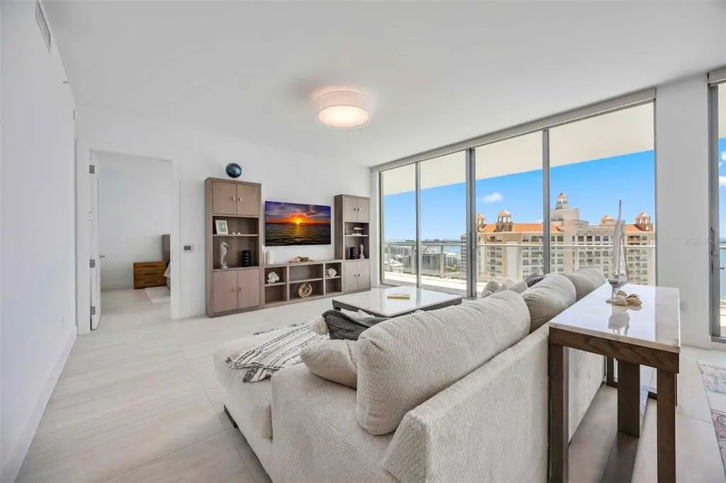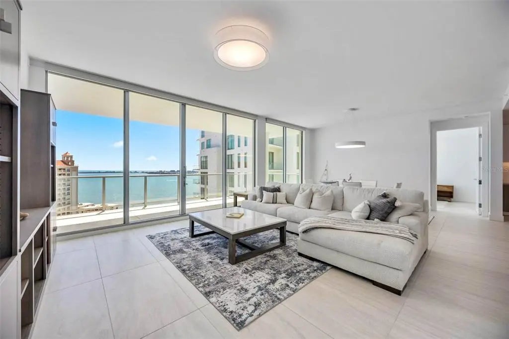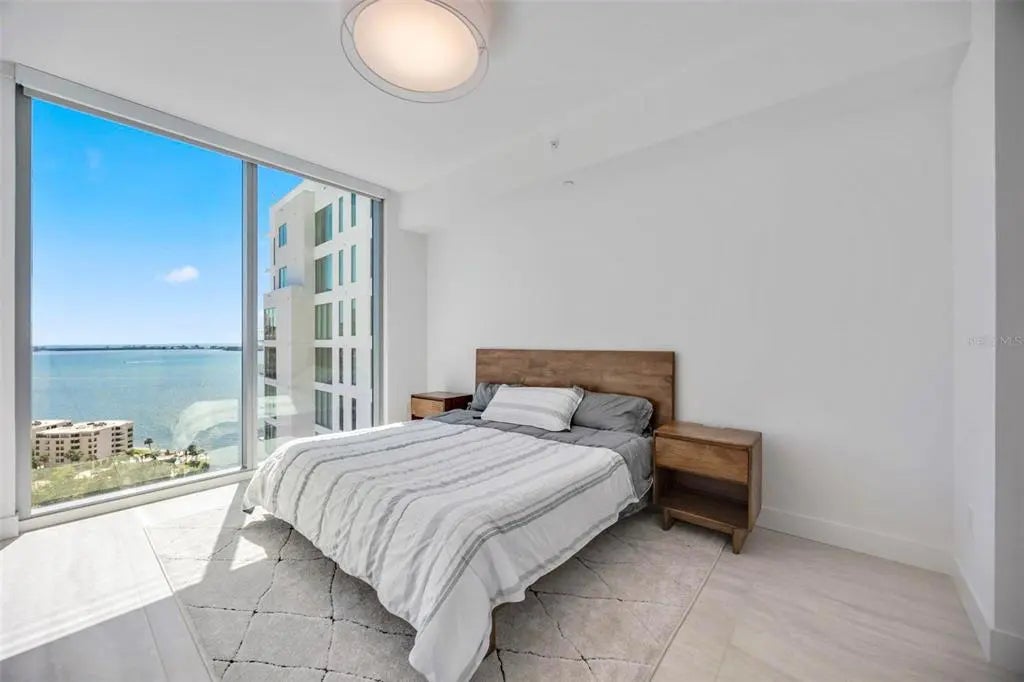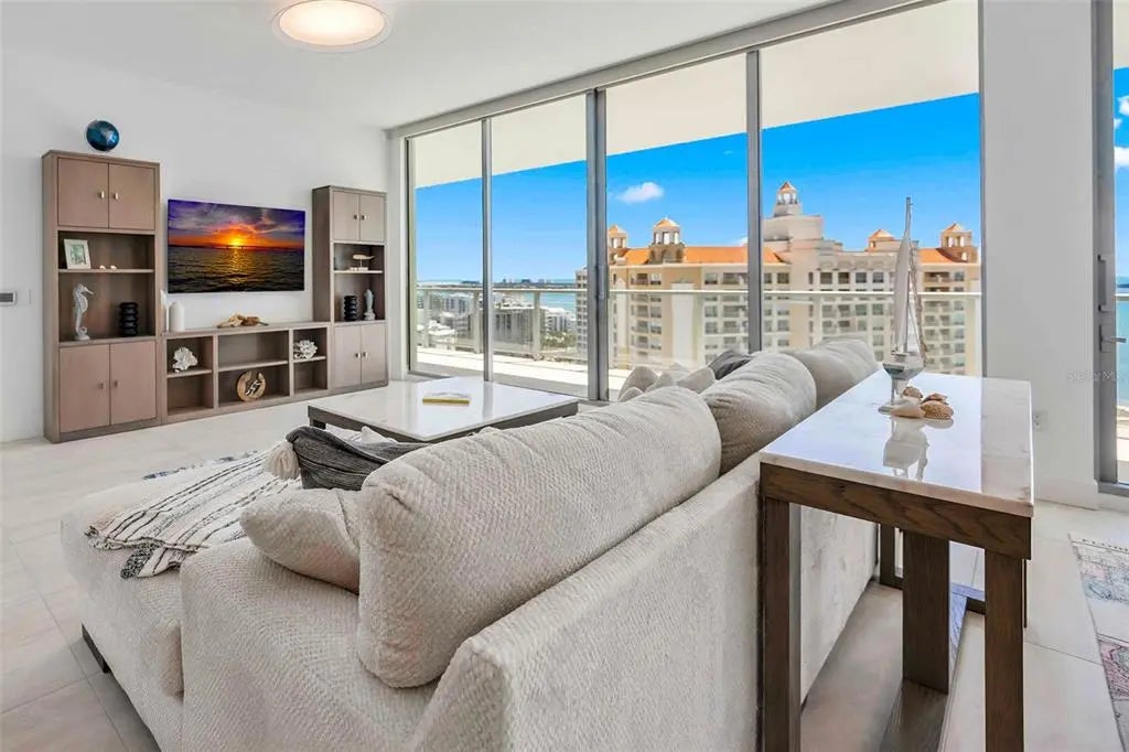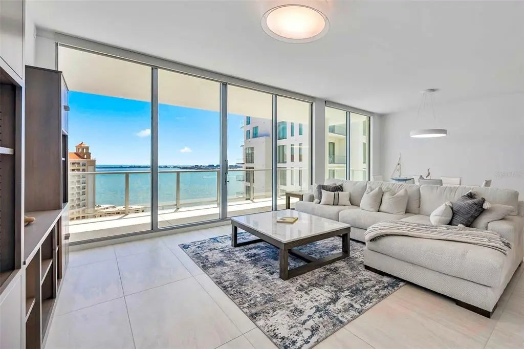 FURNISHED 17th FLOOR condo is positioned in the MOST HIGHLY DESIRED STACK in the building, DELIVERING THE BEST WATER VIEW in Bayso. Experience the pinnacle of luxury living at Bayso, Sarasota’s premier downtown Bayfront tower at The Quay. This exceptional 2,073 sq. ft. residence is perfectly positioned to capture breathtaking sunsets and panoramic views of Sarasota Bay, the downtown skyline, and the Gulf of Mexico. Soaring 10-foot ceilings and expansive 10-foot floor-to-ceiling windows and sliders flood the home with natural light, seamlessly connecting to an oversized 10-foot-deep terrace with sleek glass railings—ideal for entertaining or relaxing in style. Every detail of this two-bedroom, three-bath home has been thoughtfully designed for the most discerning buyer. The chef-inspired kitchen features designer European cabinetry, quartz countertops, and premium Jenn-Air stainless steel appliances. The owner’s suite is a private retreat, offering a spa-like bath adorned with Grohe fixtures. Residents enjoy an exclusive suite of five-star amenities, including a state-of-the-art fitness center, private movement studio, resort-style elevated pool and spa, outdoor entertainment terrace, dedicated dog park, and 24/7 front desk with secure, access-controlled entry. On-site property management ensures effortless living and peace of mind. Located just steps from world-class arts, dining, and entertainment, this is a rare opportunity to own Bayso’s most desirable residence in Sarasota’s best new address. Private showings available by appointment, in-person or virtually. Schedule your tour today and embrace the ultimate Sarasota lifestyle.