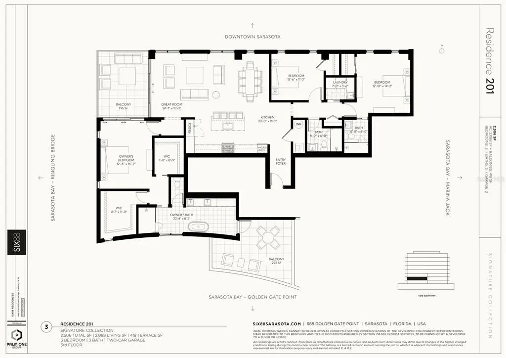Under Construction. Few addresses embody the prestige and enduring appeal of waterfront living like SIX88 Sarasota. Nestled along 80 feet of private shoreline in the coveted Golden Gate Point neighborhood, this boutique condominium offers just ten architecturally refined residences. Residence #201 is a 3-bedroom, 3-bath Signature Collection home featuring 2,088 square feet of interior space and 418 square feet of private balcony, with soaring ceilings and floor-to-ceiling windows that frame sweeping views of Sarasota Bay and the downtown skyline. A seamless indoor-outdoor flow, private oversized two-car garage with an optional lift system, and thoughtfully appointed finishes—Italian flat-panel cabinetry, large-format porcelain tile, recessed trim, and panel-ready stainless steel appliances—reflects the elevated design and exclusivity of this boutique waterfront residence. Amenities include a jetted swim spa pool, rooftop terrace, social lounge, fitness center, marina lounge with boat slips and paddleboard/kayak launch, and a dramatic lobby with cascading waterfall—all designed to deliver a refined, resort-style waterfront lifestyle. Under construction with delivery on schedule for Jan 2026 – we invite you to contact our sales team for a private hard hat tour and in-person appointment at our sales gallery conveniently located at 625 S Orange Ave to experience this extraordinary waterfront property firsthand. Visit Six88sarasota.