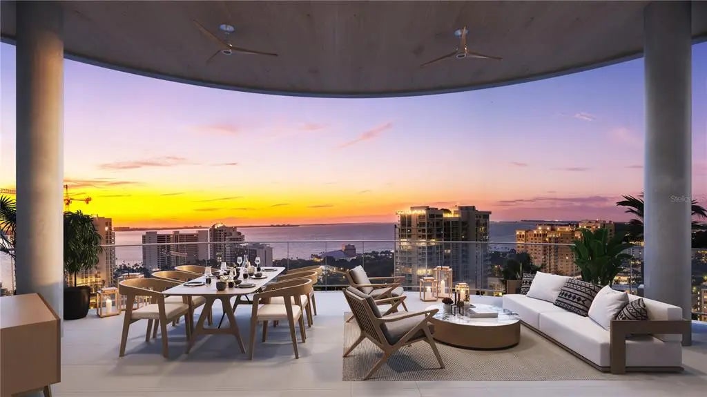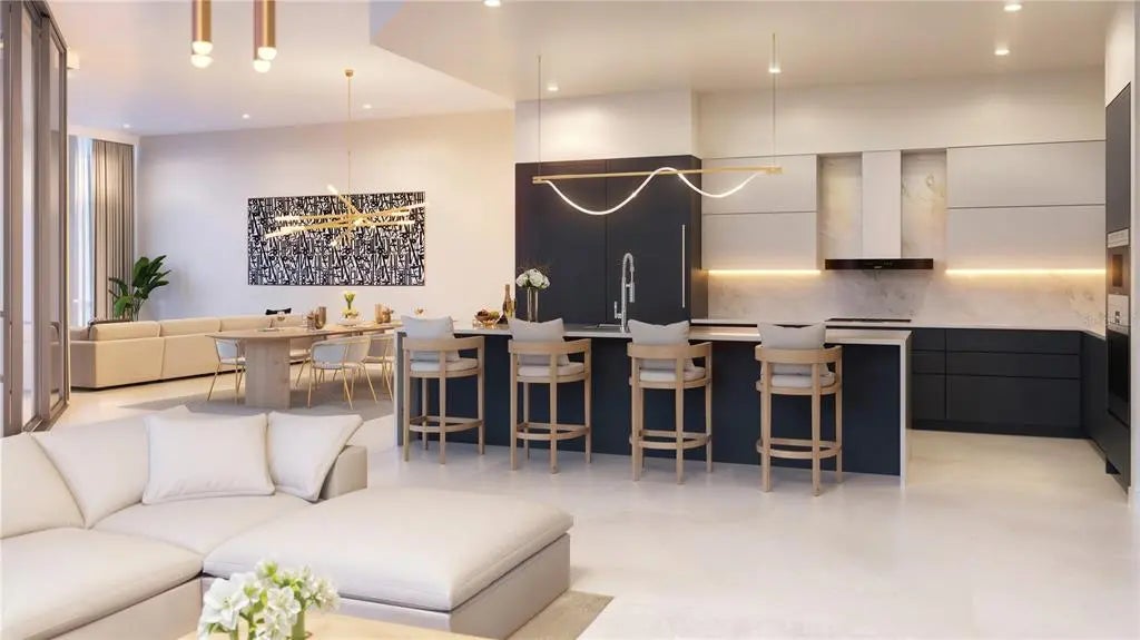 Under Construction. The Edge Sarasota embodies refined urban luxury in the heart of downtown’s vibrant Arts District. Residence B is an impeccably designed 3-bedroom, 3-bathroom corner residence offering over 3,500 square feet of living space, framed by floor-to-ceiling windows and sweeping city views from the 8th floor. The open-concept design features soaring ceilings, walls of glass and a chef’s kitchen with Italian cabinetry, Wolf and Sub-Zero appliances including a gas cooktop, an expansive island with waterfall edge and a butler’s pantry—all curated for elevated living. From the great room, dining or separate living room step out onto your private terrace and feel the energy of Sarasota below while enjoying the tranquility of your own modern sanctuary. The owners’ suite provides a true retreat with a gracious foyer, midnight bar, dual walk-in closets and en suite bathroom featuring dual vanities, private water closets, glass enclosed shower, soaking tub and convenient linen closet. A full laundry room with front-load washer and dryer and utility sink includes additional storage for ease of living. Beyond your residence, enjoy a curated collection of luxury amenities including a resort-style pool deck with hot and cold plunge pools, cabanas and two outdoor kitchens. The owners’ club focuses on wellness and entertainment with a fully equipped fitness center complete with a yoga room and infrared sauna. Two treatments rooms afford plenty of space for your personal massage therapist or a physical therapy session. The social room includes a lounge, bar, game room and catering kitchen. For more intimate gatherings, reserve the private dining room featuring resident wine lockers and a separate bar area. The building’s boutique size—only 27 residences—creates a community feel in the heart of Sarasota’s vibrant Arts District. Walk to acclaimed restaurants, galleries, boutiques, and the Bayfront, embracing a lifestyle that combines culture, convenience, and sophistication. Construction is progressing with limited opportunities to customize your finishes—secure your place at The Edge today and invest in a rare downtown Sarasota address with lasting appeal. Images shown are artist renderings intended to illustrate the interior finishes and design concepts for this community.