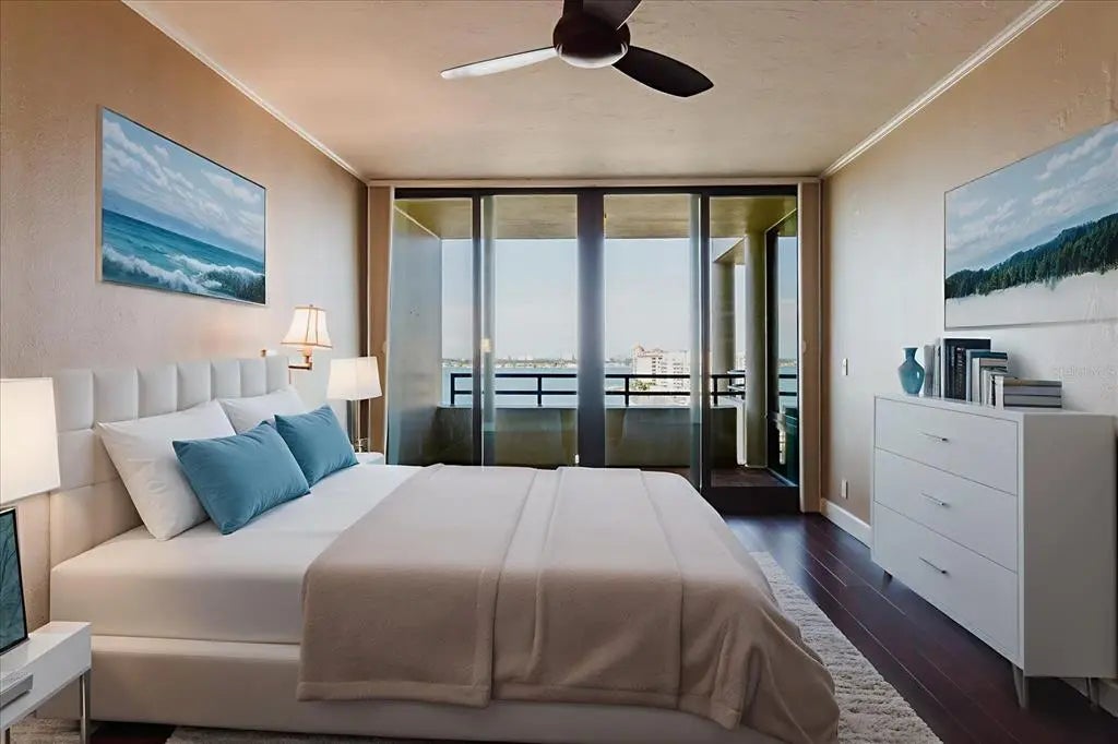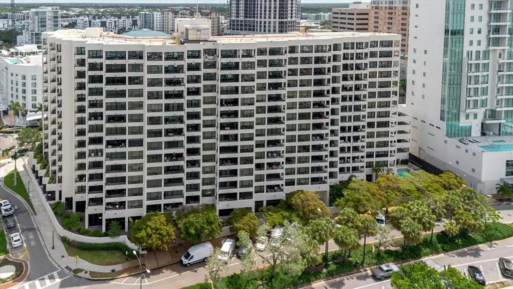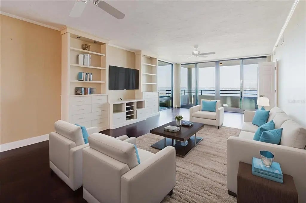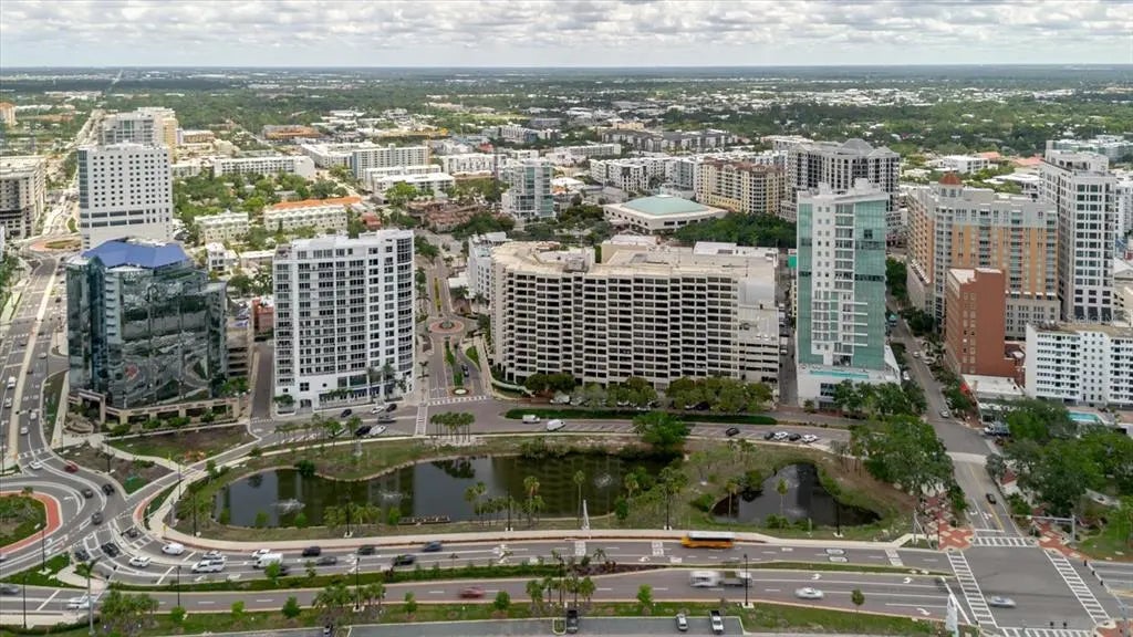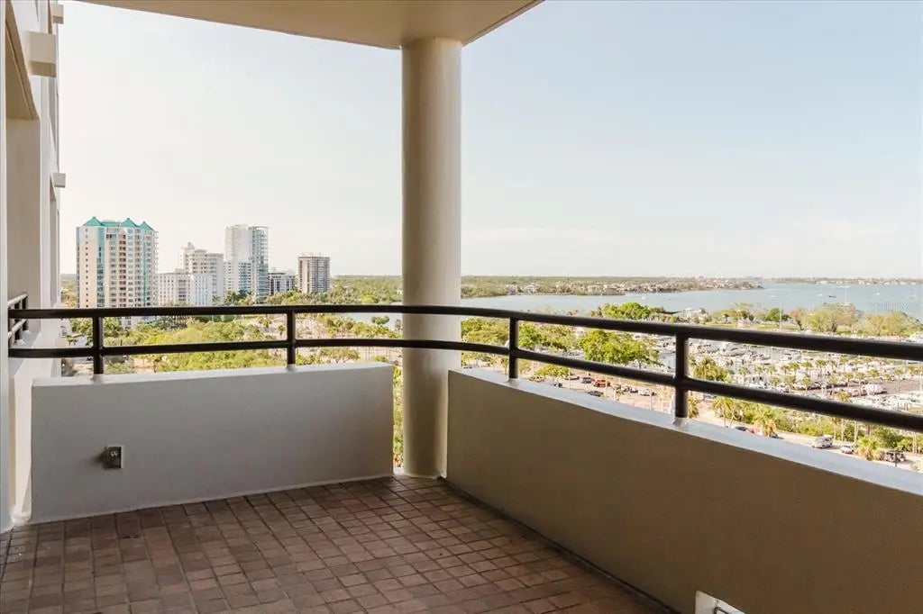 One or more photo(s) has been virtually staged. Experience luxurious downtown living from the 11th floor of the renowned Bay Plaza, offering sweeping, unobstructed views of Sarasota Bay. Perfectly positioned on Palm Avenue—between Main Street and Cocoanut Avenue—this iconic address puts you in the heart of it all. Bay Plaza delivers top-tier amenities including 24-hour concierge service, valet parking, a Contemporary lobby, well-equipped fitness center, library, and a media/meeting room. Relax poolside in the heated swimming pool and spa, or entertain outdoors using outdoor kitchen. Inside, this thoughtfully designed 2-bedroom, 2-bath home with an additional office space has been upgraded with new impact-rated sliding glass doors and windows, maximizing panoramic bay views from nearly every room. Brazilian cherry hardwood floors flow through the main living areas and bedrooms, setting a warm, elegant tone. The expansive great room opens onto a generous balcony—the perfect spot to catch unforgettable sunsets. The gourmet kitchen is a dream for any culinary enthusiast, featuring travertine marble flooring, granite countertops, custom walnut cabinetry, and premium appliances: KitchenAid refrigerator, double oven, Miele induction cooktop, Wolf microwave drawer, and a glass-door wine fridge. Retreat to a serene primary suite with its own private balcony, custom walk-in closets, and a spa-like en-suite bath showcasing designer porcelain tile, black granite counters, jetted soaking tub, walk-in shower with pebble stone flooring, and private commode. The guest suite offers a clever blend of style and function, with a queen Murphy bed, built-in shelving, and its own custom closet. The guest bath includes a glass-enclosed shower and in-unit washer/dryer setup. Known for its security and prestige, Bay Plaza is among the most desirable buildings in Sarasota. You’re steps away from world-class dining, entertainment, the opera, weekend farmers markets, Selby Gardens, and the vibrant Sarasota Bayfront. This is downtown waterfront living at its finest—don’t let this rare opportunity pass you by!