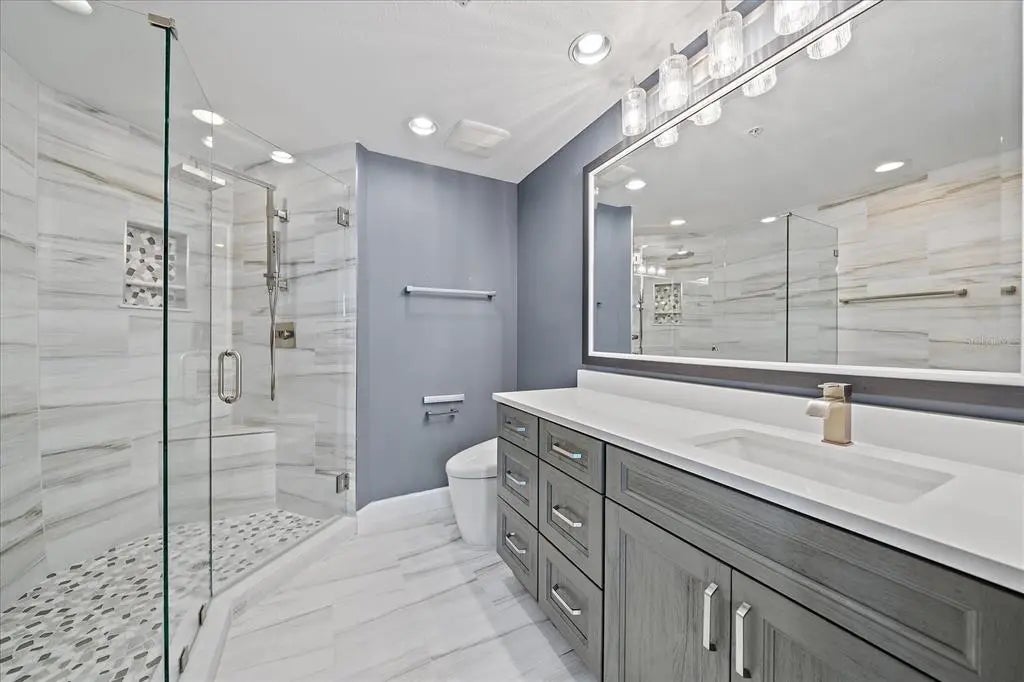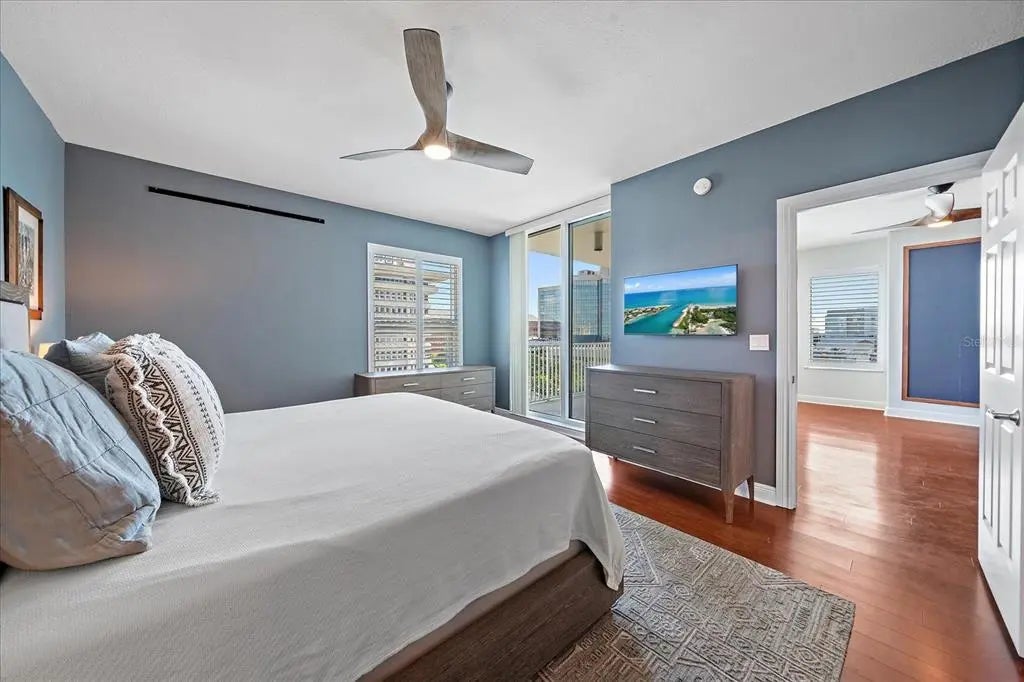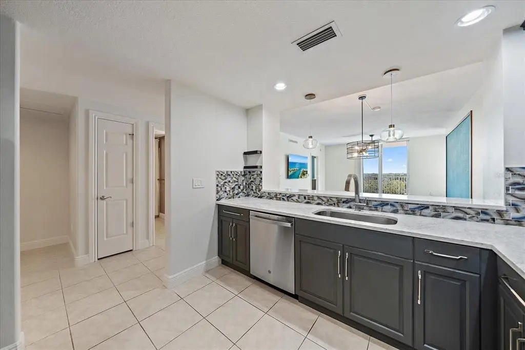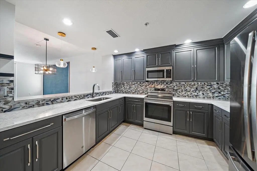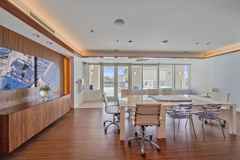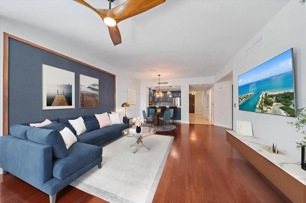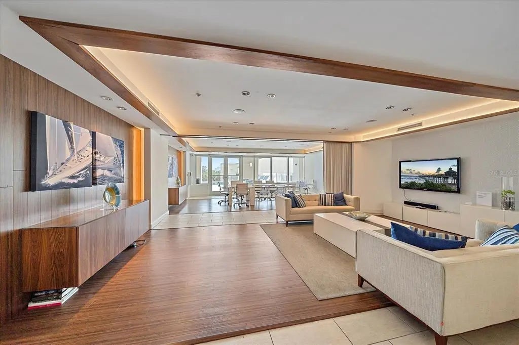 One or more photo(s) has been virtually staged. Rivo at Ringling rises as a beacon of contemporary sophistication in downtown Sarasota—a 16-story architectural statement completed in 2006 that artfully balances modern design with serene urban living. Encompassing just 106 private residences encircling a dramatic, light-filled atrium, it feels more like an exclusive vertical sanctuary than a downtown condominium. Within this coveted address, Residence #703 has been meticulously redesigned and refined to capture the essence of effortless luxury. The 2-bedroom, 2-bath layout—complemented by a custom, flexible-use den—embodies both artistry and functionality. The chef’s kitchen gleams with bespoke, stacked cabinetry painted to accentuate height and light, while quartz surfaces flow seamlessly into a full-height backsplash that reads more as sculpture than surface. Stainless steel appliances and designer lighting complete the composition, setting an elegant tone that continues throughout the open living and dining space. Expanses of glass invite the outdoors in, framing the city skyline and drawing the eye to an oversized, north-facing 20×9-foot terrace—an alfresco retreat ideal for morning espresso or evening reflections, where Sarasota Bay glimmers faintly on the horizon. The primary suite extends an aura of quiet indulgence. Its spa-inspired ensuite showcases a frameless glass shower, couture tilework, custom cabinetry, and statement lighting that transforms routine into ritual. Plantation shutters filter the Florida sunlight, while direct terrace access and a well-appointed walk-in closet complete the tranquil scene. A split-bedroom layout ensures privacy for guests, while the generous den serves equally well as a study, media lounge, or third sleeping space—ideal for those balancing leisure and productivity. The secondary bath, with its elevated finishes and artful detailing, reinforces the home’s cohesive sense of design. Practical touches underscore the thoughtful craftsmanship throughout: a separate, exterior AC handler closet maximizes interior peace and utility, enhanced with a UV light system to promote cleaner air and additional storage for travel essentials. Beyond the residence itself, Rivo at Ringling distinguishes itself with offerings rarely found in downtown living: two oversized, under-building parking spaces within a gated garage, a private storage room, secure bike and kayak storage, and convenient EV charging stations. The amenity collection evokes the feel of an intimate resort—concierge services, a heated pool and spa with sun deck, a covered grill terrace, a state-of-the-art fitness center, and sophisticated social lounges. A fully funded reserve, flexible rental policy, and pet-friendly ethos enhance both livability and long-term value, while dedicated on-site management ensures a seamless experience. Step outside and Sarasota’s cultural heartbeat unfolds within moments—acclaimed dining, the opera, theaters, live music, art galleries, and the Bayfront promenade, all effortlessly accessible. For the discerning buyer who values artistry in both design and lifestyle, Residence #703 delivers a rare balance of elevated interiors, turnkey convenience, and a quintessential downtown address—complete with both bedrooms fully furnished for a move-in-ready transition. At Rivo, sophistication meets serenity—a modern reprieve in the rhythm of the city.