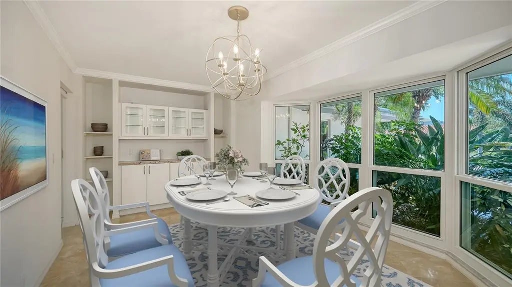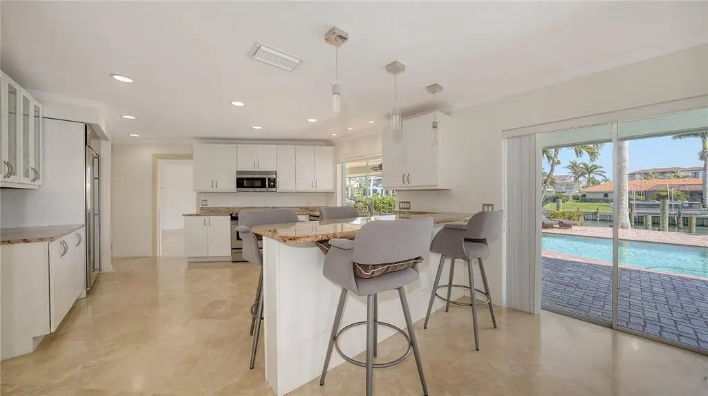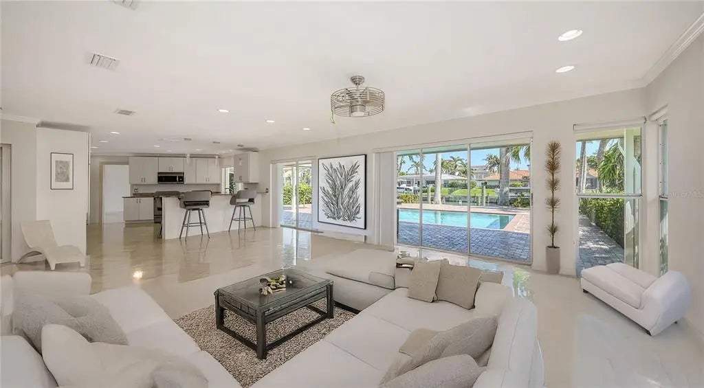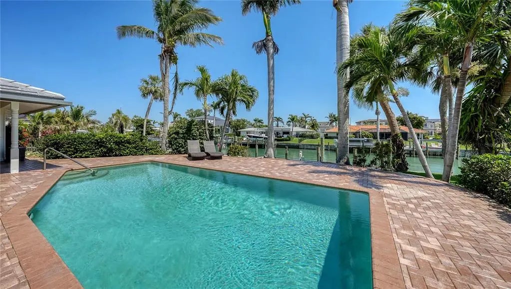 One or more photo(s) has been virtually staged. Perfectly positioned on deep canal waters just moments from Sarasota Bay, this Bird Key residence captures the essence of relaxed coastal living. Set on a generous lot and framed by tropical landscaping, this home blends privacy with proximity to Sarasota’s vibrant downtown and waterfront destinations. A circular brick-paver driveway leads to the welcoming front entry, while a brand-new roof (2024) offers peace of mind. Inside, more than 2,400 square feet of light-filled living space unfolds across an open, thoughtfully designed floorplan. Neutral oversized tile flooring flows throughout the main living areas, unifying the open-concept kitchen, family room, and dining spaces. The kitchen boasts granite countertops, sleek cabinetry, stainless steel appliances, a breakfast bar, and expansive counter space—ideal for both daily living and effortless entertaining. Walls of sliding glass doors extend the living area out to the screened lanai, where a covered lounge and pavered deck frame the sparkling pool. The residence features three spacious bedrooms, including a private primary suite with large walk-in closet and a en-suite bathroom. The home’s split-bedroom layout ensures comfortable accommodations for guests, while ample storage and a generous laundry area add everyday functionality. A newly rebuilt seawall (2022) and deep-water dock provide direct access to Sarasota Bay, making this a true boater’s retreat. Enjoy morning coffee or sunset cocktails with tranquil canal views just steps from your back door. Bird Key is one of Sarasota’s most sought-after neighborhoods, prized for its central location, manicured streets, and strong sense of community. Residents enjoy proximity to the Bird Key Yacht Club, with optional membership for boating, tennis, fitness, and dining. Just minutes away are the world-class shopping and dining of St. Armands Circle, pristine beaches of Lido and Longboat Key, and Sarasota’s thriving arts and cultural district. This residence offers an opportunity to live on the water with generous indoor and outdoor spaces—perfect for savoring the Florida lifestyle in style and comfort.