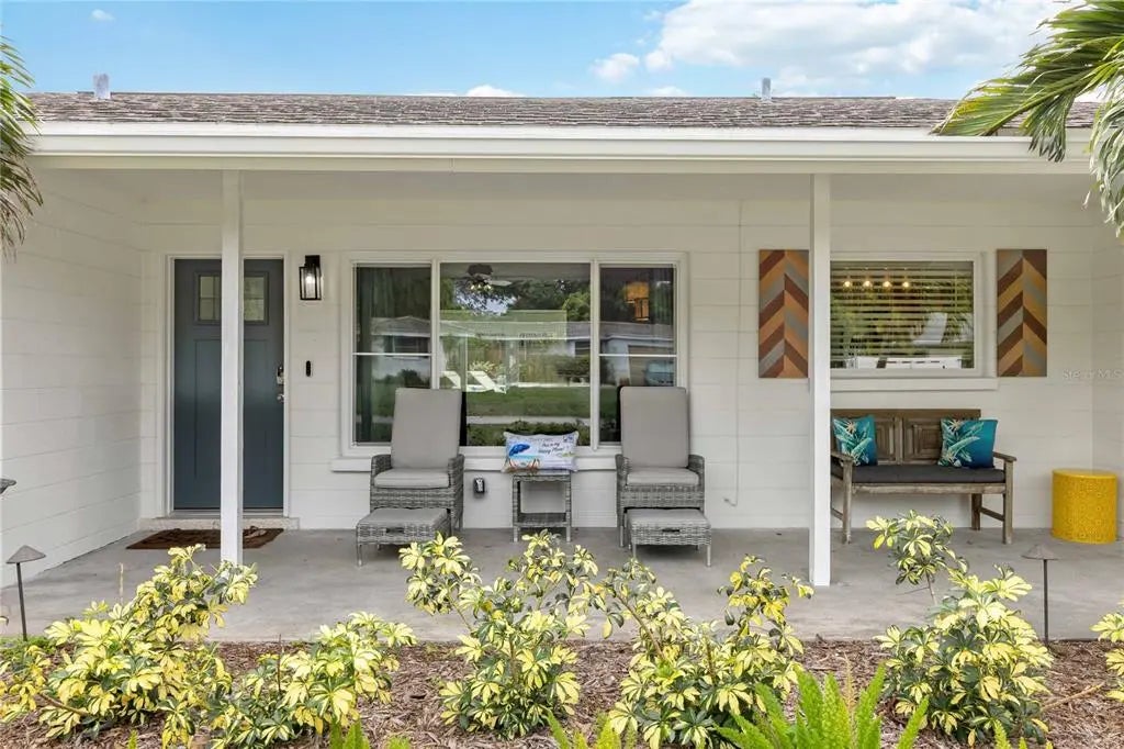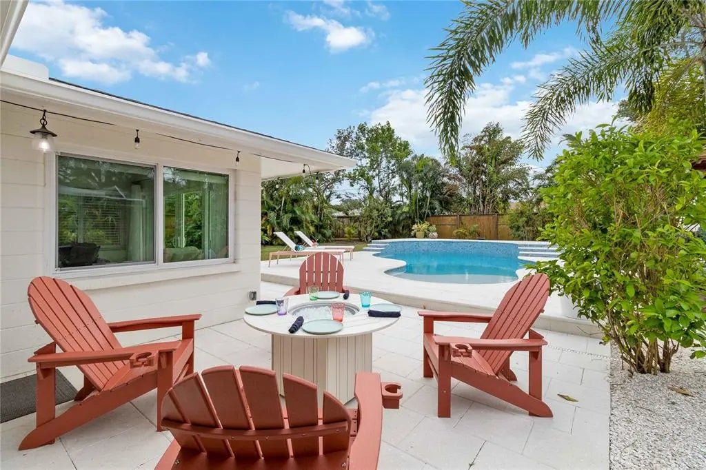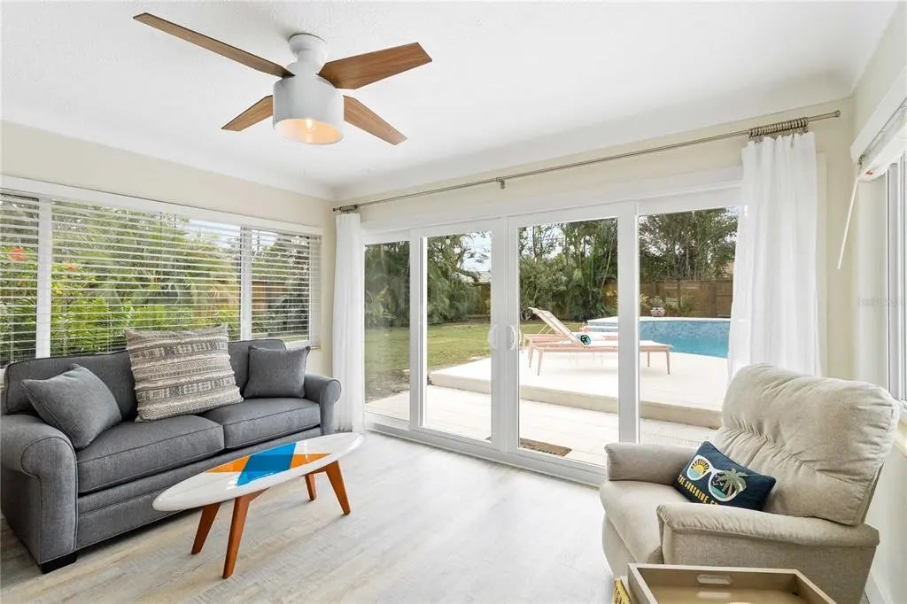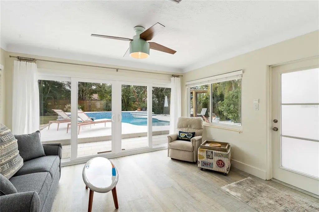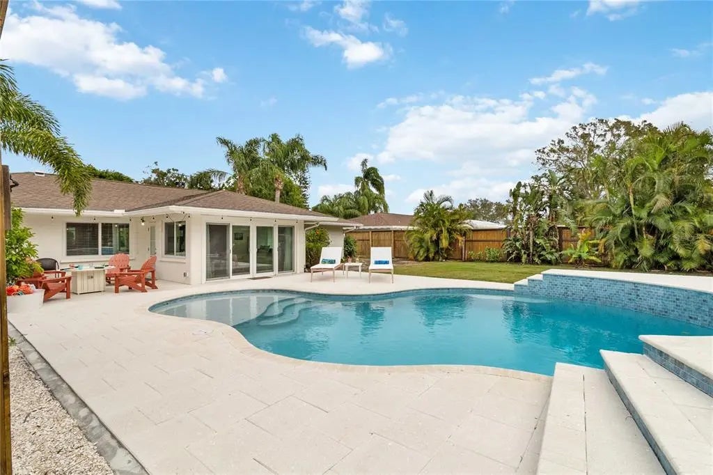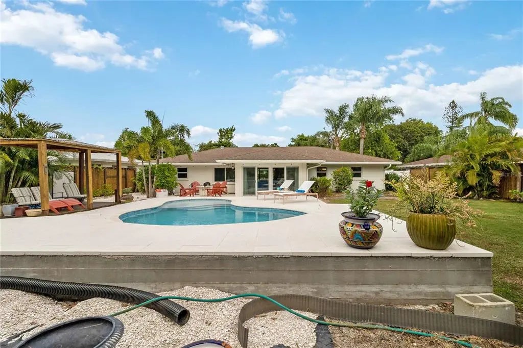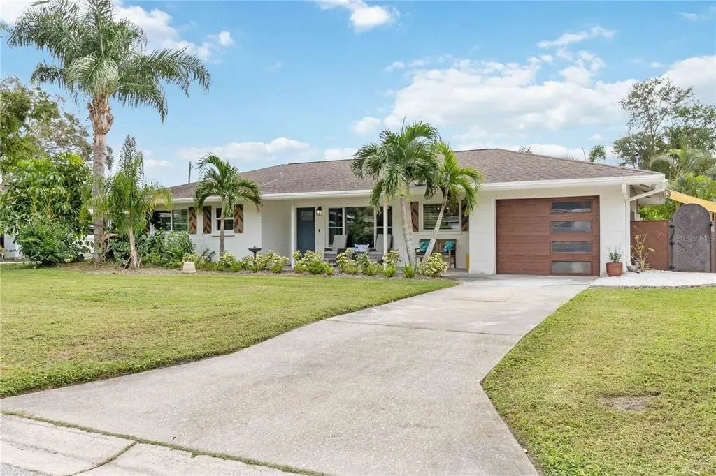 NEW ROOF & HURRICANE WINDOWS. This Southside area home is completely move-in ready and boasts significant updates throughout. Situated on a large, private, fenced lot, offering wonderful outdoor space complete with a heated "Resort Style" Saltwater Pool and Patio; Perfect for relaxing and entertaining. This 1436 sf home offers two bedrooms, two full bathrooms, a one-car garage, and a separate family room that provides tropical views of the landscaped pool area. The backyard has room for an additional Master Suite or Accessory Dwelling Unit. The updates are extensive and include a new roof, HVAC system, hurricane impact doors, windows, & garage door ensuring peace of mind. The primary bathroom and kitchen have been beautifully updated with quartz countertops and glass front cabinets, a new range, dishwasher, and water heater. You'll also appreciate the premium vinyl wood plank flooring throughout, the recently painted interior and exterior, new spray foam insulation, new PEX plumbing to all fixtures, and professional outdoor drainage. Manufacturers warranty & extended home warranty are transferable or included. The 10x14 air-conditioned laundry room and additional flex/office space is a bonus feature not to miss. For those seeking an investment opportunity, this home has a proven $30K + short-term rental history when the owner was not in town. It's located in the highly desirable heart of Sarasota, offering an easy drive to Siesta Key Beach, biking on The Legacy Trail, Arlington Park, and Downtown Sarasota's restaurants and Main Street stores. Best of all, there are no CDD or HOA fees.