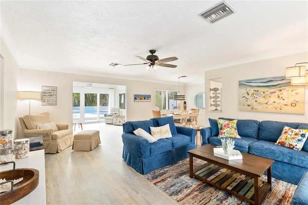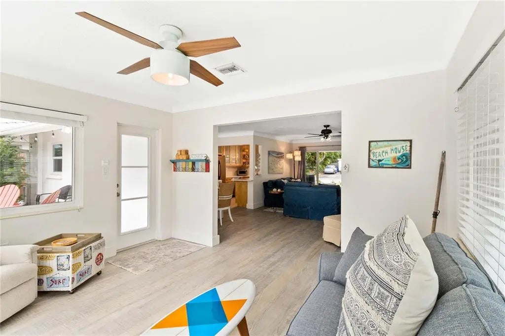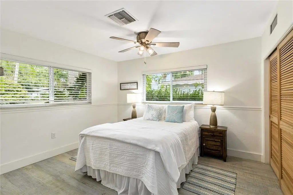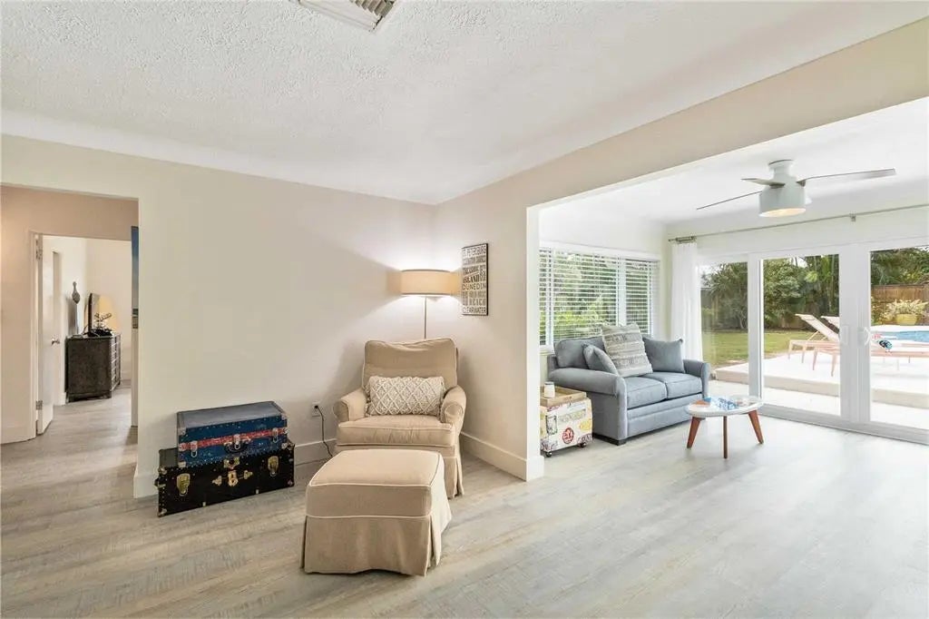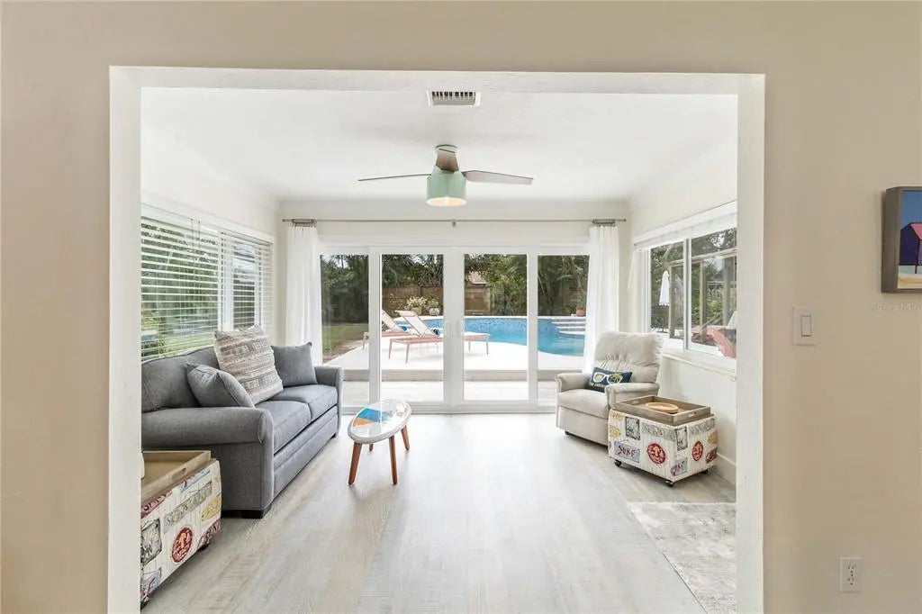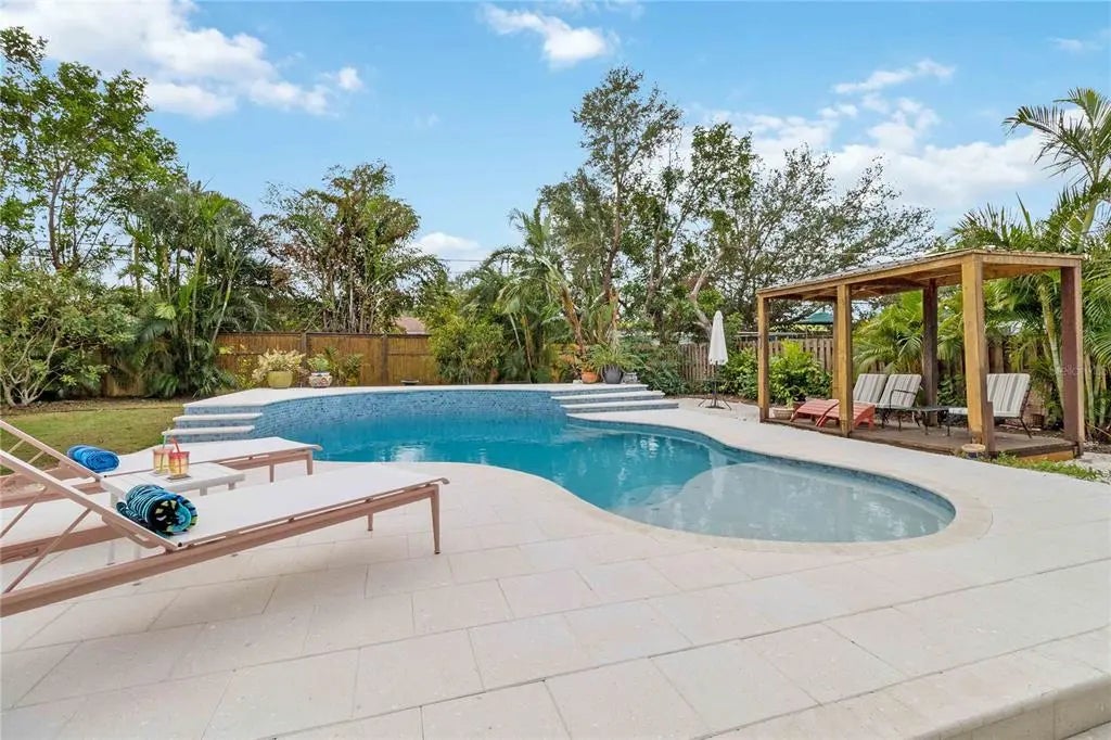 NEW ROOF & HURRICANE WINDOWS. This Southside area home is completely move-in ready and boasts significant updates throughout. Situated on a large, private, fenced lot, offering wonderful outdoor space complete with a heated "Resort Style" Saltwater Pool and Patio; Perfect for relaxing and entertaining. This 1436 sf home offers two bedrooms, two full bathrooms, a one-car garage, and a separate family room that provides tropical views of the landscaped pool area. The backyard has room for an additional Master Suite or Accessory Dwelling Unit. The updates are extensive and include a new roof, HVAC system, hurricane impact doors, windows, & garage door ensuring peace of mind. The primary bathroom and kitchen have been beautifully updated with quartz countertops and glass front cabinets, a new range, dishwasher, and water heater. You'll also appreciate the premium vinyl wood plank flooring throughout, the recently painted interior and exterior, new spray foam insulation, new PEX plumbing to all fixtures, and professional outdoor drainage. Manufacturers warranty & extended home warranty are transferable or included. The 10x14 air-conditioned laundry room and additional flex/office space is a bonus feature not to miss. For those seeking an investment opportunity, this home has a proven $30K + short-term rental history when the owner was not in town. It's located in the highly desirable heart of Sarasota, offering an easy drive to Siesta Key Beach, biking on The Legacy Trail, Arlington Park, and Downtown Sarasota's restaurants and Main Street stores. Best of all, there are no CDD or HOA fees.