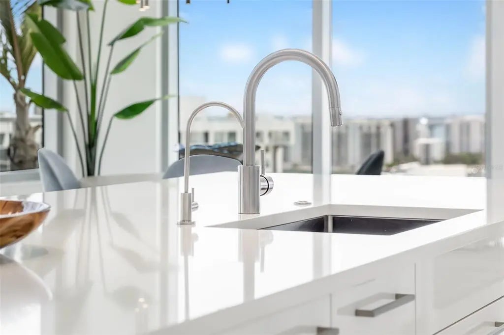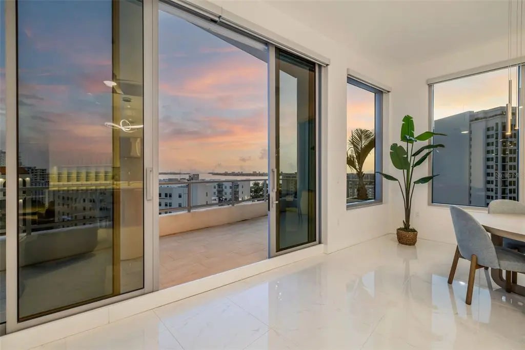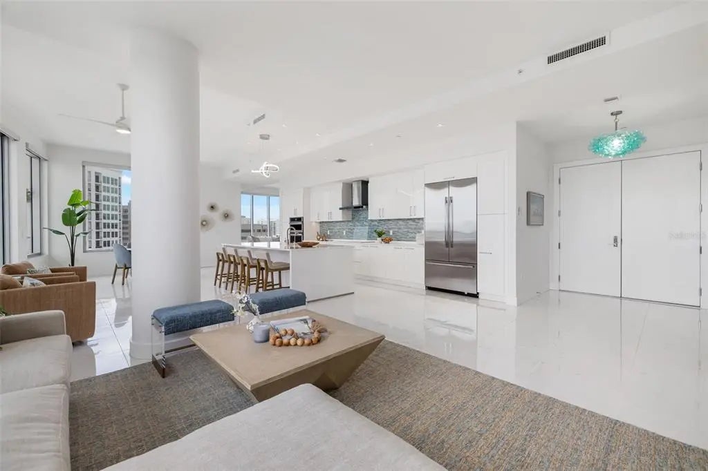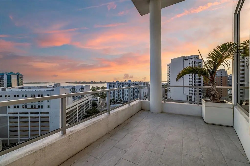 Rare penthouse offering at Mark Sarasota. 111 S Pineapple Ave. #1204 is a one-of-a-kind 12th-floor residence and the largest home in the building, offering 2,845 square feet under air and over 3,600 square feet of total living space including a spacious wraparound covered terrace with uninterrupted views of Sarasota Bay. From the moment you go inside, you’re greeted by 11-foot ceilings, double 8-foot entry doors, and expansive 10-foot impact-rated sliding glass doors that blur the line between indoors and out. Gleaming 24-inch white polished porcelain tile floors run throughout the open-concept interior, where a thoughtfully designed layout integrates the living, dining, and family spaces with a chef-caliber kitchen—complete with high-gloss European cabinetry, quartz countertops, and a suite of premium Jenn-Air stainless steel appliances including a 42-inch built-in refrigerator, convection wall oven, and 36-inch induction cooktop. The primary suite is a private oasis, offering panoramic views, dual walk-in closets by California Closets, and a spa-inspired en-suite bath with double vanities, an oversized walk-in shower, deep soaking tub and sleek Grohe fixtures. Two generous guest suites, each with private baths, custom closets and blackout shades, provide comfort and privacy for visitors or family. Additional interior highlights include a convenient and spacious family room/den, automated roller shades throughout with blackout shades in all bedrooms, a full laundry room with custom cabinetry and Whirlpool HE washer and dryer, water filtration and softener systems for the entire residence, and four deeded garage parking spaces plus a same-floor oversized private storage unit. The wraparound covered terrace is an entertainer’s dream with commanding views of the water and city skyline. Enjoy alfresco dining at the built-in outdoor kitchen, equipped with an electric grill, under-counter refrigerator, stone countertops, and durable exterior cabinetry. Residents of The Mark enjoy exceptional lifestyle amenities including 24-hour concierge service, a resort-style heated saltwater pool and spa, state-of-the-art fitness center with a dedicated spin room, a club room with catering kitchen, fireplace and billiards, as well as outdoor lounging areas with fire pits, grills, and dining spaces—all just steps from Whole Foods, Bayfront Park, shopping, dining, galleries and Sarasota’s renowned cultural venues. This rare penthouse opportunity places you in the heart of downtown Sarasota’s most desirable address, where convenience, comfort and coastal elegance converge.