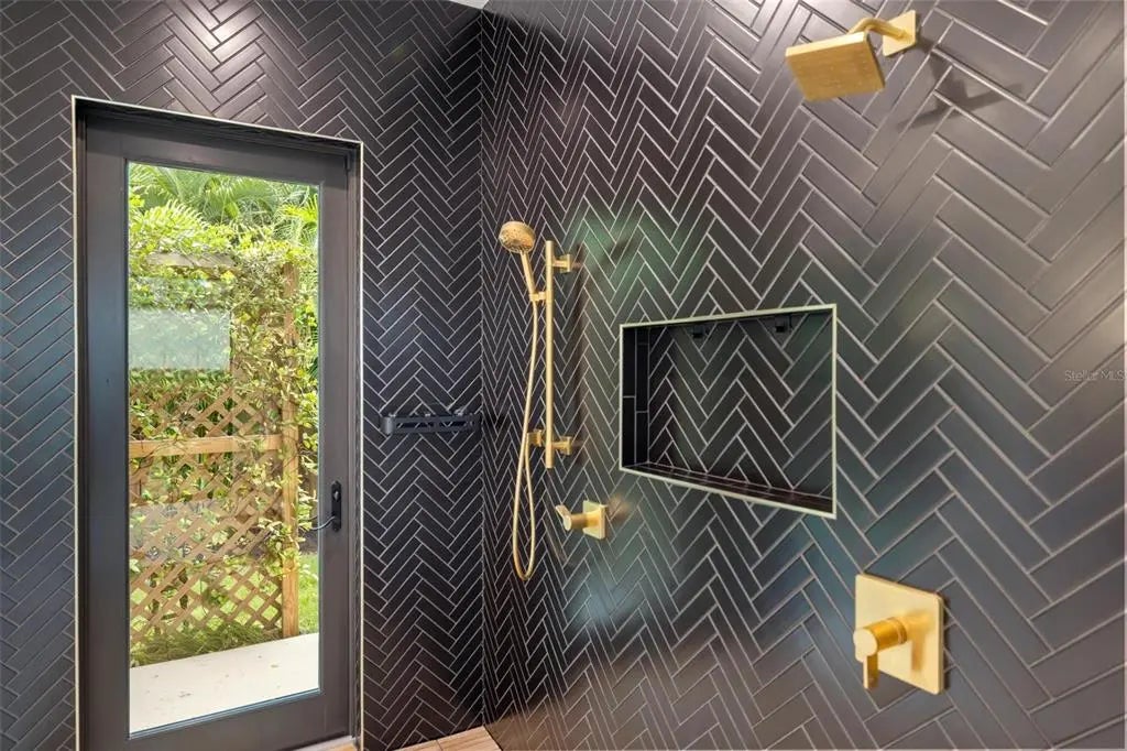 - Exterior FeaturesCourtyard, Irrigation System, Lighting, Outdoor Kitchen, Outdoor Shower, Private Mailbox, Rain Gutters, Sliding Doors