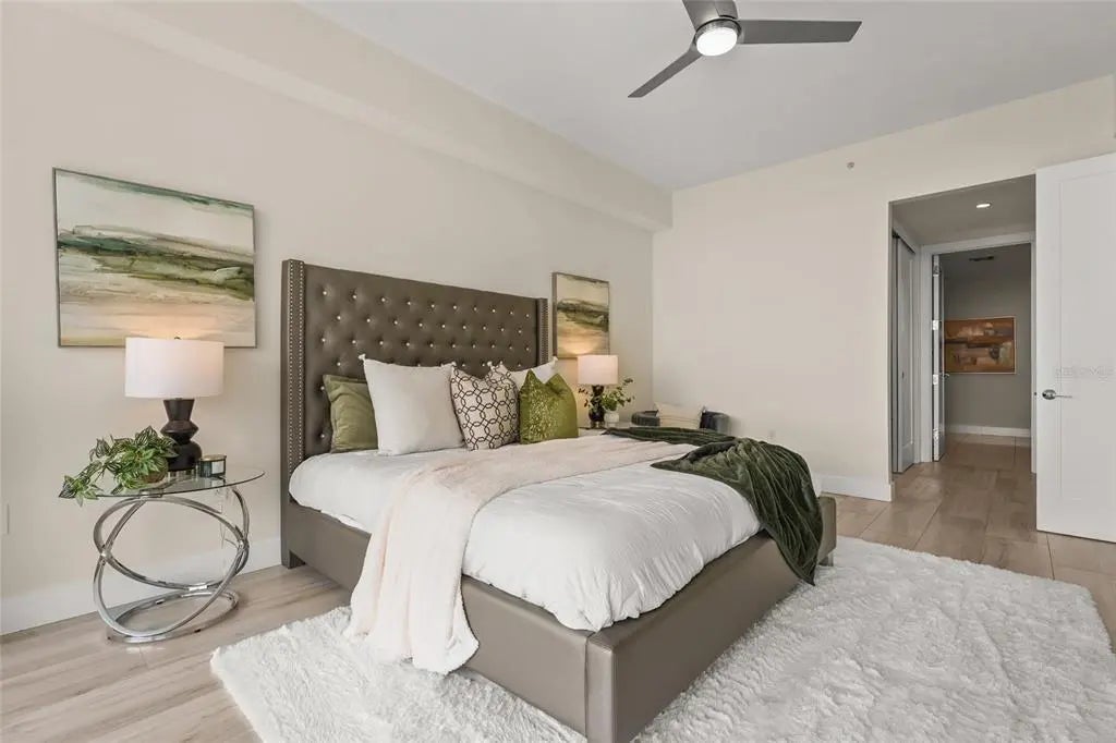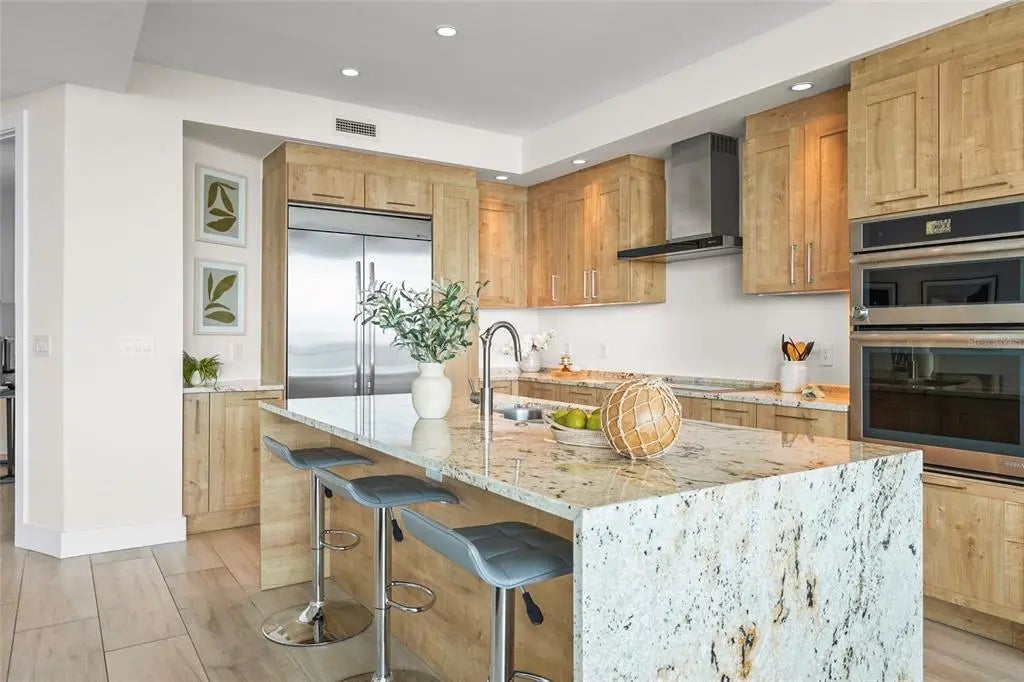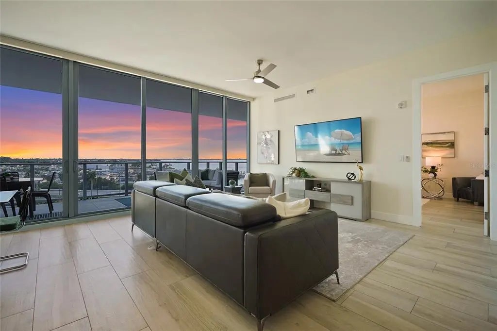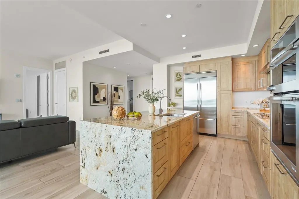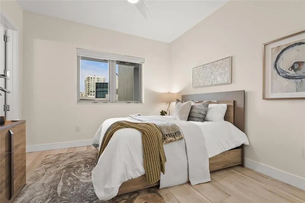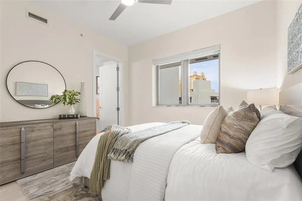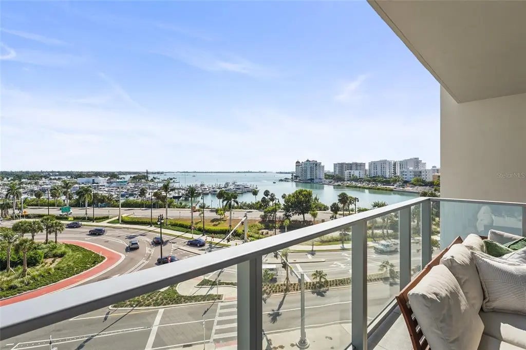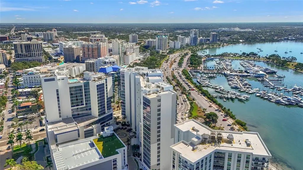 Welcome to The VUE Sarasota Bay, where modern luxury meets the heartbeat of downtown Sarasota. Perfectly positioned on the bayfront, this iconic tower is known for its sleek design, resort-style amenities, and unmatched convenience to Sarasota’s most celebrated destinations. Step outside and stroll to the Ritz-Carlton Spa, or enjoy dinner just across the street at Ocean Prime, Marina Jack, or the vibrant cafés and galleries that make this area the most walkable pocket of the city. Inside this elegant residence, you’ll immediately feel a sense of calm and refinement. Clean lines, soft tones, and designer finishes create an upscale yet inviting atmosphere. The open-concept kitchen showcases a large quartz waterfall island, premium appliances, and tile flooring throughout that flows seamlessly from room to room. Impact-rated windows surround the living space, filling the home with natural light while offering panoramic city and water views that truly embody why this building is called The VUE. The primary suite has been thoughtfully updated with a brand-new custom closet, while automated privacy blinds add effortless sophistication. Step out to one of the largest balconies in the building, an ideal setting for morning coffee or evening sunsets over the bay. Additional features include a semi-private elevator entrance, a spacious in-unit laundry room, and two secure parking spaces. Residents of The VUE enjoy 24-hour concierge service, valet parking, a heated pool and spa, fitness center, club lounge, and the peace of mind that comes with luxury living done right. From the moment you arrive, you’ll understand why The VUE remains the premier address for those seeking the very best of downtown Sarasota living.