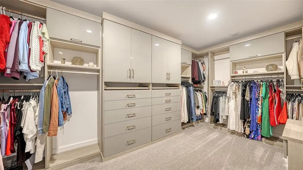 - Interior FeaturesCeiling Fan(s), Eating Space In Kitchen, Elevator, High Ceilings, Living Room/Dining Room Combo, Open Floorplan, Primary Bedroom Main Floor, Smart Home, Solid Surface Counters, Solid Wood Cabinets, Split Bedroom, Stone Counters, Thermostat, Walk-In Closet(s), Window Treatments
