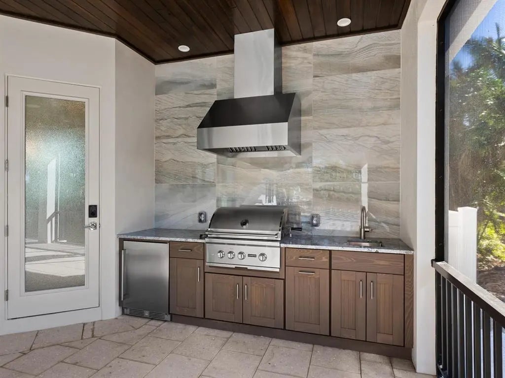 - Exterior FeaturesIrrigation System, Outdoor Kitchen, Rain Gutters, Sidewalk, Sliding Doors
