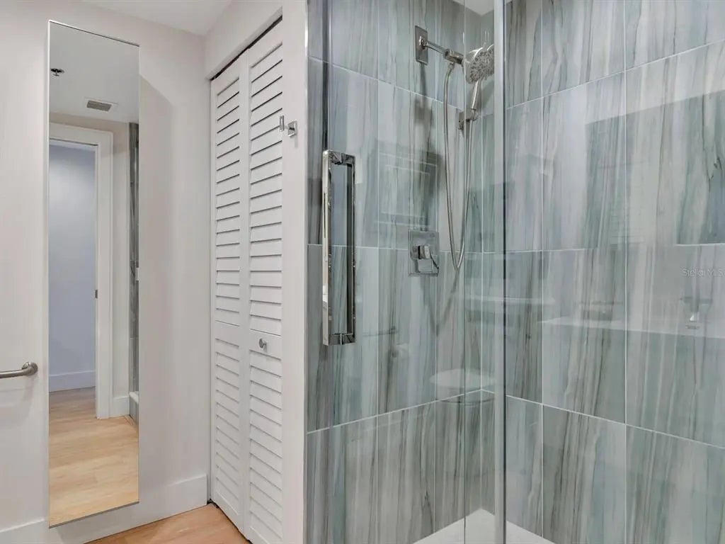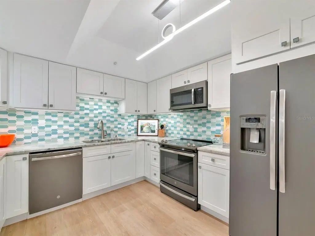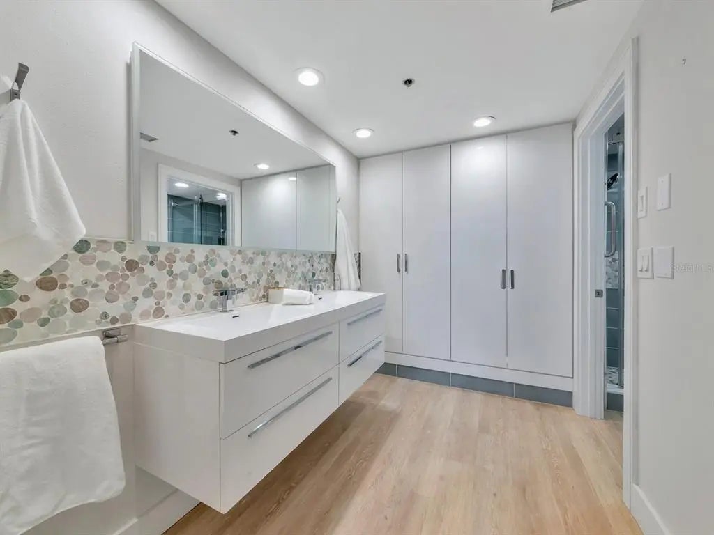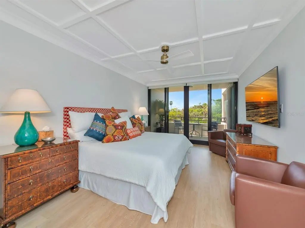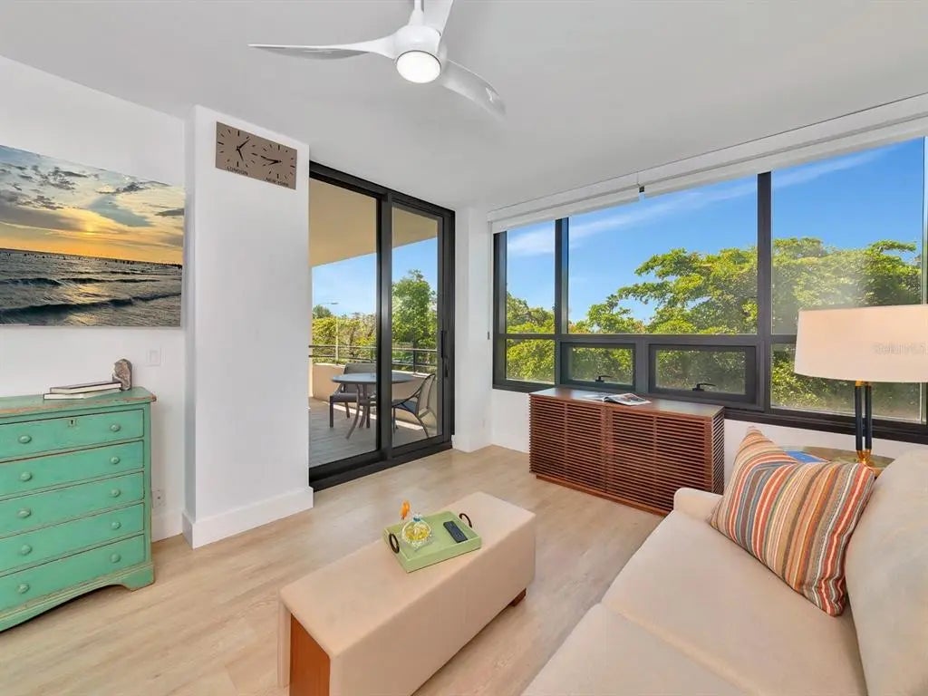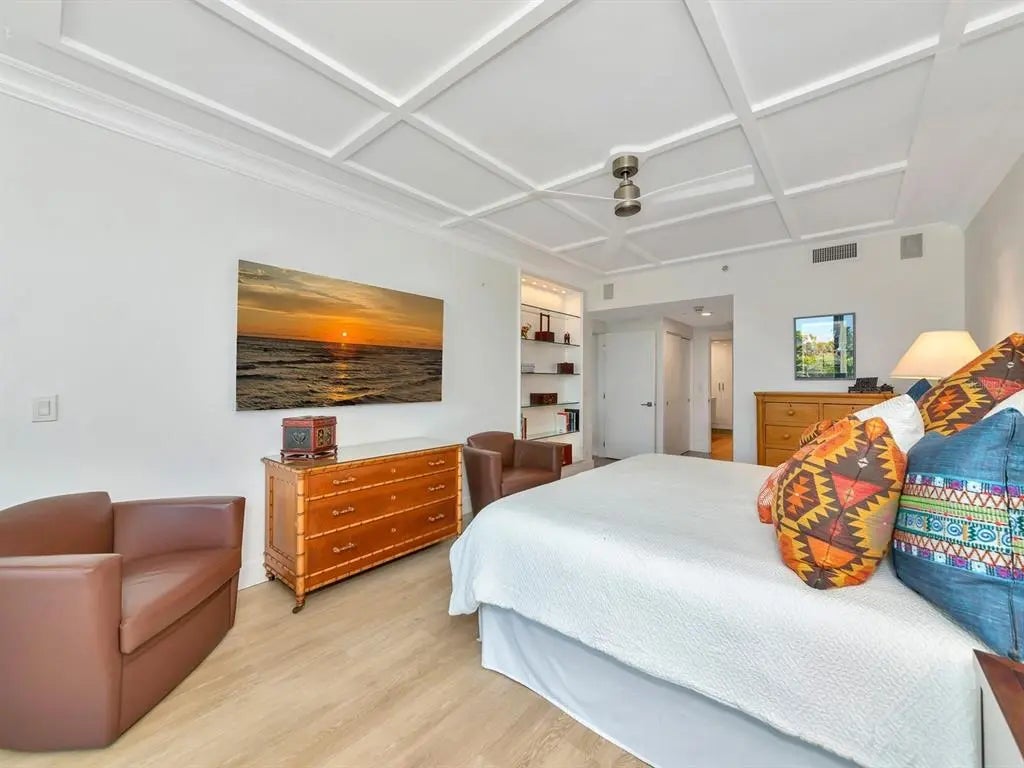 One or more photo(s) has been virtually staged. This downtown Bay Plaza residence combines tranquility & urban convenience, creating a serene, treehouse-like atmosphere. The upgraded coastal style enhances the overall experience, boasting charming fixtures & modern finishes. Situated on the second floor, it provides a secluded retreat from the city's hustle & bustle. Savor the gentle rustling of the wind through the trees that line the street below. A beautifully remodeled floor plan features an airy main living space, two tree-top tiled balconies that offer glimpses of water views, & two primary suites, each with its own bath & walk-in closets designed with built-ins. The foyer is open to the dining room, showcasing an expanded footprint with a console table area plus cleverly concealed closet & mechanical access. The handcrafted walls seamlessly extend into the living room, where a lovely built-in media center highlights the elegance of the shiplap throughout the main living space. The luxury vinyl tiles perfectly accentuate every room. A serving bar between the living & formal dining enhances the flow of entertainment. A hand-painted glass chandelier provides ample lighting for a generously sized table, offering plenty of room for dinner parties with at least ten guests. The wonderfully updated kitchen has striking natural stone countertops, a stylish glass-tiled backsplash, & soft-close shaker-style cabinetry, all illuminated by stunning LED lighting. The appliances that have a fingerprint-resistant finish remain. There's a delightful area for casual dining that can double as a versatile home office with its own entrance. The Owner’s Retreat is adorned with coffered ceilings, two walk-in closets, & its own balcony with ceiling-to-floor glass doors. You'll love the en suite bath, which boasts a spacious double floating vanity with a backlit mirror, a separate shower & a Toto toilet in the water closet. New cabinetry adds stylish storage along one wall. The split plan layout separates this suite from the secondary primary, featuring its own high-end finishes, a convenient laundry closet, & access to the main balcony. This residence also includes generous storage & new electronic roll-down shades that provide complete privacy. Bay Plaza is a coveted building situated in downtown Sarasota, recognized as Florida’s cultural & creative coast. Designed by the renowned architect Tim Siebert, it offers immediate access to the heart of the city. Residents have access to a range of amenities, including 24/7 valet parking, a full-service concierge, EV charging stations, & around-the-clock services. A parking garage with assigned parking for one car adds peace of mind. The recent installation of impact-resistant glass enhances both safety & style. You can relax in the heated pool or spa, & stay fit in the state-of-the-art fitness center, which features a sauna & steam room. The spacious lobby includes a grand piano, a media room, & a library, creating an atmosphere of luxury & sophistication. The condominium is conveniently situated near the Opera House, the farmers' market, art galleries on Palm Ave., & a variety of trendy & bay-view restaurants. You will be surrounded by boutique shopping, Whole Foods, & local theaters, all within moments of the vibrant cultural scene. Enjoy spectacular 4th of July fireworks at Marina Jacks from your own balcony. This is an exceptional opportunity located just minutes from St. Armands Circle, Longboat Key, & local beaches.