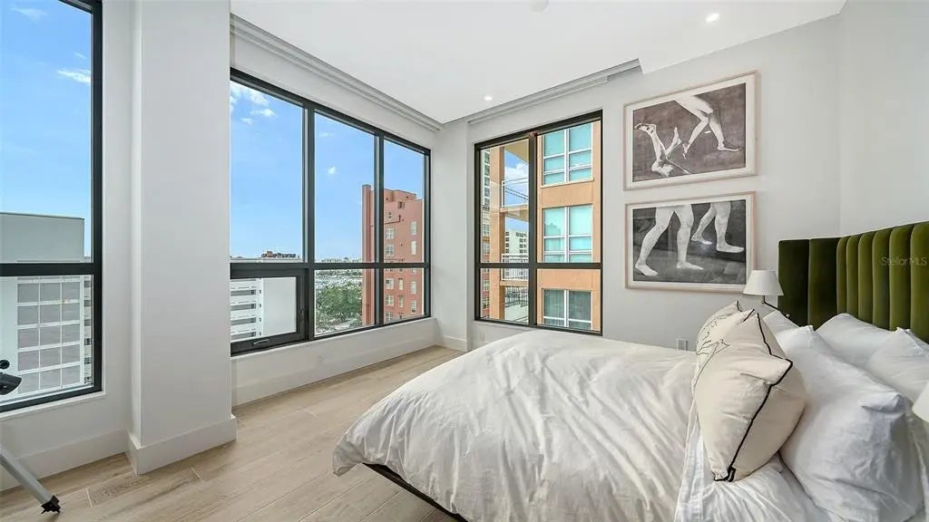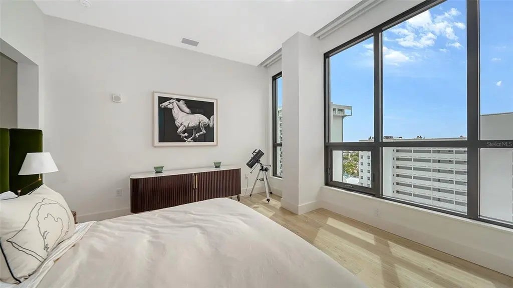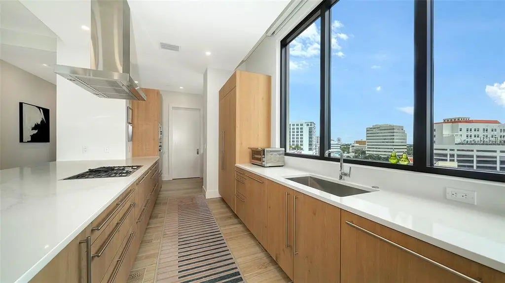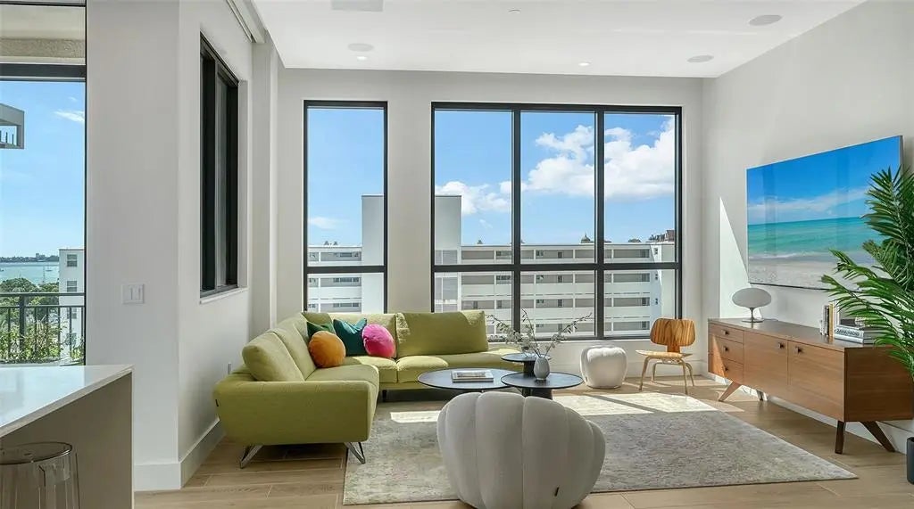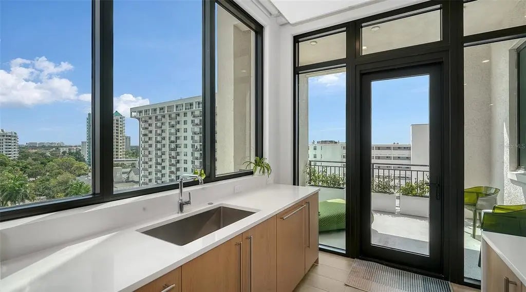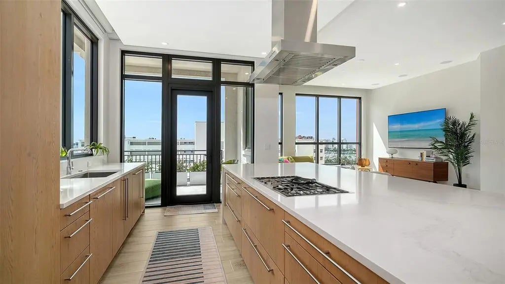 Situated in the cultural core of downtown Sarasota and completed in 2024, this 3-bedroom, 3.5-bath residence is impeccably maintained, and captures a rare blend of refined design and effortless downtown living. Bathed in natural light and defined by clean architectural lines, it’s a home that celebrates both art and simplicity, while placing the city’s vibrant rhythm at your doorstep. With 11-foot ceilings, expansive walls ideal for displaying artwork, and partial water views from the terrace, the main living space, and owner’s suite, the interiors feel open, tranquil, and beautifully composed. The chef’s kitchen—featuring Miele appliances, a gas cooktop, a waterfall island, custom Italian cabinetry, and a walk-in pantry—blends precision and beauty in equal measure. Windows above the sink welcome natural light and offer a serene view of tree-lined Palm Avenue, while the adjacent terrace is perfect for morning coffee or sunset cocktails. Well-curated fixtures, Lutron shades throughout, integrated surround sound, and a bespoke owner’s closet highlight the home’s thoughtful design. Included are two EV-ready parking spaces and a separate temperature-controlled storage space. Residents enjoy 24-hour staffed service and an 18th-floor rooftop amenity level with a fitness center, elegant club room, and saltwater pool—each with panoramic city and bay views, creating a peaceful oasis above the lively city below.