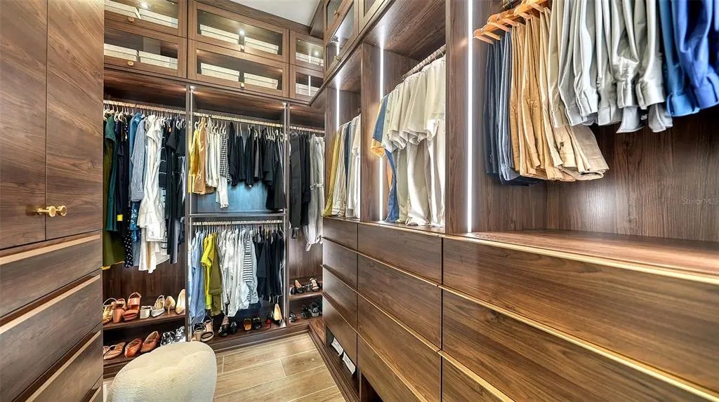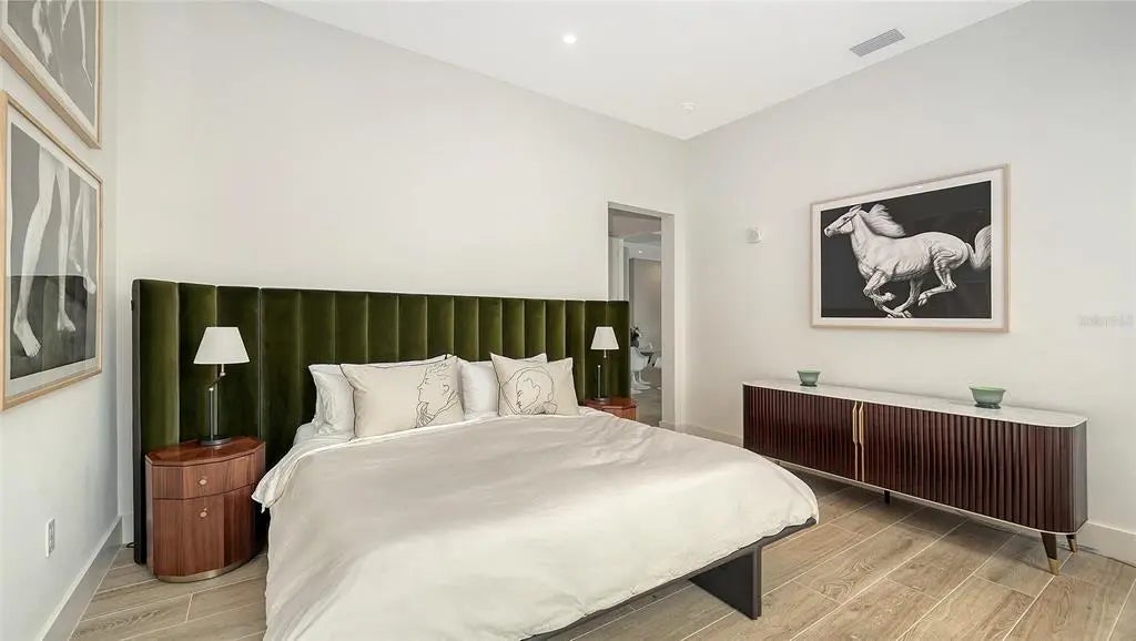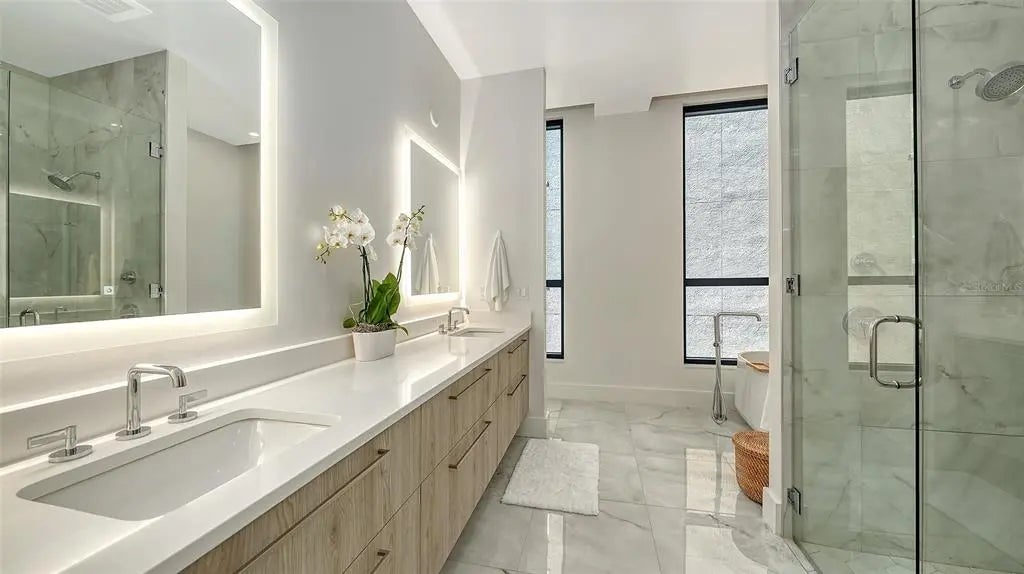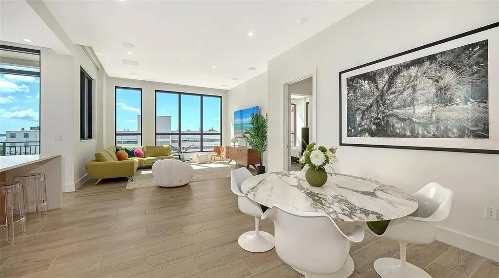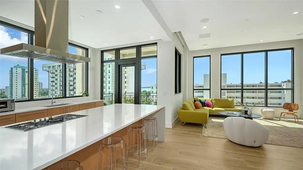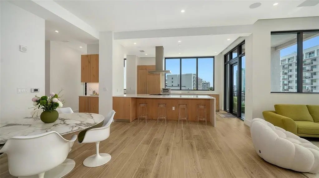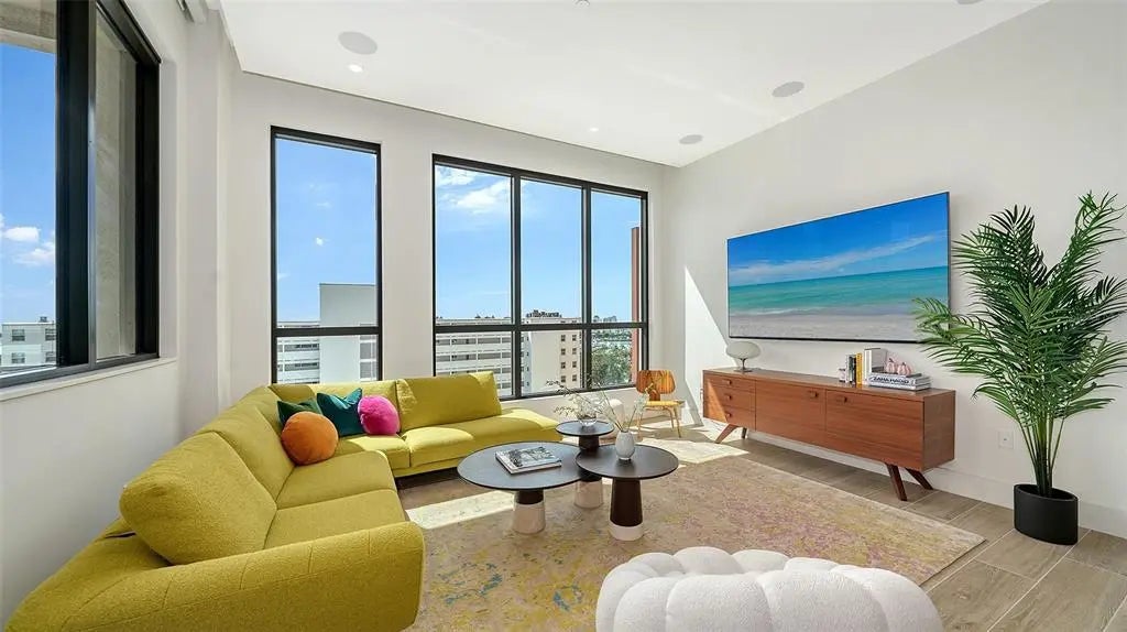Situated in the cultural core of downtown Sarasota and completed in 2024, this 3-bedroom, 3.5-bath residence is impeccably maintained, and captures a rare blend of refined design and effortless downtown living. Bathed in natural light and defined by clean architectural lines, it’s a home that celebrates both art and simplicity, while placing the city’s vibrant rhythm at your doorstep. With 11-foot ceilings, expansive walls ideal for displaying artwork, and partial water views from the terrace, the main living space, and owner’s suite, the interiors feel open, tranquil, and beautifully composed. The chef’s kitchen—featuring Miele appliances, a gas cooktop, a waterfall island, custom Italian cabinetry, and a walk-in pantry—blends precision and beauty in equal measure. Windows above the sink welcome natural light and offer a serene view of tree-lined Palm Avenue, while the adjacent terrace is perfect for morning coffee or sunset cocktails. Well-curated fixtures, Lutron shades throughout, integrated surround sound, and a bespoke owner’s closet highlight the home’s thoughtful design. Included are two EV-ready parking spaces and a separate temperature-controlled storage space. Residents enjoy 24-hour staffed service and an 18th-floor rooftop amenity level with a fitness center, elegant club room, and saltwater pool—each with panoramic city and bay views, creating a peaceful oasis above the lively city below.