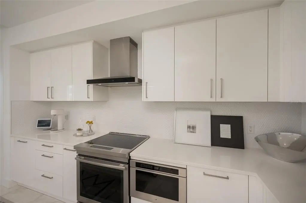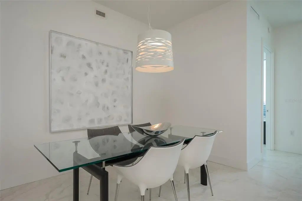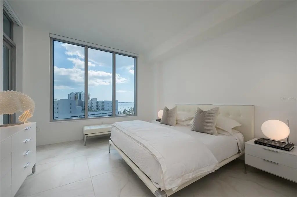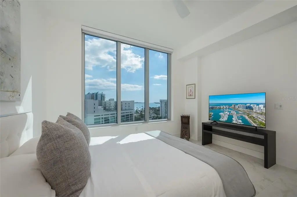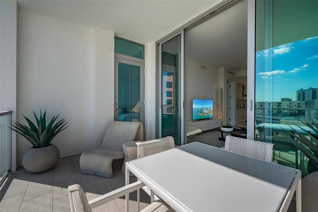 Experience an elevated expression of downtown Sarasota luxury at Residence 1013 in Mark Sarasota, where contemporary elegance meets resort-style sophistication. Positioned on the sought-after 10th floor, regarded as one of the building’s most distinguished residential levels, this residence offers a refined sense of exclusivity shared by its discerning residents. In the heart of Sarasota’s dynamic cultural and coastal district, this exceptional home embodies modern design, subtle comfort, and the vibrant convenience of downtown living. The split floor plan features two bedrooms plus a den and two-and-a-half baths, spanning 1,577 heated square feet and 1,711 total square feet, including a covered terrace, optimally square in design, providing defined depth and width. The expansive outdoor living space feels secluded yet connected, among lush treetops with park-like views of Smithsonian-registered Mermaid Fountain in nearby Paul Thorpe Park, formerly known as Pineapple Park, offering shaded seating. Enjoy distant southern city vistas, westerly views of the tropical pool deck and glowing Sarasota Bay sunsets. The open-concept layout highlights soaring ceilings, floor-to-ceiling glass, 10-foot ceilings, distinctive, architectural grand-format porcelain tile flooring with a textured finish and exquisite designer finishes. A gourmet kitchen showcases an upgraded induction cooktop for fast, energy efficient cooking, imported custom cabinetry, stone countertops, a bespoke backsplash and premium stainless steel appliances, flowing effortlessly into radiant living and dining areas ideal for entertaining or quiet reflection. The southern-facing living room enjoys tranquil natural light without the need for shades and each bedroom adorns top-tier Silhouette blinds. The south and southwest orientation provides privacy, protection from wind and rain, as well as a quiet and serene ambiance. The primary en suite serves as a peaceful sanctuary with a spa-inspired bath, electrified mirrors with custom lighting, a spacious walk-in closet and a door that opens to direct terrace access. Two deeded VIP parking spaces, fully covered, centrally located, protected from the elements and are located just steps from the elevator. A generous climate-controlled storage unit in a secure room, where packages are safely held, adds exceptional convenience only steps down the hall. The fifth-floor amenity deck crowns Mark Sarasota with resort-style indulgence: a heated saltwater infinity pool, spa, fire-pit lounge, grilling pavilion, bar, club room with catering kitchen, billiards, newsroom, and a premier fitness center with yoga and spin studios equipped for virtual workouts. Beyond your door, experience the best of downtown Sarasota, from fine dining at Hyde Park Steakhouse, State Street Eating House, for more casual fare, Boca or Besos for tapas, to evenings at Sugar, Sarasota’s glamorous piano and champagne bar. Explore nearby luxury car dealership, galleries, salons, smoothies at Toastique, Bodybar Pilates and Ride Cycling Studio. Cultural treasures such as the Sarasota Opera House, Florida Studio Theatre, and Sarasota Art Museum are walking distance, while boaters will enjoy Marina Jack. Lido Beach is over the Ringling Bridge. With 24-hour concierge service, secure access, on-site management and a pet-friendly atmosphere, effortless grandeur unites luxury, convenience and Sarasota’s signature coastal charm in one unforgettable downtown address.