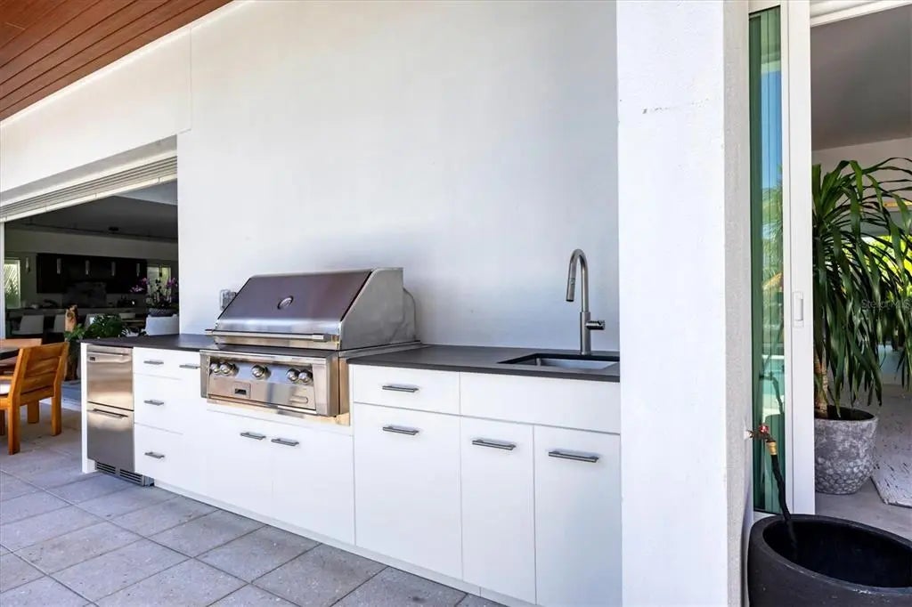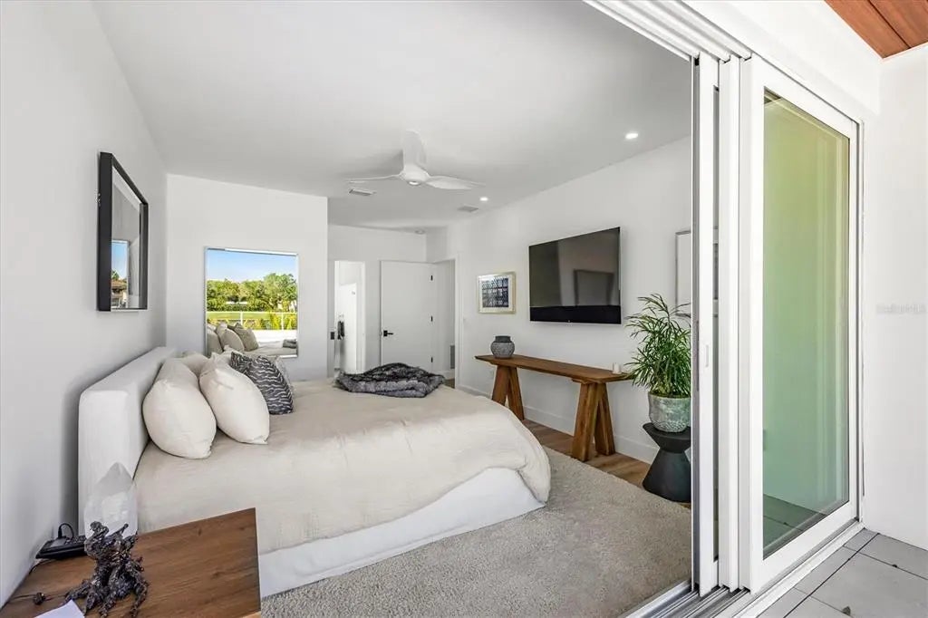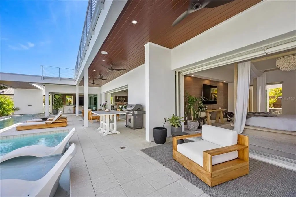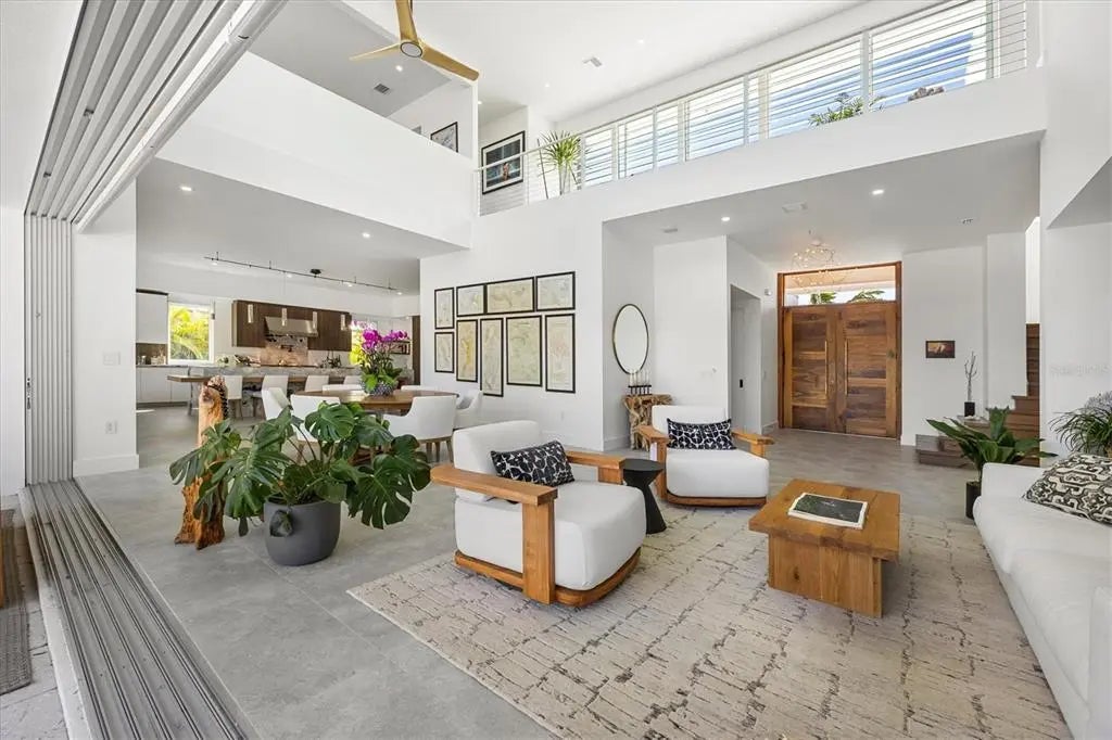 Anchored in one of Sarasota’s most sought-after deepwater settings, 3631 San Remo Terrace is a modern sanctuary where clean lines meet the warmth of natural textures, creating a home that feels both timeless and alive. Completed in 2021 by award-winning designer Stephen Chung and thoughtfully refined by the current owner, the residence reflects resilience and intention, standing strong through recent storms while maintaining an atmosphere of calm and connection to its surroundings. Updated in fall of 2025, the home now features new railings and window trim to complement the wood flooring, linear drains in the paver pool deck, and a fully equipped outdoor kitchen, enhancing its functionality and contemporary appeal. Within 4,750 square feet of living space, complemented by nearly 3,000 square feet of terraces, pool, and patio, every detail is designed to balance sophistication with ease. The kitchen centers the home with a sculptural marble island and professional-grade Sub-Zero and Wolf appliances, accented by soft lighting and sunlight that filters through walls of glass. The great room’s stone fireplace, open shelving, and expansive sliders invite an effortless flow to the outdoors, while the adjoining dining space rises with two-story ceilings and a dramatic wall of windows. A temperature-controlled wine room with space for 1,800 bottles adds both artistry and function. The primary suite is its own retreat, defined by quiet luxury and seamless connections to nature. Sliders open to a private courtyard with spa and sauna on one side and the pool terrace on the other. Inside, illuminated details, a bespoke walk-in closet, and a spa-like bath with an expansive vanity and glass-enclosed shower emphasize comfort and serenity. The second floor carries the same sense of air and light, with three guest suites, one currently a gym, each opening to a full-length terrace overlooking the water. A loft like office, a custom laundry room with a beverage cooler and sink, and an open gallery walkway further showcase the home’s thoughtful design. Outside, the saltwater pool with a glass wall becomes a focal point for relaxation, while the expansive dock offers a 20,000-pound lift, two low-profile lifts, and a floating platform for kayaks and paddleboards—providing instant access to Sarasota Bay and Big Pass. Even the garage has been elevated, with epoxy floors, a BendPak lift for a fourth car, and custom storage for boating and fishing gear. Every system has been considered, including a fully integrated smart-home platform with programmable lighting and shades, whole-house audio, Apple TVs, a generator, and strong WiFi indoors and out. San Remo Estates is at the core of Sarasota, just before the north bridge to Siesta Key, and minutes to Downtown Sarasota and Southside Village. 3631 San Remo Terrace is a unique property, where every detail speaks to the timelessness and practicality of the Sarasota School of Architecture.