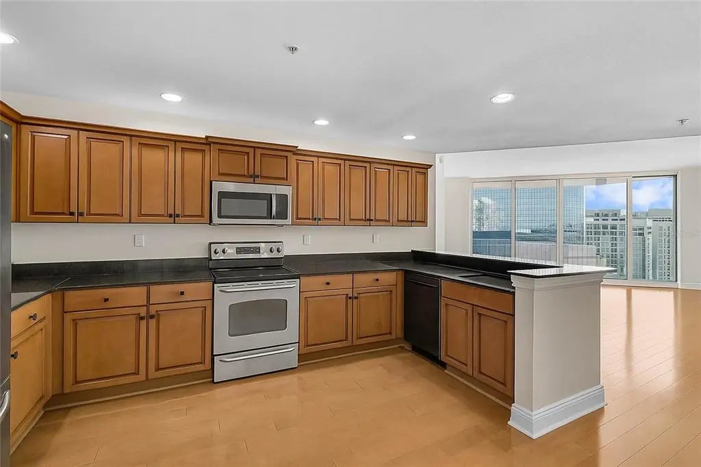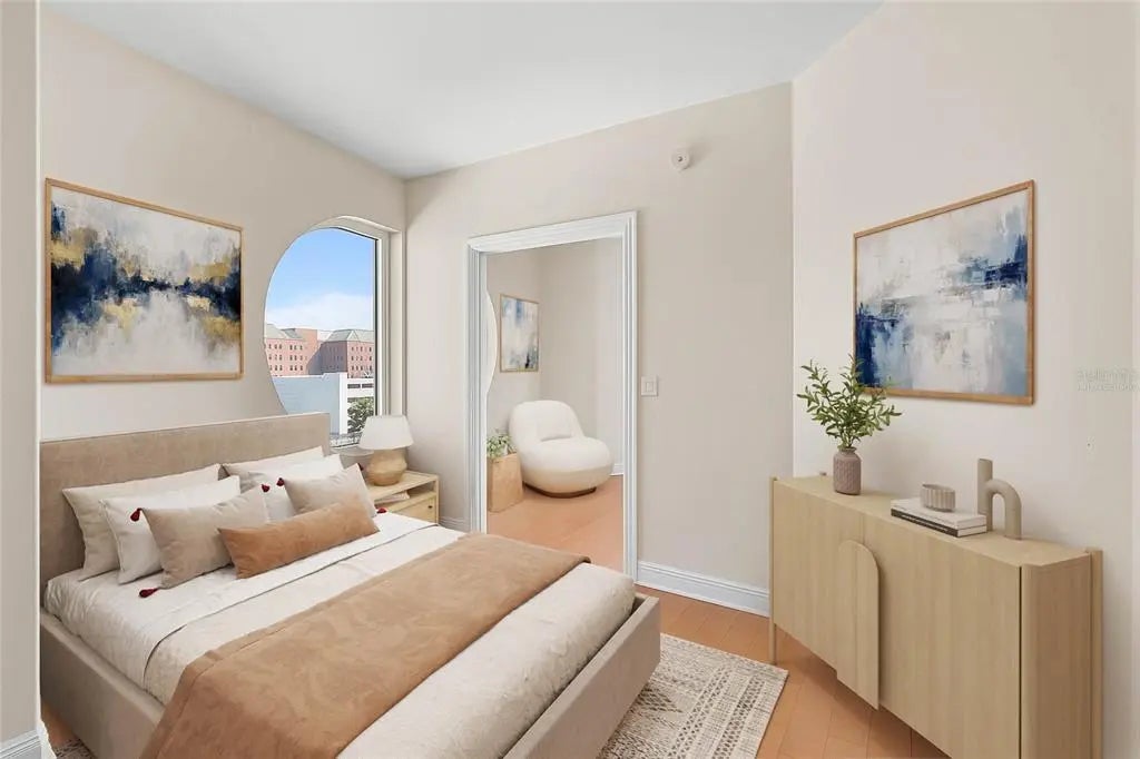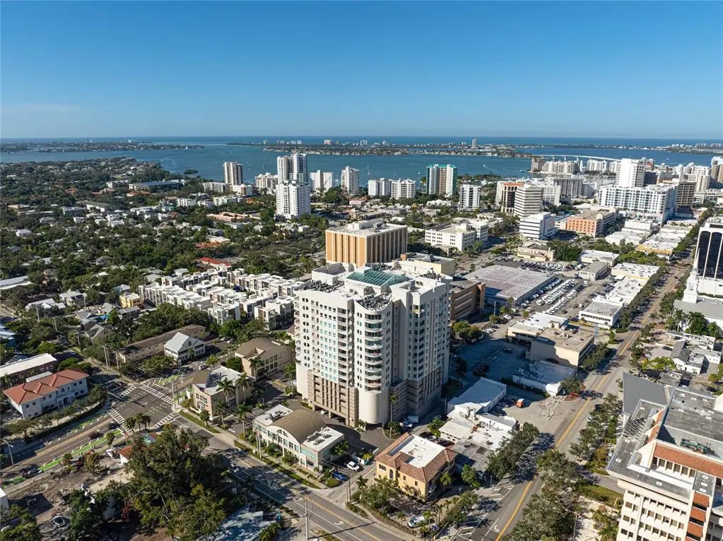 One or more photo(s) has been virtually staged. Experience sophisticated urban living in this spacious 7th-floor corner residence at Rivo at Ringling in downtown Sarasota. The open layout features beautiful wood floors, a modern kitchen with wood cabinetry, granite countertops, breakfast bar, and stainless steel appliances. Enjoy a large private terrace with northeast city and partial bay views—perfect for relaxing or entertaining. This residence includes a large laundry room with extra storage and full-size washer and dryer, plus updates such as a top-of-the-line Trane A/C (2023) and a frameless glass shower in the primary bath. Rivo’s resort-style amenities include a heated pool and spa, fitness center, BBQ terrace, social and conference rooms, concierge services, bike and kayak storage, and EV charging stations. Two deeded, secure parking spaces and an oversized storage room complete this rare offering. Steps from fine dining, shopping, and Sarasota’s cultural attractions, Rivo at Ringling combines luxury, location, and lifestyle in one exceptional address.