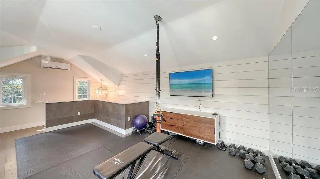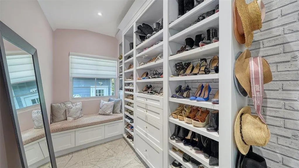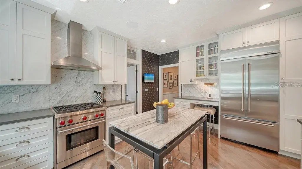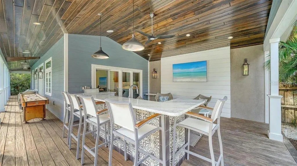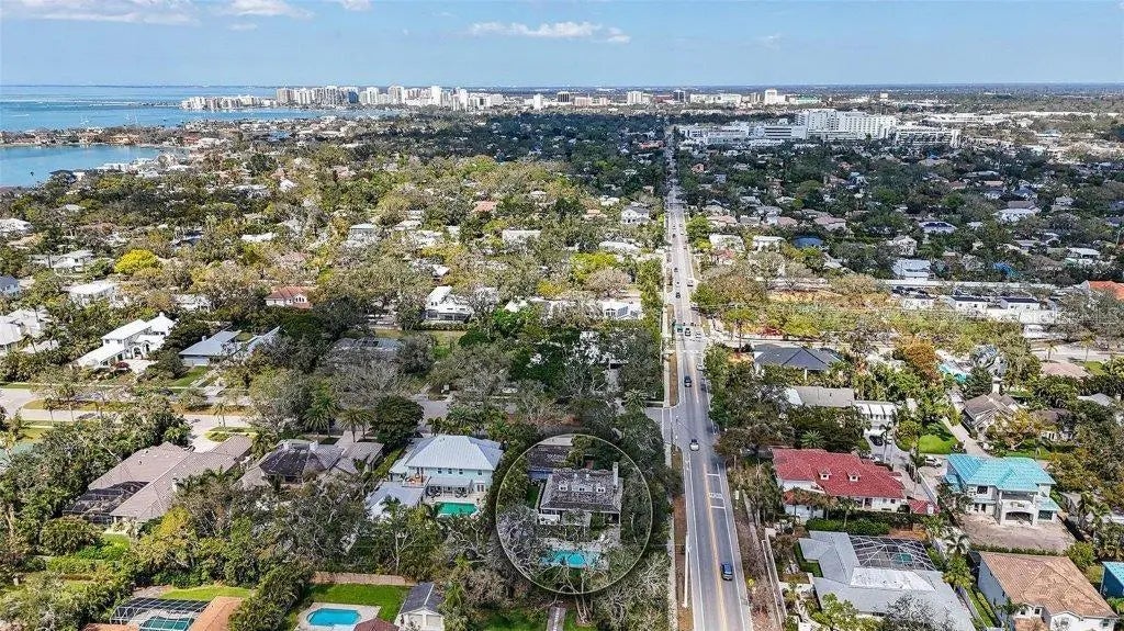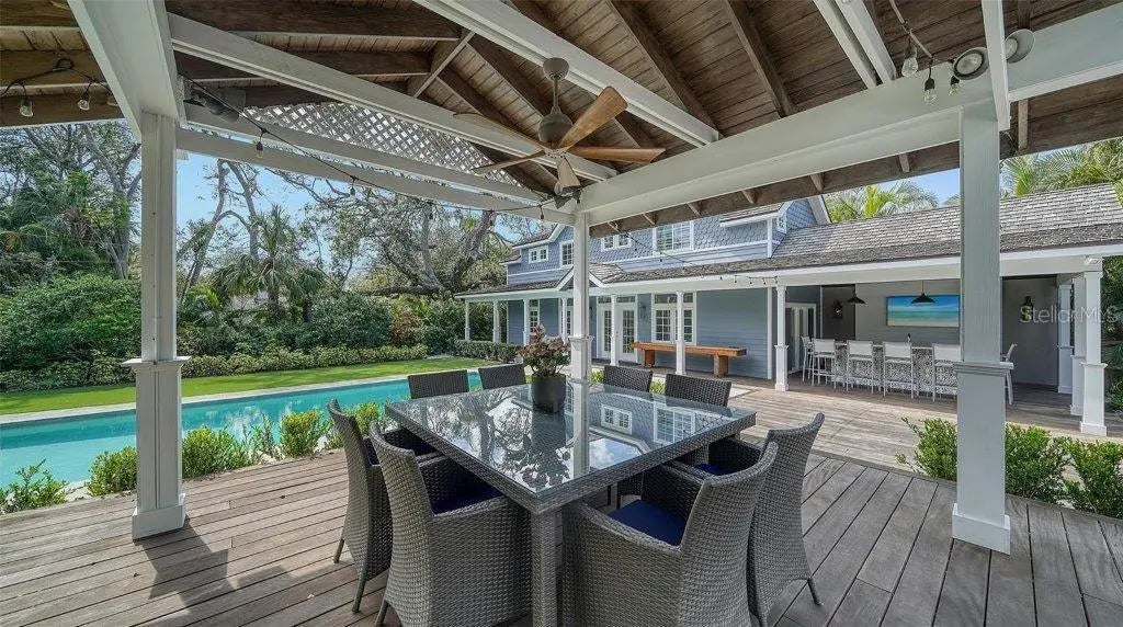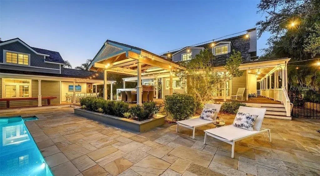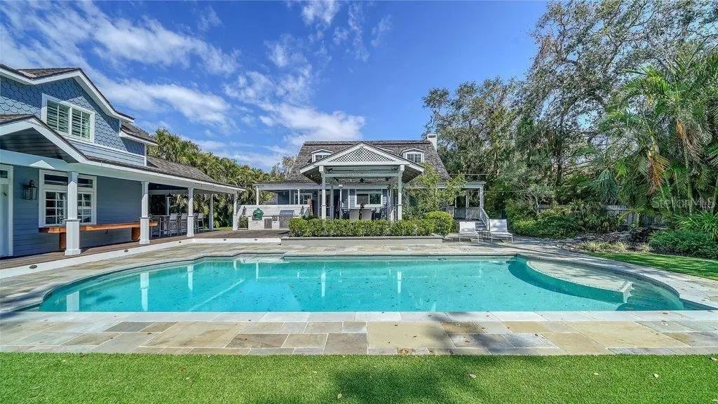 Welcome to this rarely available Cape Cod–style residence, comprised of a masterfully renovated main house and separate luxe guest house poised on an expansive 20,000 sq. ft. lot in Sarasota’s prestigious Cherokee Park. Elevated 23 feet above sea level and nestled on a wide, tree-lined street in the coveted West of Trail district—within the top-rated Southside school zone—this 4-bedroom, 3 full/2 half bath +office private compound blends timeless architecture with designer-curated sophistication. A stately front porch framed by lush landscaping and classic brick walkway introduces the home with understated grandeur. Handcrafted, glass-inlaid iron double doors open to a refined foyer where natural light, elegant millwork, and soaring 10-foot ceilings set the tone for the bespoke interiors beyond. Inside, original hardwood floors, designer lighting by Arteriors, Eichholtz, and Kelly Wearstler, and high-end finishes selected by Chelsea Dunbar of Blu Interiors create a sense of warmth and refinement throughout. The quartz-clad chef’s kitchen is as functional as it is beautiful, featuring a Wolf natural gas range, KitchenAid French-door refrigerator, ample pantry space, and custom cabinetry—perfectly suited for both intimate dining and entertaining. Anchored by a wood-burning fireplace, the main living and dining spaces flow seamlessly outdoors to an inviting Pennsylvania bluestone patio, low-maintenance Astroturf lawn, and wrap-around Brazilian teak deck—an idyllic setting for year-round enjoyment. The serene first floor primary suite is a private retreat showcasing three custom-designed walk-in closets and a spa-inspired bath with marble finishes, dual vanities, heated towel bar, and a zero-entry shower with body sprays. Ascend the custom staircase to find 2 tailored guest retreats with spa-like bath, each offering serene views and thoughtfully appointed details for ultimate comfort and privacy. Throughout the home, custom wallcoverings by Phillip Jeffries, Scalamandré, and Élitis add layers of texture and artistry, while upgraded systems—including a surround sound system, six climate zones, and multiple laundry areas—enhance everyday comfort. Resort-style living continues outdoors with a 9-foot-deep pool framed by classic Bevolo gas lanterns and an extraordinary luxury guest house built in 2016. This refined space includes an entertaining area with custom built-ins, full bar, refrigerator drawers, Scotsman icemaker, private guest suite, 1.5 baths, gym, and an outdoor teak shower. The fully equipped outdoor kitchen features a natural gas Lynx grill, XL Green Egg, quartzite prep counters, and a covered gazebo ideal for al fresco dining. All impact doors and windows, cedar shake roof, and Hardie Board siding add to the beauty and durability of the home. Completing this exceptional estate is an oversized 2.5-car detached garage and secure, fully fenced grounds with electric fence. Enjoy tree-lined streets with sidewalks and a true sense of community, all just a short stroll or golf cart ride to Southside Village where residents enjoy boutique shops, Morton’s Gourmet Market, cafés, and top-rated restaurants, and minutes from downtown Sarasota and Siesta Key Beach. This is refined Gulf Coast living—where timeless architecture meets effortless luxury in one of Sarasota’s most treasured neighborhoods.