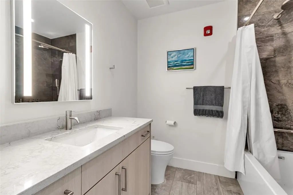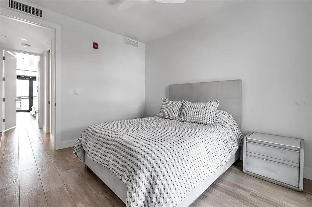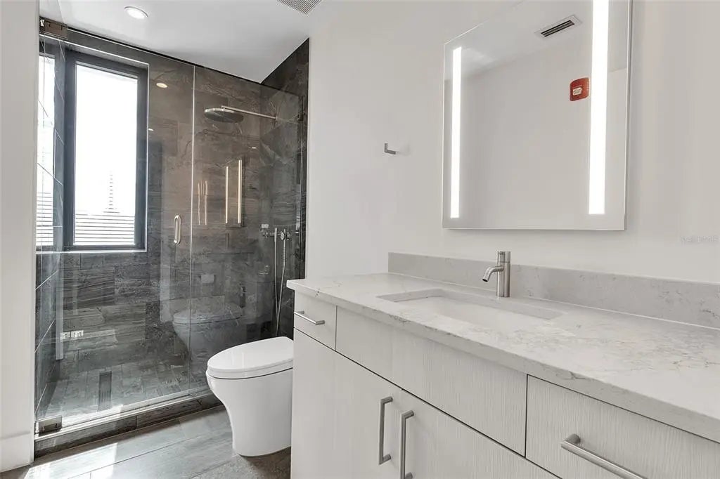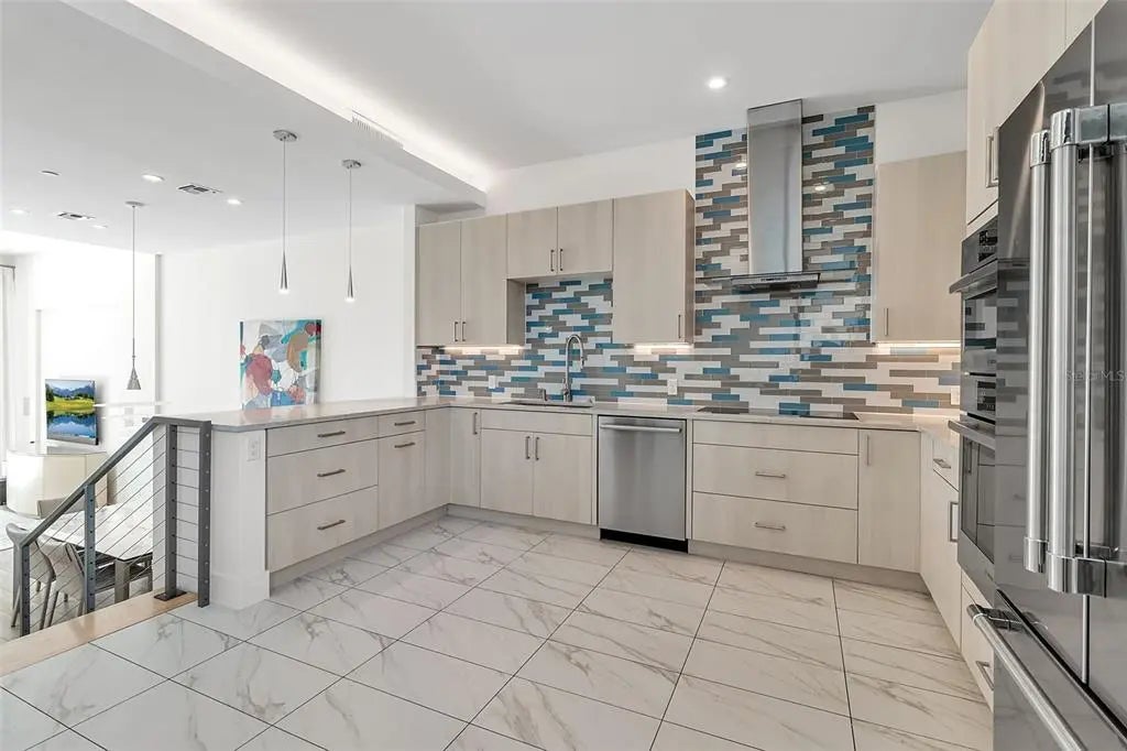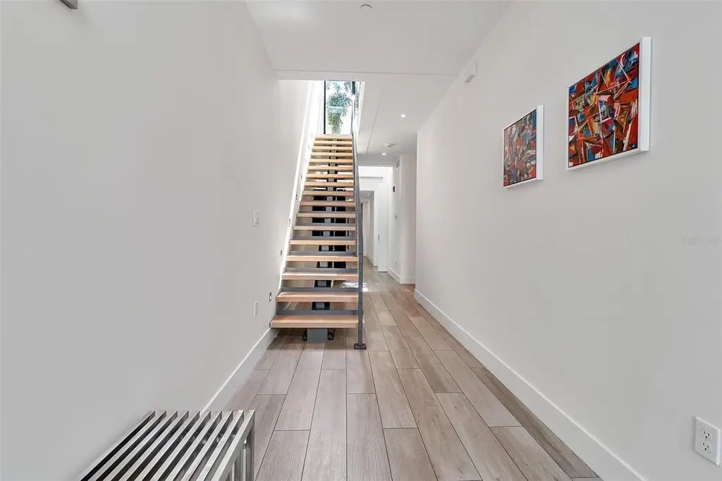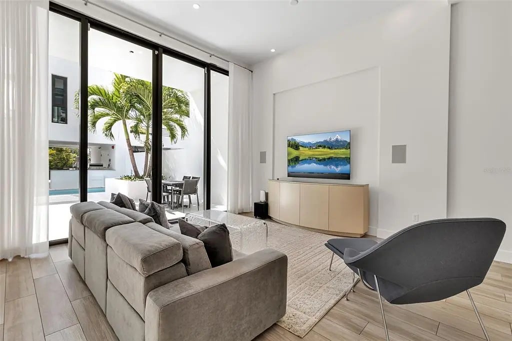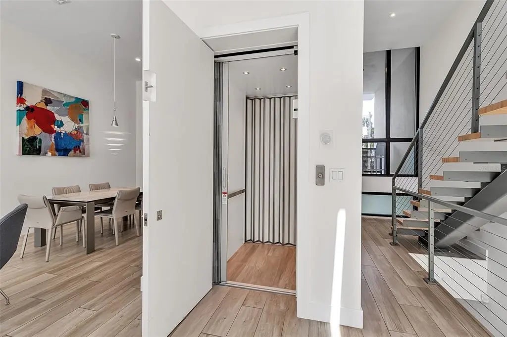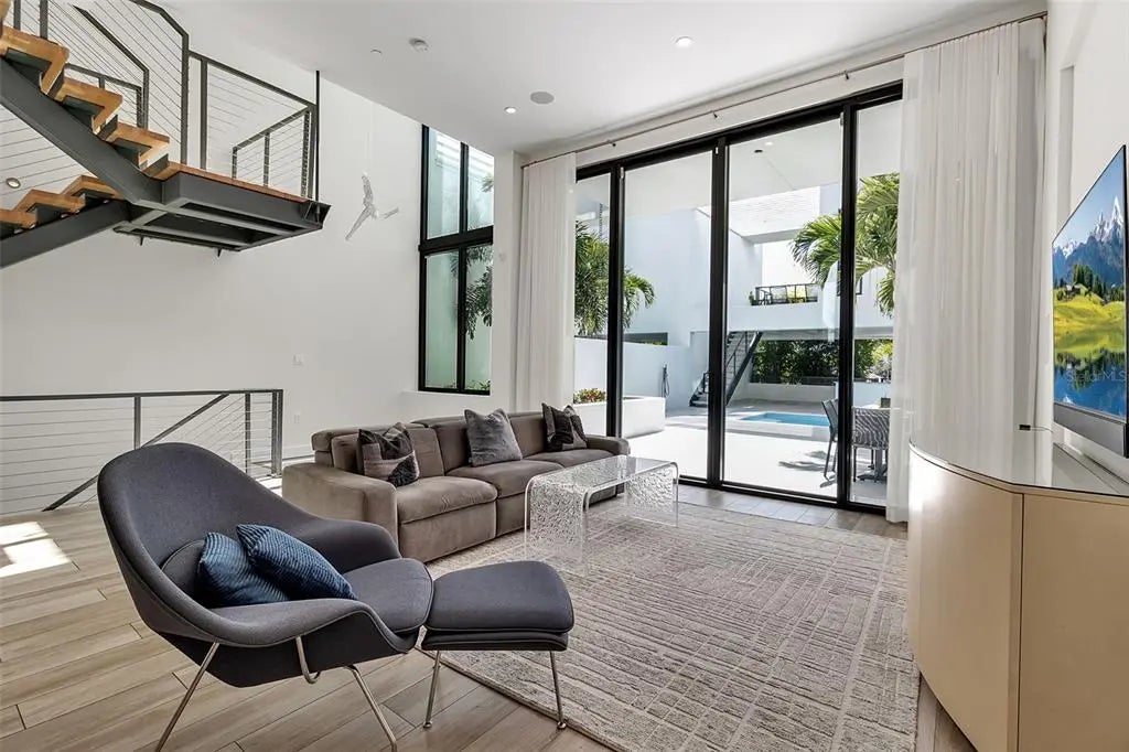 Anchored in Sarasota’s vibrant Rosemary District, a hub of art, dining, and design just steps from downtown, this contemporary three-story residence captures the essence of urban coastal living. Defined by its clean architectural lines, striking white façade, and geometric precision, it offers a rare balance of privacy and proximity in one of Sarasota’s most walkable neighborhoods. A sleek iron-and-glass entry framed by textured tile sets the tone for what’s inside: light, volume, and effortless connection to the outdoors. The floating staircase, with open risers and maple treads, becomes a sculptural centerpiece beneath ceilings that soar up to 13 feet. A three-stop elevator ensures convenience from the ground-level garage to the uppermost terrace. The main living level unfolds with gallery-like openness, a seamless blend of style and function. The sleek kitchen, featuring quartz countertops, premium stainless-steel appliances, and clean-lined cabinetry, overlooks the dining and great room. The open living space is complete with expansive sliders open directly to the courtyard and its tranquil Zen pool, where the rhythm of water and greenery softens the modern form. With its summer kitchen, fire table, and covered dining terrace, the home transitions effortlessly from quiet mornings to lively evenings. Upstairs, the primary suite feels like a retreat, complete with a glass-framed balcony, spa-inspired bath, and thoughtful details that invite calm. Two additional guest rooms, one that is currently used as an office, mirror the home’s minimalist aesthetic and abundant natural light. A private guest casita, accessible from the courtyard, expands the home’s flexibility. With a kitchenette, full bath, and its own balcony, it’s ideal for visitors, another primary suite or a fitness space, all with the independence of a separate entry. Constructed of concrete and steel with impact-rated glass, every element underscores quality and low-maintenance design, perfect for those seeking the ease of a lock-and-leave lifestyle. Positioned in Sarasota’s coveted Rosemary District, one of Sarasota’s most walkable neighborhoods, this residence places the best of the city just outside your door. Stroll to downtown dining, art galleries, live music, and cultural venues, or stop by the weekly Sarasota Farmers Market. Boutique shops, theaters, and cafés line the nearby streets, while the beaches, the John Ringling Bridge, St. Armand's Circle, and Sarasota Bay are only minutes away. With convenient access to Sarasota Bradenton International Airport, this address perfectly blends urban luxury, outdoor living, and strong architectural design, offering a downtown modernism that feels both refined and deeply livable.