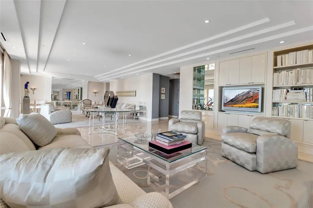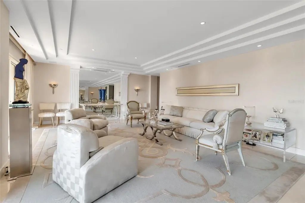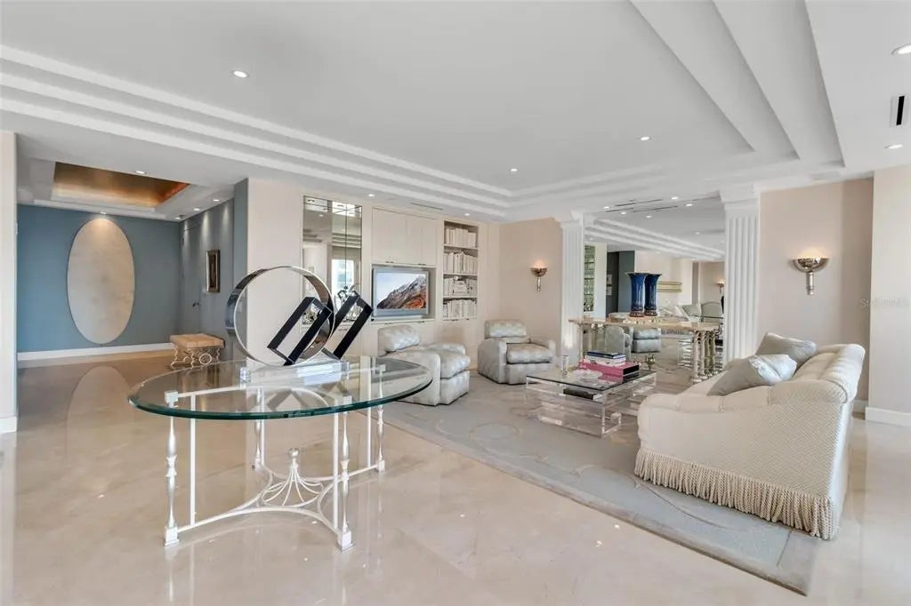 Perched high above exquisite Sarasota Bay, Ritz-Carlton Residences #1202 harmonizes a breathtaking display of scale, privacy, dramatic views, and exceptional design. Internationally renowned interior designer Geoffrey Bradfield paid the utmost attention to every detail as he masterfully crafted this sanctuary. The glamor unfolds gracefully as you enter the condo’s serene foyer featuring a beautifully architected gold-leafed ceiling, upholstered silk walls, and a custom lighting plan. Situated just off the foyer is a custom walk-in closet and a powder room finished with ultra-suede walls and modern stainless steel and glass pedestal sink. Crema Marfil marble flooring which runs throughout the condo’s public spaces leads you into a Grand Salon with a stunning tiered ceiling, gracious windows overlooking Marina Jack and the Ringling Causeway, fabulous lacquered cabinetry, and architectural moldings and accent columns. The large eat-in kitchen features sleek Poggenpohl cabinetry providing more than ample storage for any host or chef as well as a built-in desk area. The appliance package is top notch: Sub-Zero refrigerator/freezer, Gaggenau cooktop with a stainless steel and glass hood, Bosch double wall ovens, and a Miele dishwasher. The kitchen's custom lighting plan accents the textured walls and marble flooring. Both bedrooms offer marvelous custom appointments. The master suite features elegant lacquered custom cabinetry, silk upholstered walls, and lacquered moldings. The master bath’s ceiling is gold-leafed, the walls are marbled, and it is fitted with an oversized Kohler Jacuzzi tub, a glass-surround shower, and Venetian glass mirrors and vanities. The spacious walk-in closet also features custom millwork with lacquered columns and a Crema Marfil marble floor. The guest suite is similarly appointed with custom lacquered cabinetry, a large walk-in closet and a full bath with a large vanity. Throughout the condo, you will find opulent hardware and doors fitted with invisible sash hinges, linear air conditioning diffusers, and motorized window shades, as well as a spacious laundry room. The residence offers two large balconies perfect for viewing Sarasota’s radiant sunsets. While living at the Ritz Carlton Residences you will enjoy a resort-style pool with a panoramic sun deck and private dock for convenient drop-off and pick-up. Additional resident amenities include secured climate controlled storage, a private residential entry separate from the hotel, and an elegantly appointed private club room. Hotel living offers access to in-room dining, 24-hour concierge, car valet service, a newly completed spa (2024), and access to popular dining venues Jack Dusty and Rufa. Gracefully positioned along Sarasota’s scenic bayfront, ownership at 1111 Ritz-Carlton Drive #1202 presents an extraordinary opportunity for a life full of refinement and sophistication in a city featuring world-class beaches, stylish boutique shopping, acclaimed dining, and a vibrant cultural scene.