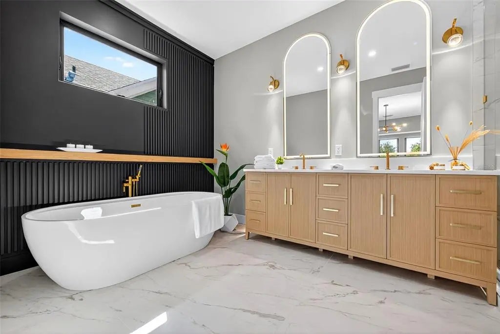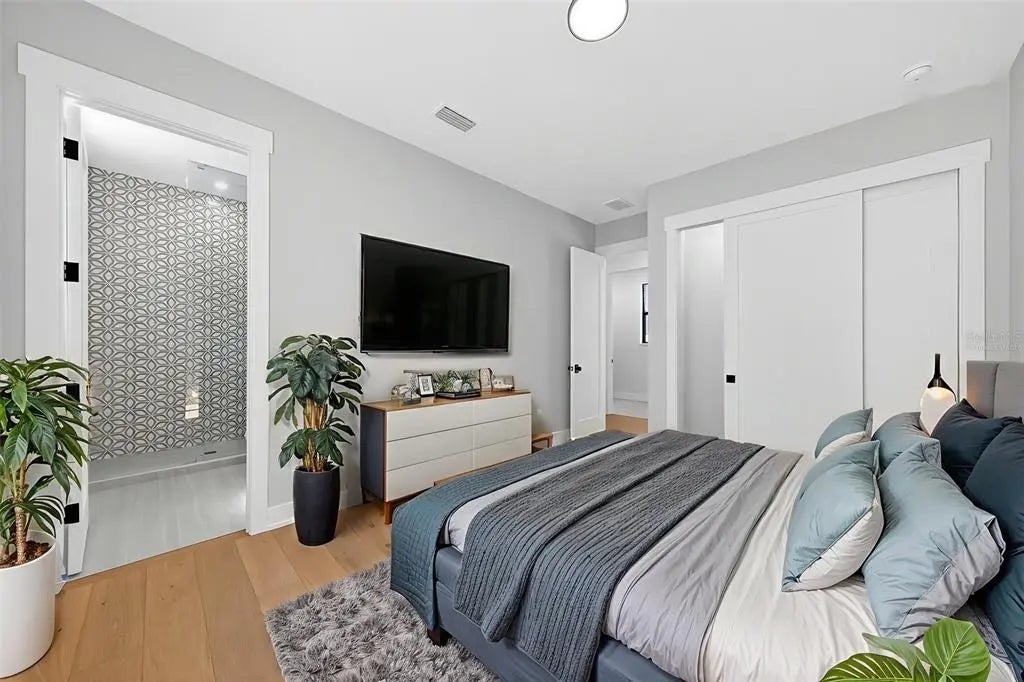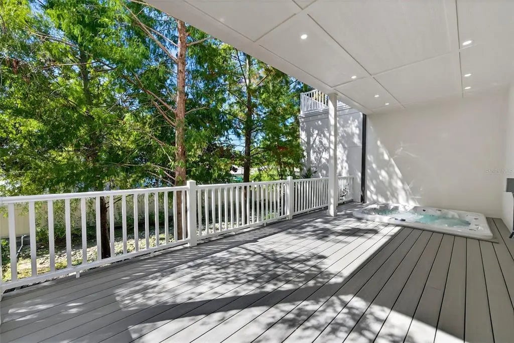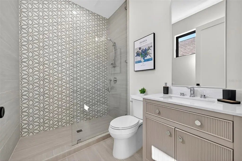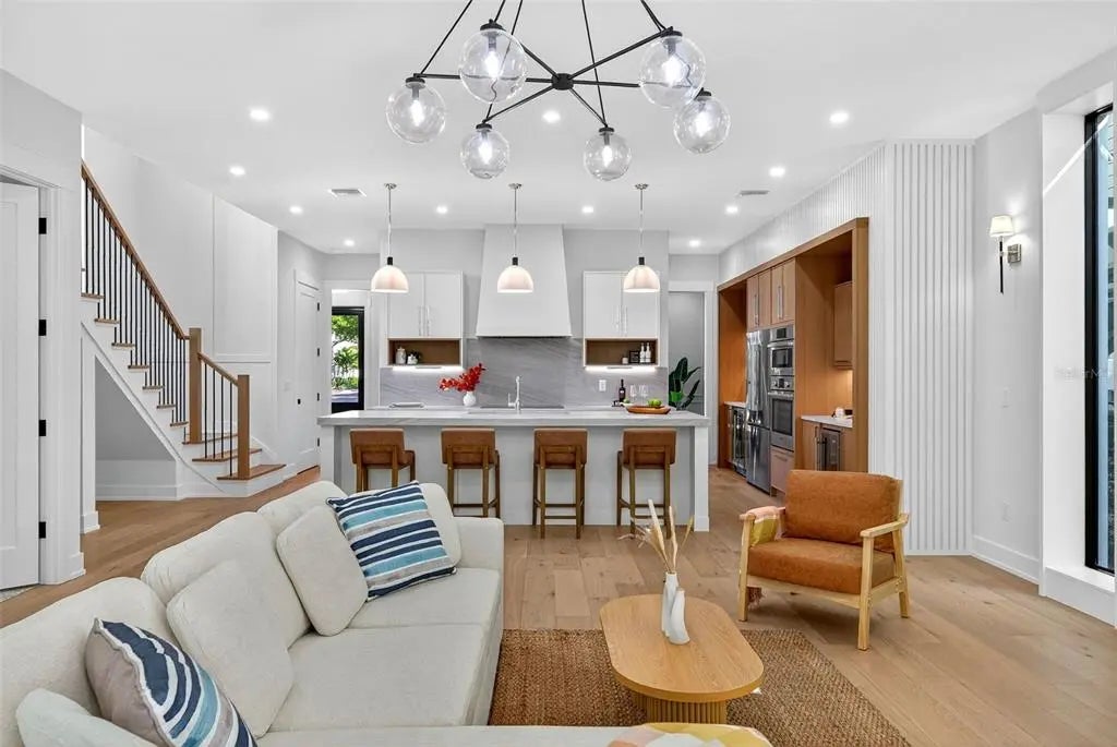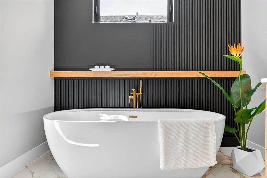 Brand new, impeccably designed modern home in the private, gated community of Granada Park. Welcome guests into the chic shiplap foyer, complete with a built-in bench and coat rack. An elegant dining room with custom millwork and a designer chandelier sets the tone for both casual gatherings and formal entertainment. The conveniently located butler’s pantry between the dining room and kitchen is equipped with a wine and beverage refrigerator, bar area, and a spacious walk-in pantry—making entertaining effortless. The kitchen is a chef’s dream, featuring custom cabinetry with matte quartzite counters, a large island with seating, and a Ruvati workstation sink with accessories. Premium Bosch appliances include a five-burner induction cooktop, convection oven with microwave, and under-counter lighting, complemented by an LG refrigerator and freezer and designer pendant lights above the island. Engineered hardwood floors throughout the main living areas provide warmth and sophistication. The spacious, light-filled living room showcases elegant millwork detail and an electric fireplace, opening to a large private terrace with a hot tub—perfect for relaxing or entertaining outdoors. The owner’s suite features a custom-designed accent wall, a large walk-in closet, and a private balcony. The spa-like owner’s bath includes a striking accent wall framing a freestanding tub, double vanities with Grohe plumbing fixtures, lighted vanity mirrors, a private water closet, and a seamless glass walk-in shower with rain head and handheld shower. Upstairs, the conveniently located laundry room includes a Samsung washer and dryer, built-in cabinetry, and tile flooring. The ensuite guest bedroom offers a private bath, while two additional guest bedrooms share a spacious hall bathroom with dual vanities, lighted mirrors, a tub and shower combination with handheld showerhead, designer pendant lighting, and classic penny tile details. An additional second floor large outdoor terrace with fireplace is perfect for watching football games and entertaining your guests. A charming mudroom with entry from the garage features a single vanity with sink, built-in coat rack, and shoe bench. The two-car garage offers high ceilings and keypad entry. Enjoy a prime location close to Publix, Southside Elementary School, Morton’s Market, Siesta Key Beach, and all that downtown Sarasota has to offer. Granada Park residents enjoy a community swimming pool, cabana, and a maintenance-free lifestyle—ideal for convenient, luxurious downtown living.