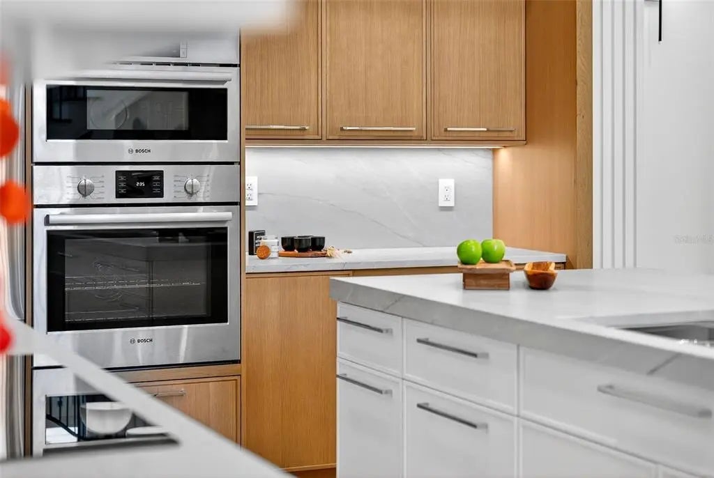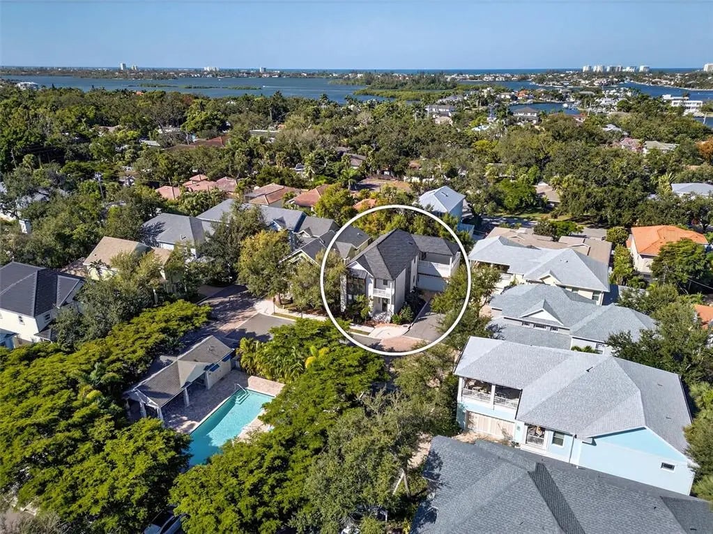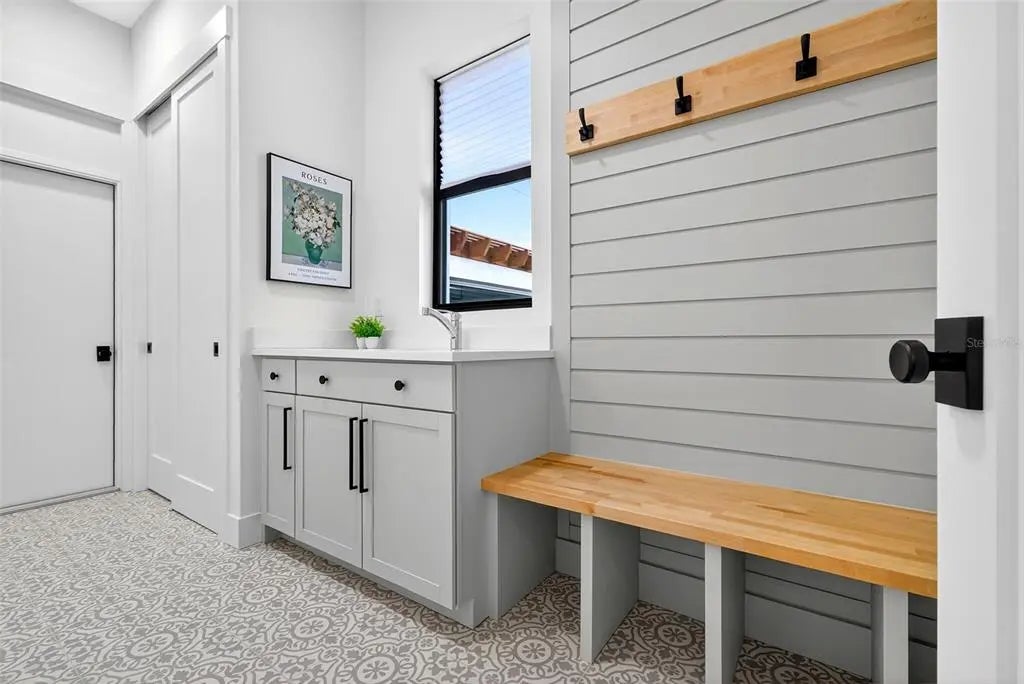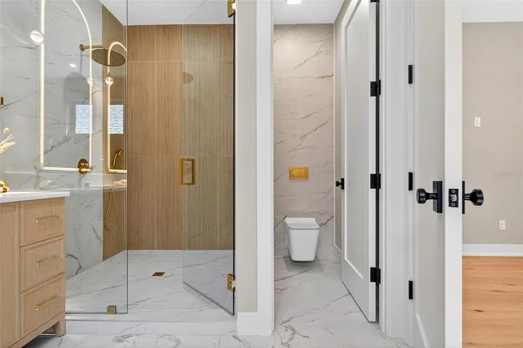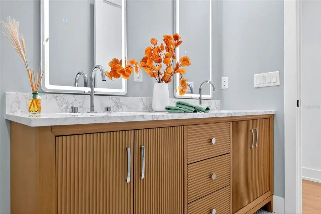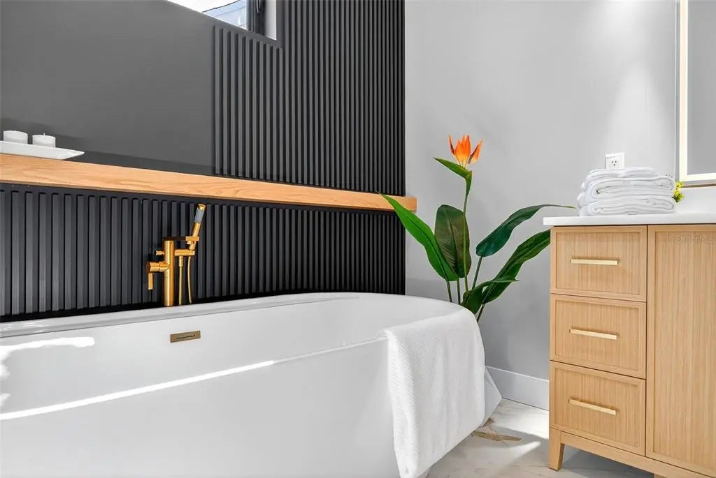Brand new, impeccably designed modern home in the private, gated community of Granada Park. Welcome guests into the chic shiplap foyer, complete with a built-in bench and coat rack. An elegant dining room with custom millwork and a designer chandelier sets the tone for both casual gatherings and formal entertainment. The conveniently located butler’s pantry between the dining room and kitchen is equipped with a wine and beverage refrigerator, bar area, and a spacious walk-in pantry—making entertaining effortless. The kitchen is a chef’s dream, featuring custom cabinetry with matte quartzite counters, a large island with seating, and a Ruvati workstation sink with accessories. Premium Bosch appliances include a five-burner induction cooktop, convection oven with microwave, and under-counter lighting, complemented by an LG refrigerator and freezer and designer pendant lights above the island. Engineered hardwood floors throughout the main living areas provide warmth and sophistication. The spacious, light-filled living room showcases elegant millwork detail and an electric fireplace, opening to a large private terrace with a hot tub—perfect for relaxing or entertaining outdoors. The owner’s suite features a custom-designed accent wall, a large walk-in closet, and a private balcony. The spa-like owner’s bath includes a striking accent wall framing a freestanding tub, double vanities with Grohe plumbing fixtures, lighted vanity mirrors, a private water closet, and a seamless glass walk-in shower with rain head and handheld shower. Upstairs, the conveniently located laundry room includes a Samsung washer and dryer, built-in cabinetry, and tile flooring. The ensuite guest bedroom offers a private bath, while two additional guest bedrooms share a spacious hall bathroom with dual vanities, lighted mirrors, a tub and shower combination with handheld showerhead, designer pendant lighting, and classic penny tile details. An additional second floor large outdoor terrace with fireplace is perfect for watching football games and entertaining your guests. A charming mudroom with entry from the garage features a single vanity with sink, built-in coat rack, and shoe bench. The two-car garage offers high ceilings and keypad entry. Enjoy a prime location close to Publix, Southside Elementary School, Morton’s Market, Siesta Key Beach, and all that downtown Sarasota has to offer. Granada Park residents enjoy a community swimming pool, cabana, and a maintenance-free lifestyle—ideal for convenient, luxurious downtown living.