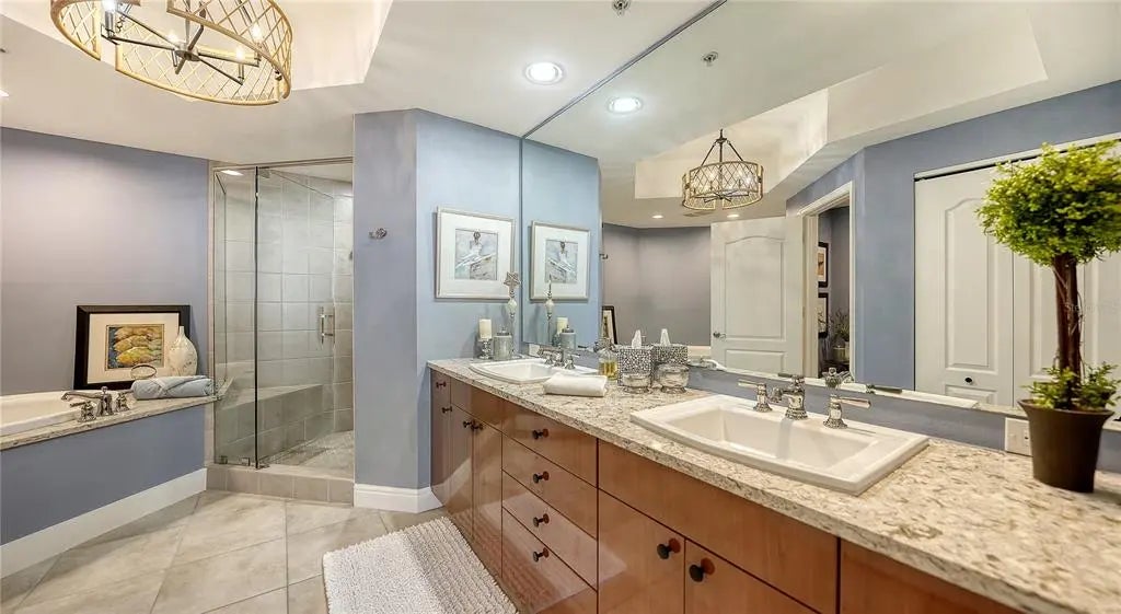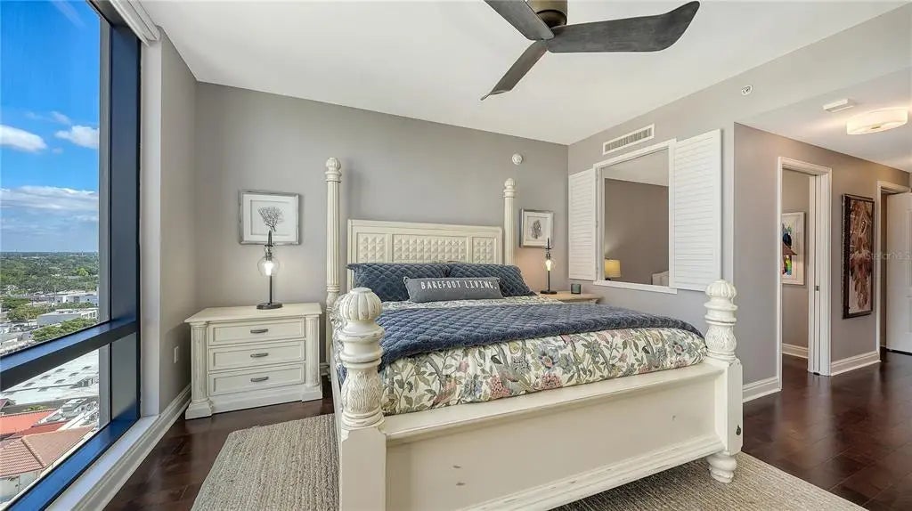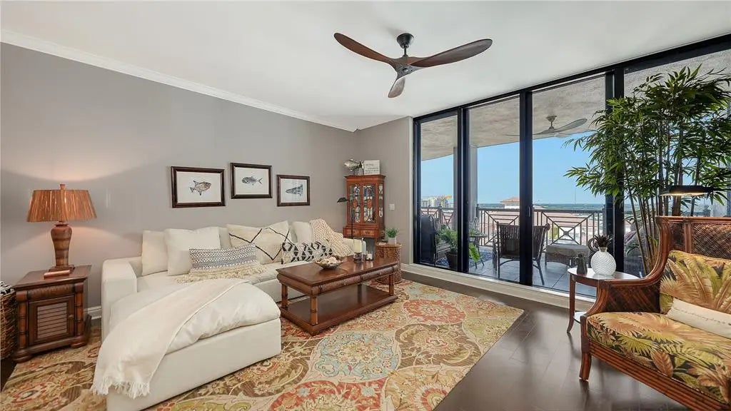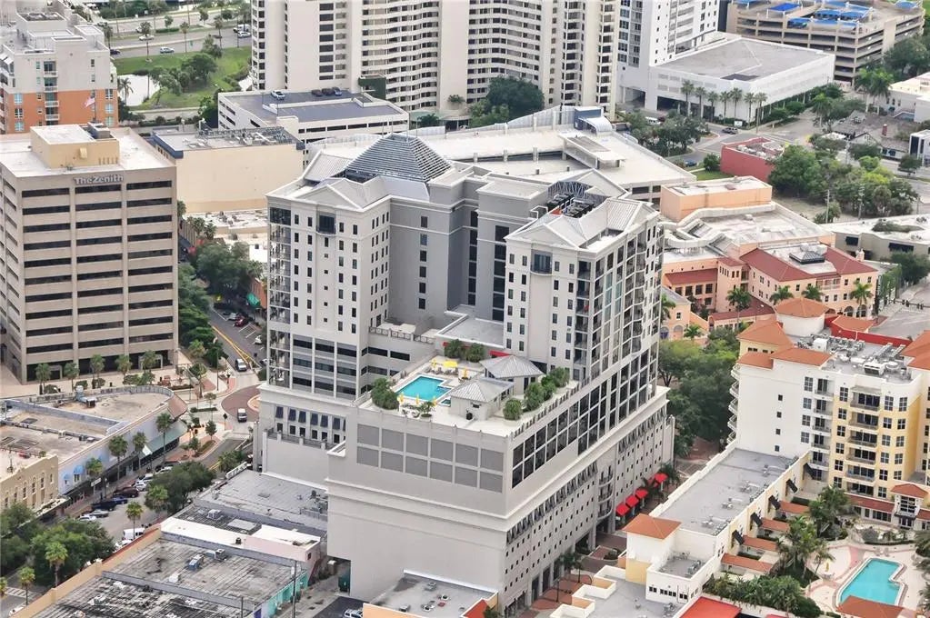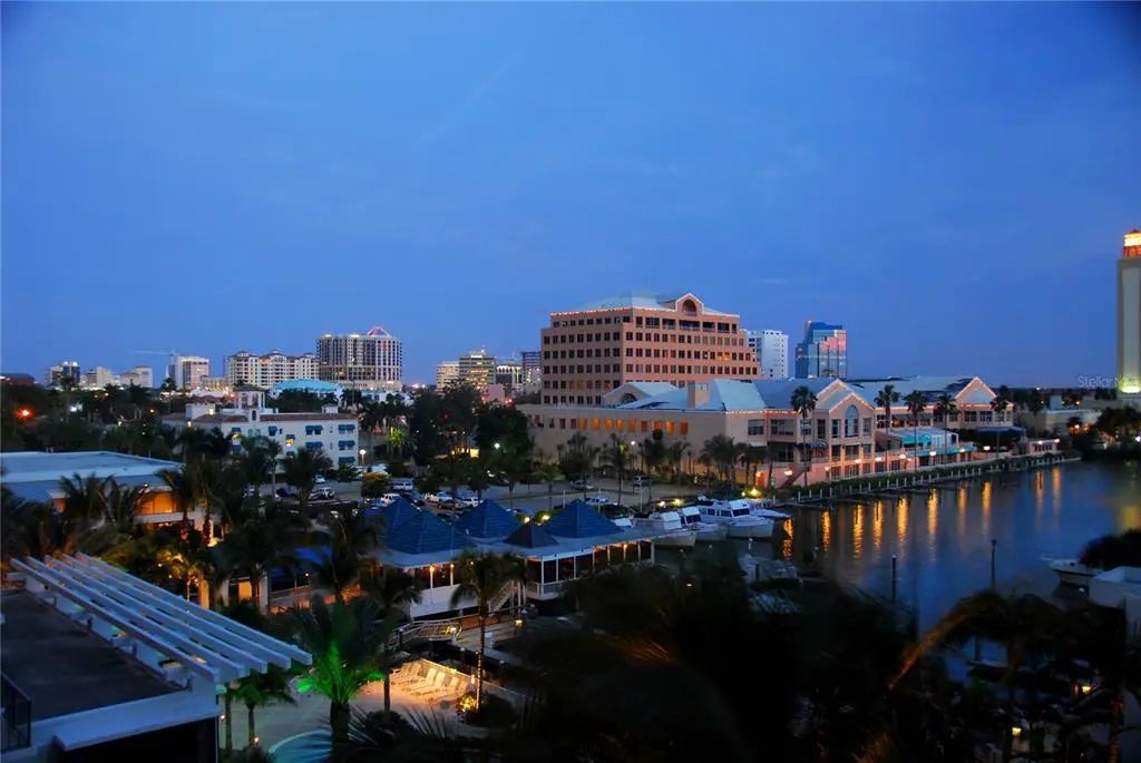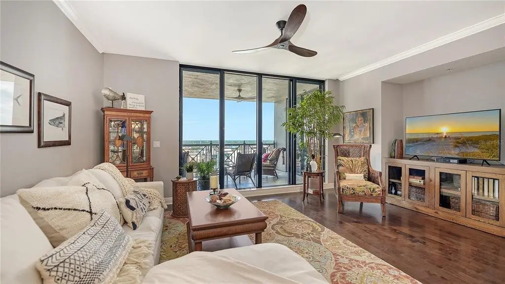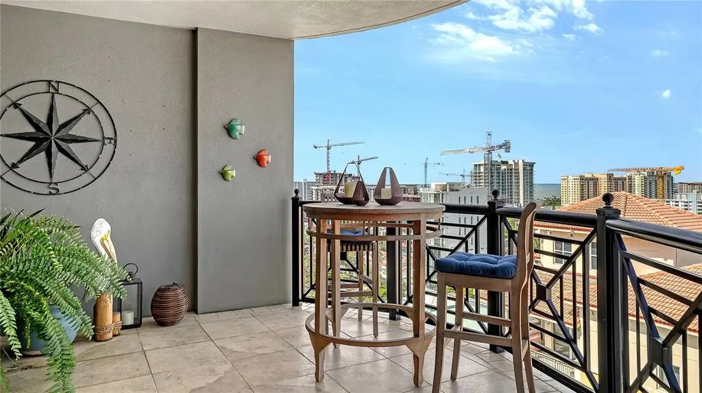 Experience the essence of Sarasota’s urban living in this exquisitely updated two-bedroom, two-bath residence at Five Points Plaza, one of the city’s most sought-after addresses. Spanning 1,671 square feet, this beautifully appointed home combines elegant design, modern upgrades, and an unmatched downtown location. The chef-inspired kitchen is a masterpiece of coastal refinement, featuring GE Profile stainless steel appliances, Kohler fixtures, and an Ann Sacks designer tile backsplash. Polished quartz countertops create a sleek, inviting surface for entertaining, while the open-concept layout flows effortlessly into the dining and living areas. A custom solid maple built-in adds architectural warmth and sophistication, perfect for displaying art, books, or media. Step outside to your expansive private terrace, accessible from both bedrooms and the living room, offering stunning views of Sarasota Bay and the vibrant city skyline. The terrace extends your living space, ideal for morning coffee, dining al fresco, or cocktails at sunset. The primary suite is a tranquil retreat featuring a cozy sitting area that doubles as a reading nook or home office. A motorized window shade provides effortless privacy and light control, creating a restful atmosphere day or night. Both bathrooms showcase Kohler fixtures and sinks, while the guest bath features a custom solid oak vanity with artisan craftsmanship. At Five Points Plaza, every detail reflects convenience and peace of mind. Enjoy 24-hour concierge service, on-site management, secure garage parking, and resort-style amenities including a heated pool, state-of-the-art fitness center, and spacious entertainment areas. This turn-key furnished residence is offered with three months of premium rental income (January through March 2026), providing an exceptional opportunity for both investors and seasonal residents. This property represents a rare opportunity to own a piece of downtown Sarasota’s lifestyle where, convenience, location, and livability converge.
