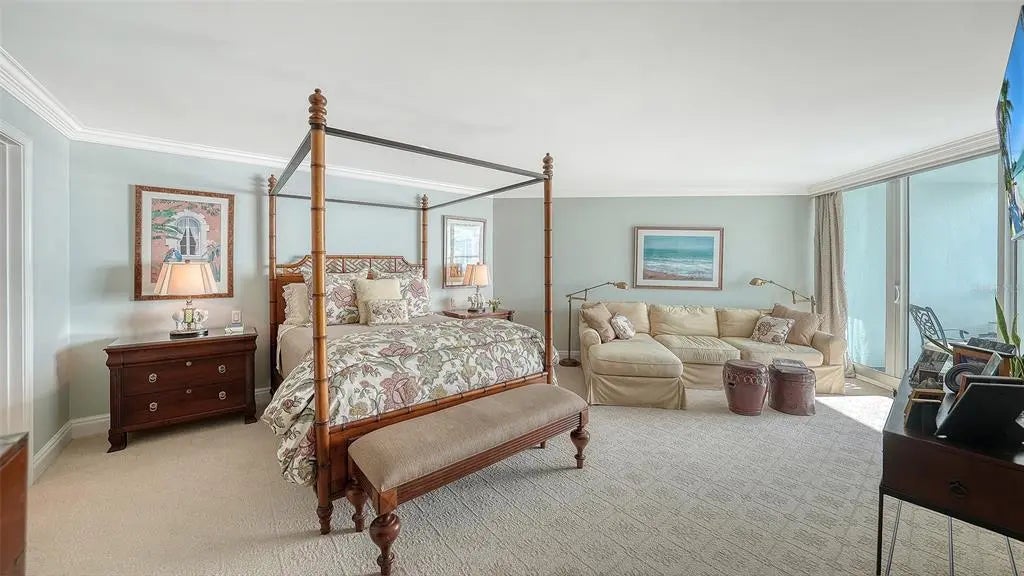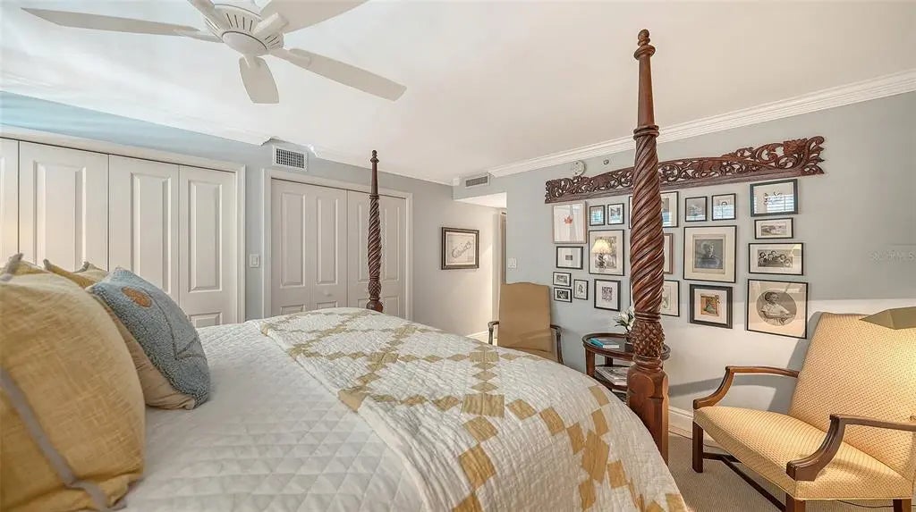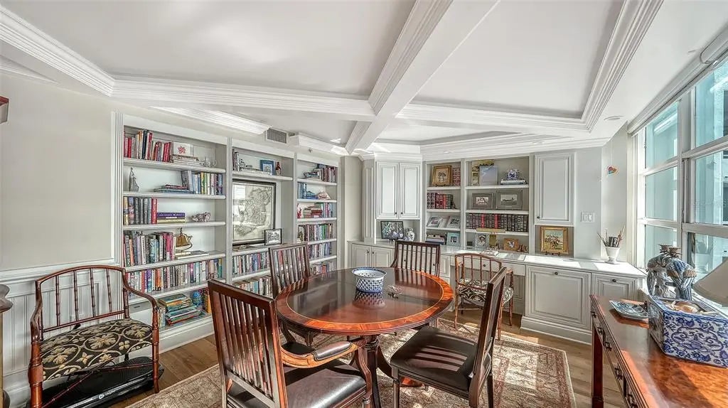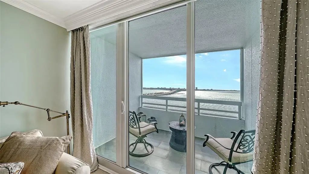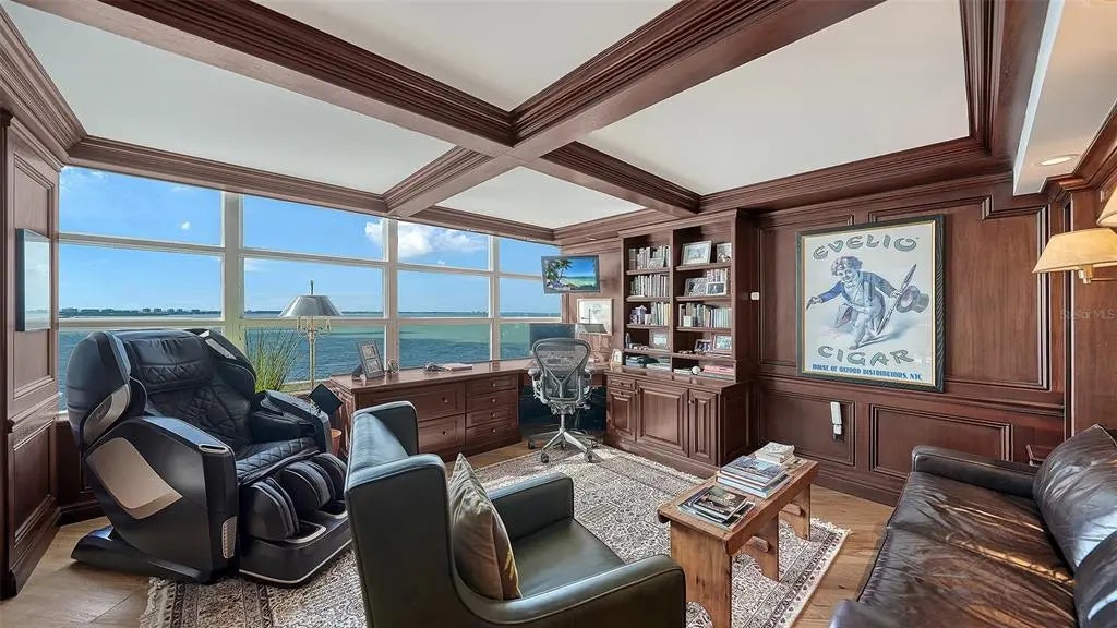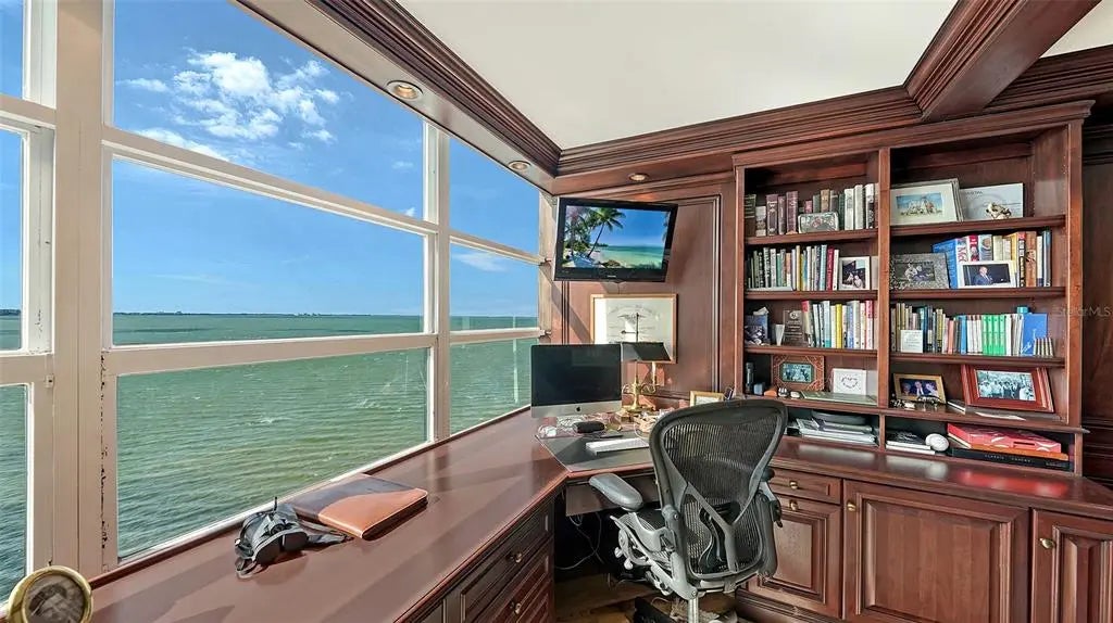 18th-Floor Luxury with Panoramic Bay Views: Unobstructed Sarasota Bay views await from this 18th-floor double residence—one of a kind in Condo on the Bay. With nearly 3,300 sq. ft. of refined living space, two balconies, and two garage spaces, this home combines rare scale, sophistication, and breathtaking vistas. The expansive layout features three bedrooms, three baths and a bonus room--all framed by sweeping water views. The gourmet kitchen boasts granite countertops, custom cabinetry, and premium paneled appliances. Refined details include hardwood floors, crown moldings, coffered ceilings, custom woodwork and wine refrigeration. The primary bedroom includes two large walk-ins and its own sunset balcony. Set within a 24-hour guard-gated community with a concierge receptionist, residents enjoy two bayfront pools, fitness centers, tennis and pickleball courts, concierge service, a social lounge, and rentable boat docks. Perfectly positioned in downtown Sarasota—steps from The Bay park, the Van Wezel Performing Arts Hall, the Ritz-Carlton, St. Armands Circle, and the soft sand of Lido Beach—this is luxury coastal living at its finest.