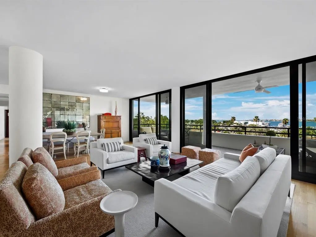 Elevate Your Lifestyle at Bay Plaza — A Rare Corner Gem in the Heart of Sarasota. Step into refined luxury with this expansive and elegant condominium in the highly coveted Bay Plaza. Perched on the 4th floor, this stunning corner residence offers sweeping views of the bay, marina, and downtown skyline — all from two private terraces above the treetops, creating a serene escape from the energy of the city below. One of the largest two-bedroom plus study layouts in the building, this residence enjoys an open and airy floor plan, with nearly 9-foot ceilings, impact-rated windows and sliders, and timeless architectural design by renowned Sarasota School architect Tim Seibert. Built in 1982, Bay Plaza blends classic elegance with modern comforts. A spacious foyer welcomes you into a 20' x 27' combined living and dining area, featuring warm oak wood floors and two sets of triple-glass sliders that open to a generous terrace — perfect for entertaining or watching the fireworks over the bay on the Fourth of July. The kitchen layout is designed for both function and flow and includes an abundance of counter and cabinet space. A separate laundry room offers extra storage and convenience. The two private terraces invite morning coffee or sunset cocktails surrounded by nature — a true luxury in downtown living. Bay Plaza offers an unmatched lifestyle with 5-star amenities, including: 24-hour valet parking & concierge (each with call button), Full-time on-site management and maintenance, Fitness center with locker rooms, sauna, and steam rooms, Lap pool, hot tub, EV charging stations, Elegant lobby with grand piano Media room, party/catering kitchen, card & board rooms, Seasonal and bike storage, Pet friendly. Located on exclusive Palm Avenue, you're just steps from Sarasota’s finest dining, boutique shopping, cultural attractions, and the waterfront. Walk the Ringling Bridge, join a Bayfront yoga class, or hop on the Bay Runner Trolley for a day at Lido Beach or a visit to St. Armands Circle. The building is impeccably maintained, and the association is known for being proactive and well-managed. Don't miss the opportunity to live in one of Sarasota’s most prestigious addresses — Bay Plaza — where luxury, location, and lifestyle come together seamlessly.