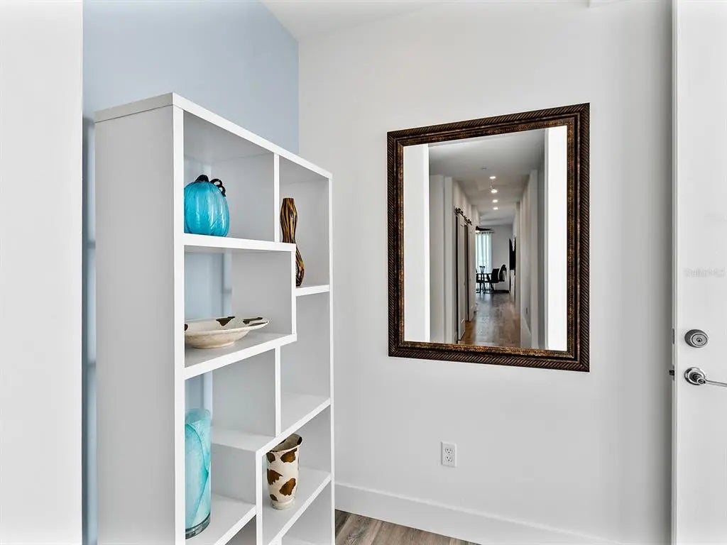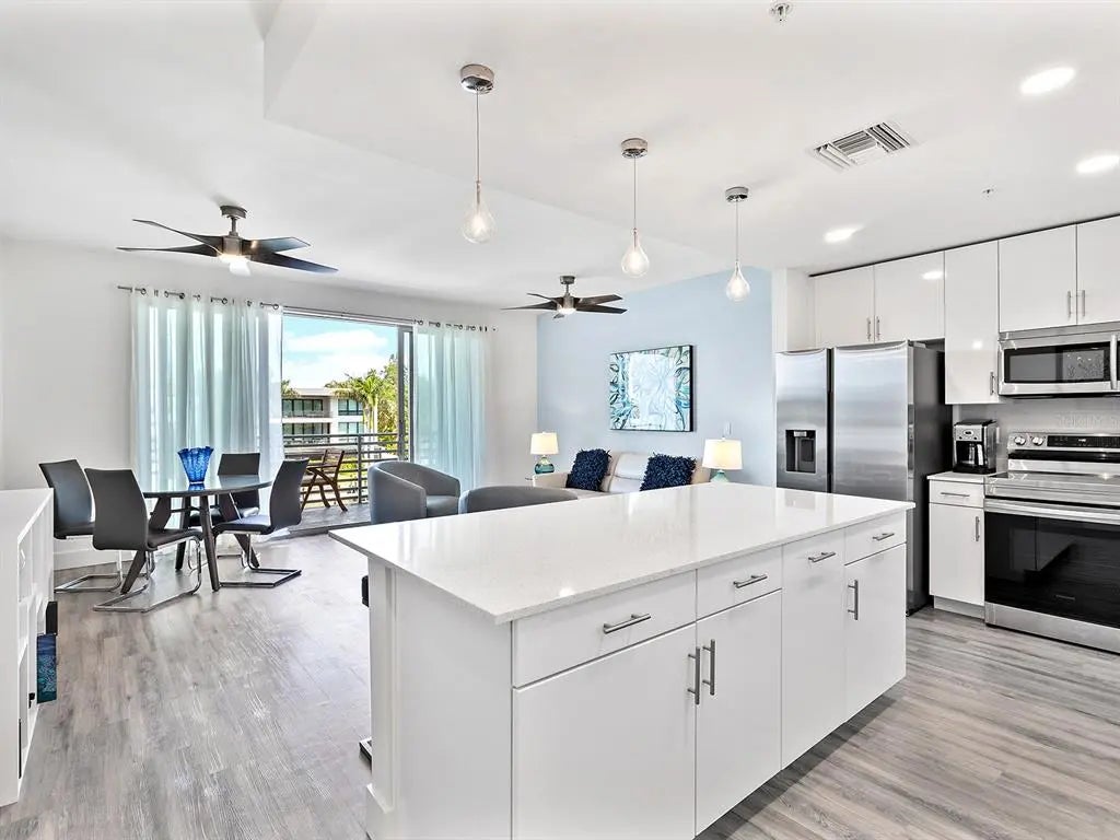 Lowest priced unit in The Strand with direct open water views! Experience waterfront luxury with direct water views and boating lifestyle at The Strand. With over 1,300 square feet, this modern turnkey-furnished unit, completed in 2022, offers unparalleled views and amenities. Great value expansive end unit features hurricane-rated sliding glass doors, showcasing breathtaking water views and vibrant wildlife. Inside, the kitchen, dining and living areas are designed for elegance and functionality. Upgraded glossy white cabinets and quartz countertops complement a spacious island with modern lighting and breakfast bar. The great room offers two sets of sliding glass doors flowing to the large balcony for entertaining or casual gatherings while overlooking amazing sunsets and water views. The primary bedroom boasts a large walk-in closet with custom organizers and a luxurious en-suite bath with upgraded tile, quartz countertops and a glass shower door. A versatile den with barn doors can serve as a second bedroom or office, complete with large triple closet and a pullout sofa. Modern amenities throughout, including luxury vinyl plank flooring, stylish lighting fixtures, Alfa-organizing systems in all closets, impact glass windows and doors, completely turnkey furnished with high-end furnishing including flat screens, large laundry room with added storage cabinet, upgraded ceiling fans and light fixtures, and more. Great unit with a seven-day rental minimum. The Strand offers more than just a home, it’s a vibrant community with pet-friendly amenities, a resort-style heated pool and spa, a well-equipped gym and even car charging stations. Enjoy community gas grills, a gas fire pit and convenient access to a floating dock for kayaking. Plus, with weekly rentals allowed, it’s an excellent choice for full-time residents, part-time dwellers or investors alike. Near Sarasota’s best waterfront parks and just minutes from downtown, St Armands, Lido Beach, restaurants, entertainment venues and parks. The Strand combines luxury living with easy access to beaches, dining, cultural venues and outdoor activities. Whether you’re seeking a permanent residence or a vacation retreat, this is an opportunity to indulge in Sarasota’s renowned lifestyle. Don’t miss out on the chance to make The Strand your new home and schedule your showing today. Owner is a licensed REALTOR® in Florida, and the property is not homesteaded.