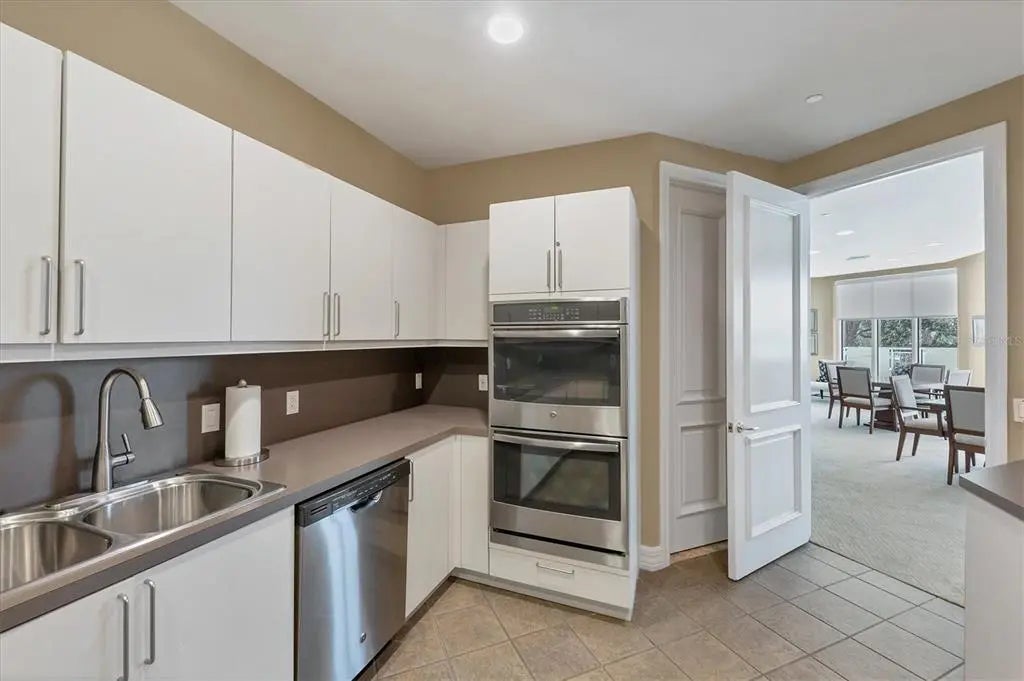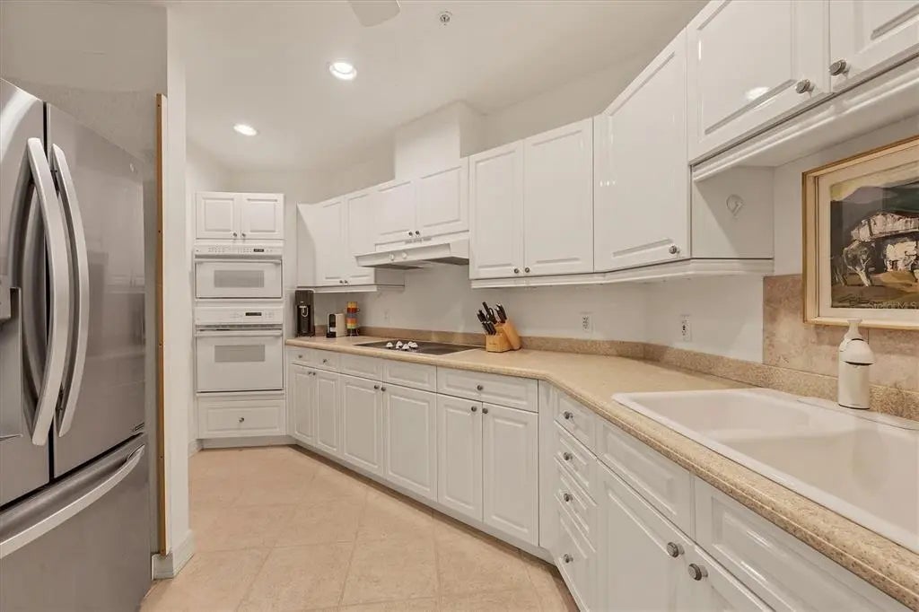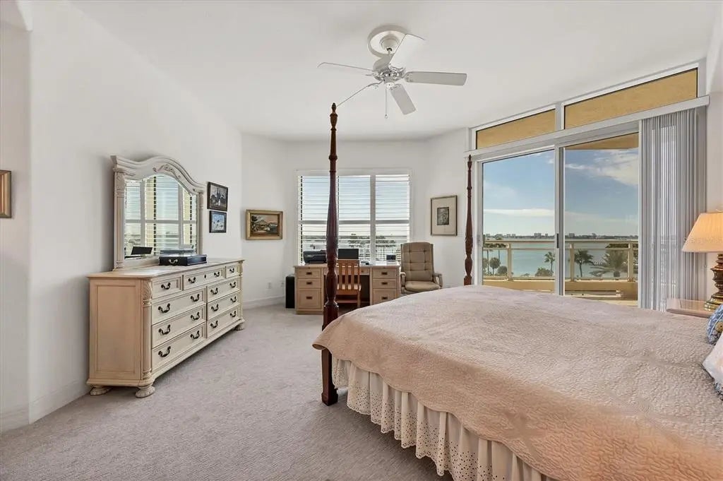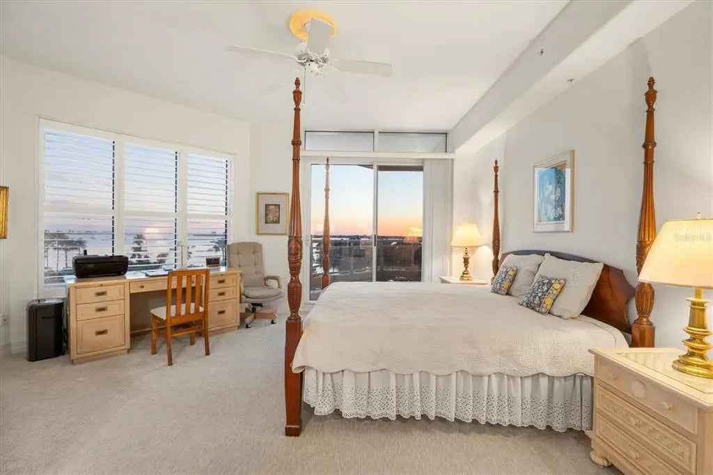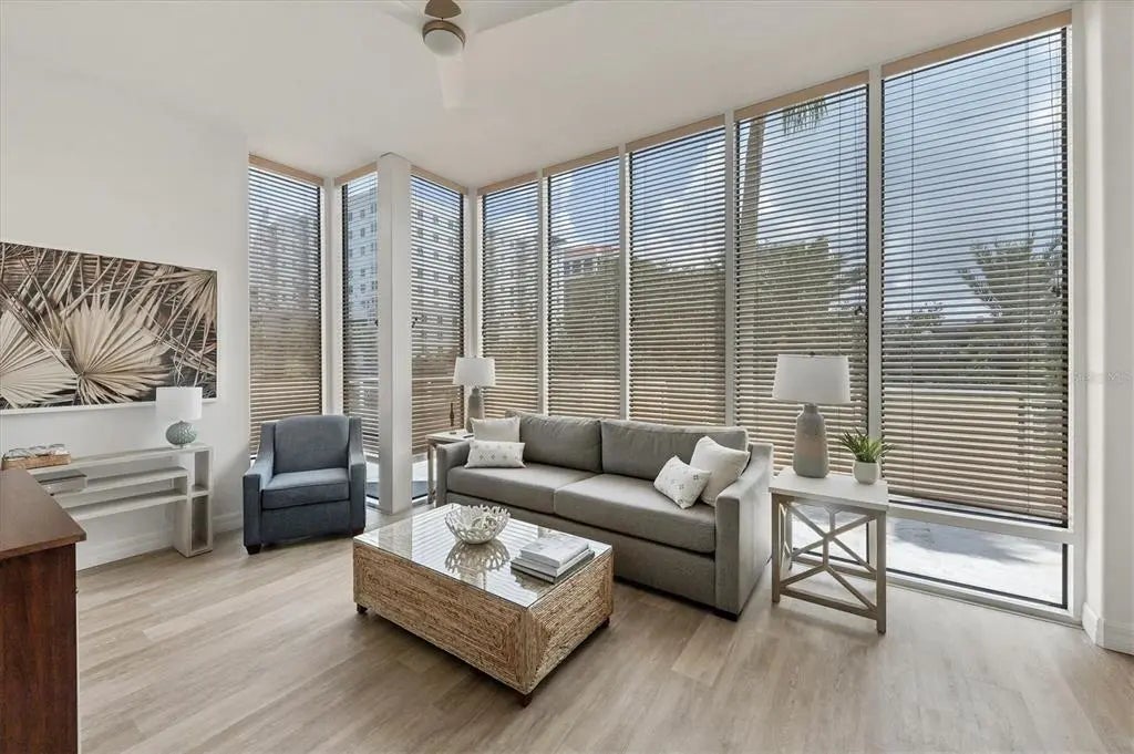 Set within Sarabande, one of downtown Sarasota’s most distinguished bayfront addresses, this third-floor residence blends comfort, functionality, and the opportunity for thoughtful modernization. The elevator opens directly outside the front door, leading into a spacious layout designed to capture Sarasota’s most breathtaking sunsets and sweeping views across Sarasota Bay. Inside, the great room is bright and inviting, with sliders opening to a private terrace and transom windows that frame the bay and beyond. The kitchen features solid-surface countertops, white cabinetry, and a generous eat-in nook, creating a bright and practical space for everyday living or casual entertaining. The primary suite offers two walk-in closets and an en-suite bath with a walk-in shower and vanity area, while the guest bedroom, with floor-to-ceiling windows and plantation shutters and a connecting Jack-and-Jill bathroom, ensures privacy and comfort. A den with French doors provides flexibility for an office or media space. Tile flooring flows through the main living areas, complemented by carpet in the bedrooms and den. The laundry room includes cabinetry and a utility closet for added convenience. The residence has been exceptionally maintained and offers a clean, livable foundation for a new owner to personalize. Beyond its walls, this home’s appeal lies in its setting within one of Sarasota’s premier luxury towers, steps from downtown dining, cultural venues, and the waterfront Bayfront Park. Sarabande’s reputation for prestige, full amenity suite including guest suites, and location makes this residence an extraordinary opportunity to enjoy Sarasota’s coastal city lifestyle, enhanced by a front-row seat to its most unforgettable sunsets.