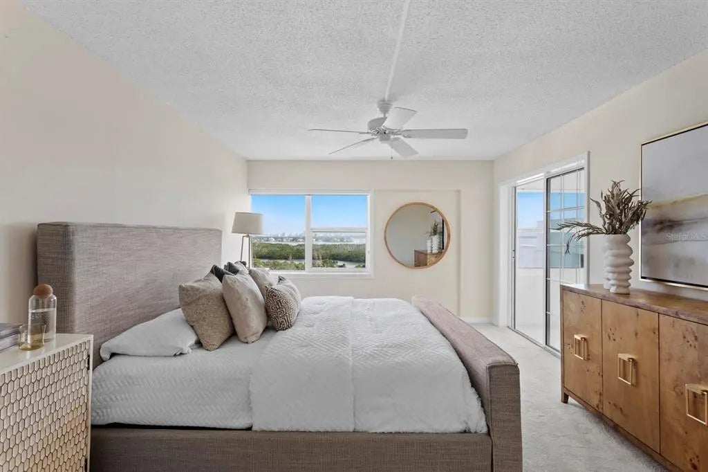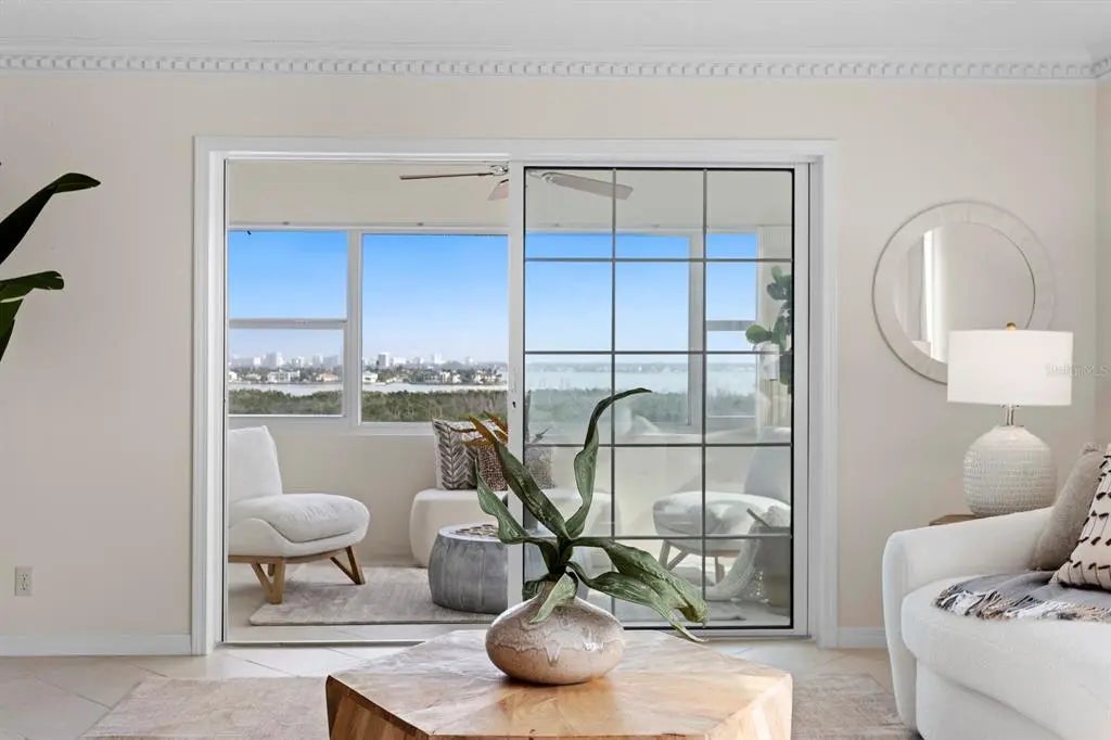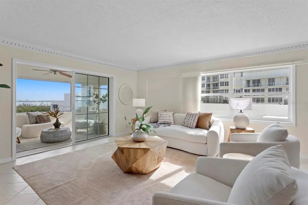 Welcome to your direct beachfront 2 bedroom, 2 bath condominium located in the highly desirable Key Tower South on Lido Key featuring panoramic views of the Bay, Ringling Bridge, Sarasota City skyline and Gulf of Mexico. Enter through the front door of this corner unit into a welcoming foyer, ideal for showcasing large-scale artwork, where the eye is immediately drawn toward the light-filled main living and dining area beyond. The open layout is beautifully accented by hand-laid dentil and picture frame molding, creating a sense of timeless refinement. The dining room is perfectly positioned to capture the mesmerizing Gulf view and sunsets, while the adjoining enclosed Florida Room reveals sweeping vistas of Sarasota Bay, the Ringling Bridge, and the Downtown skyline—a front-row seat to dazzling fireworks and twinkling city lights. The kitchen combines classic craftsmanship with thoughtful design, featuring wood cabinetry, granite countertops, and a peninsula with generous seating for casual dining. Tile flooring flows throughout the main living spaces, enhancing the coastal ease of this well-appointed home. The primary suite is a serene retreat, offering gorgeous water views, new plush carpeting, and private access to the Florida Room. A spacious walk-in closet provides ample storage, while the en suite bath showcases granite countertops and a tub-shower combination. The guest bedroom is equally inviting, featuring new carpet, a walk-in closet, and stunning views that mirror the home’s tranquil setting. Additional conveniences include a dedicated covered carport and private storage locker located in the shared laundry room. Key Tower South is a meticulously maintained beachfront community boasting 201 feet of pristine Gulf frontage. Residents enjoy a heated beachside pool with an expansive sundeck for soaking in the endless horizon, as well as direct access to the sugar-white sands just steps from home. The first-floor community spaces were fully remodeled in 2025, offering a stylish and welcoming lobby, fitness room, library, and social room with a catering kitchen—perfect for gatherings. Additional amenities include saunas with showers, bicycle storage, and on-site management ensuring effortless living. Set on the quiet, walkable streets of Lido Key, the neighborhood offers a relaxed, beachside lifestyle. Spend your days exploring South Lido Park’s nature trails and kayak launches, strolling to the boutique shops and cafés of St. Armands Circle, or crossing the iconic Ringling Bridge into downtown Sarasota’s vibrant cultural and dining scene. Even SRQ Airport is just minutes away, adding convenience to this idyllic coastal address.