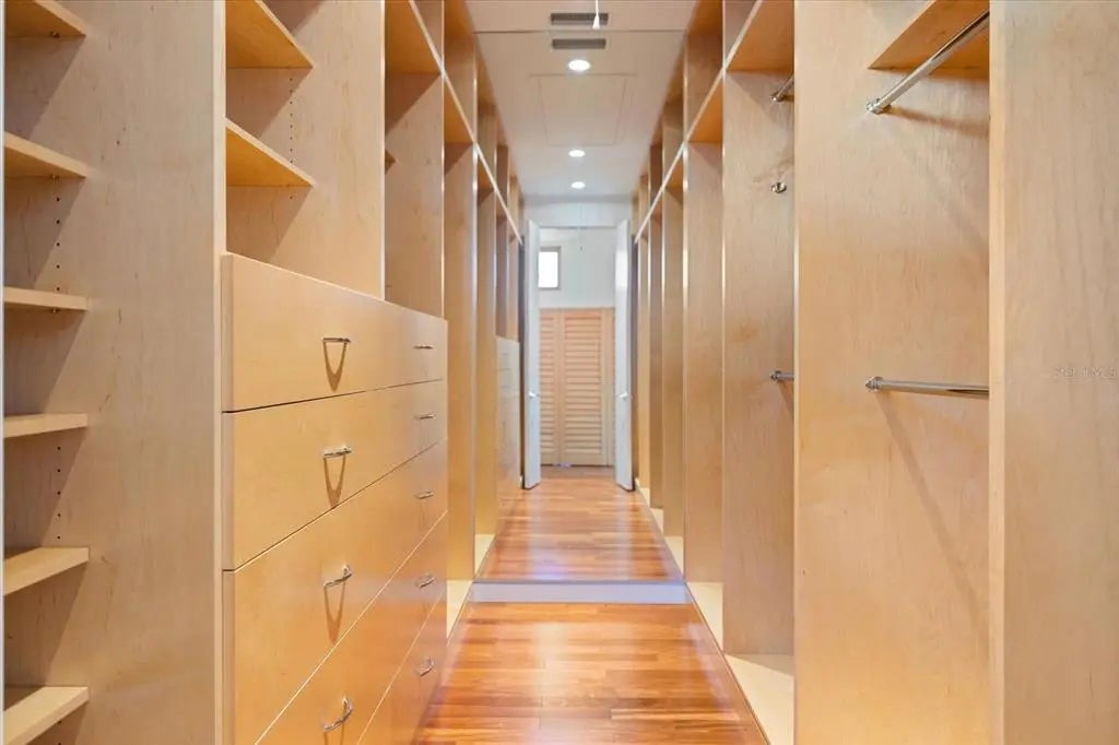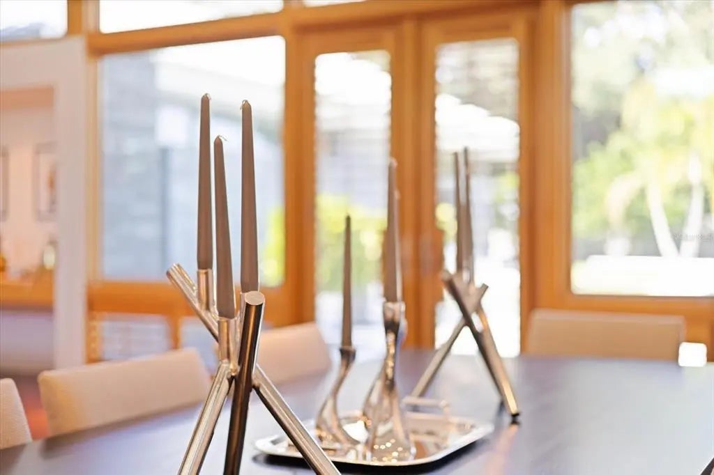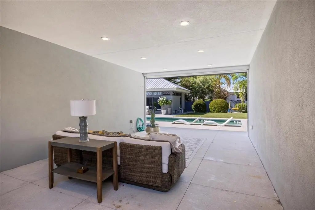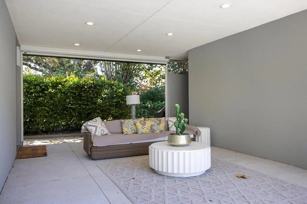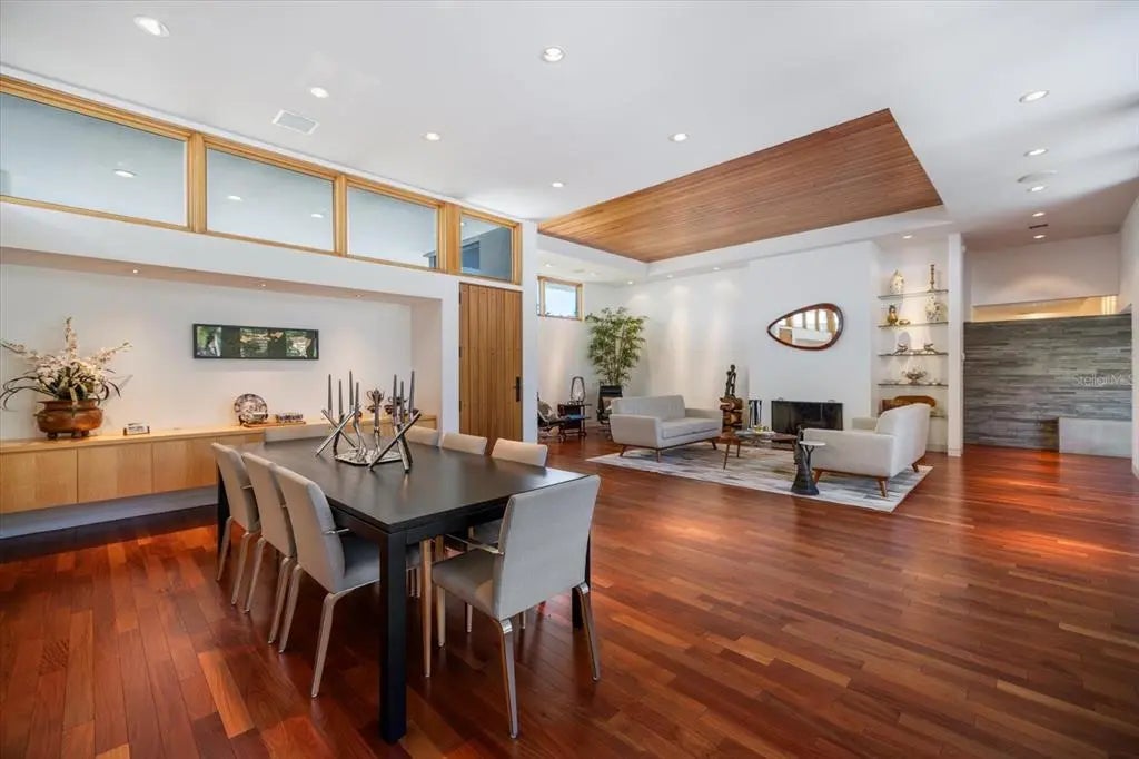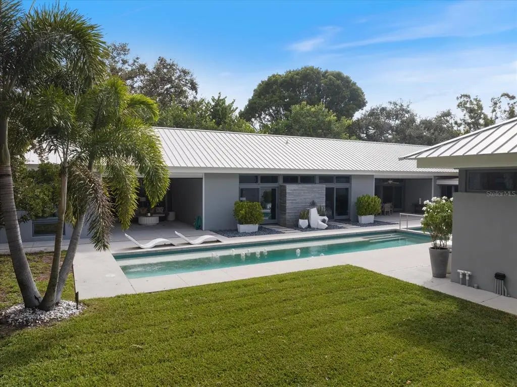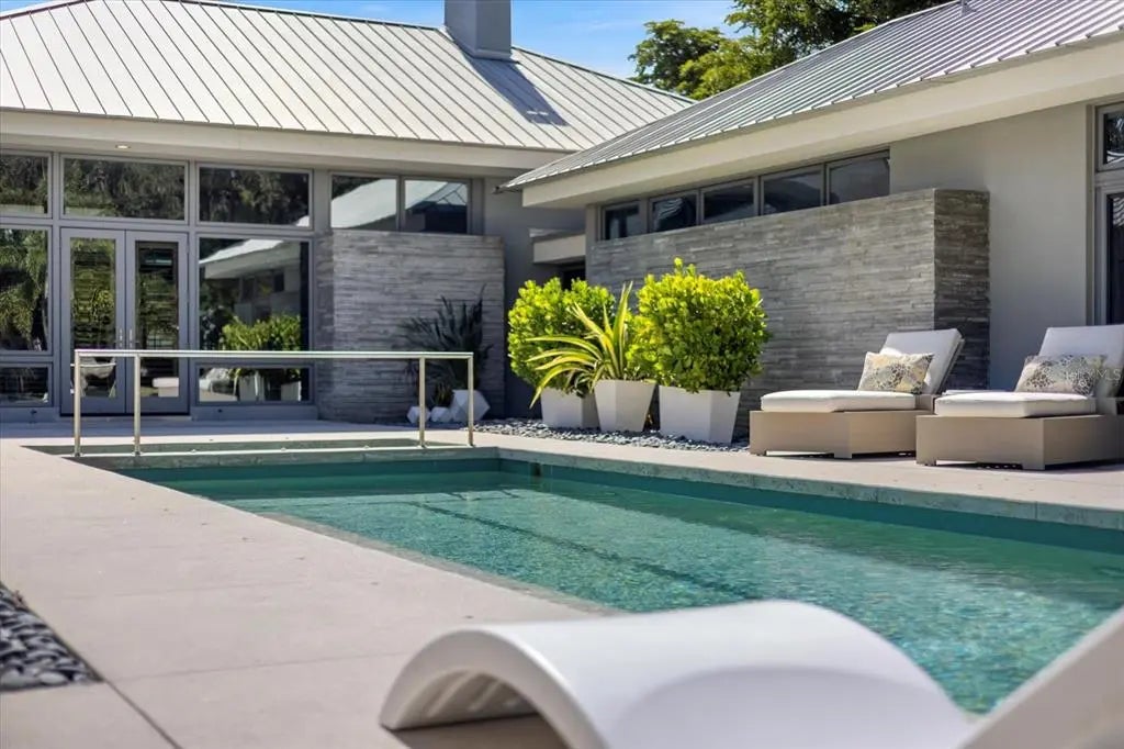 Nestled along Cherokee Drive in the prestigious Cherokee Park neighborhood, this residence enjoys a premier setting on one of Sarasota’s most sought-after streets, renowned for its graceful oak canopy and classic west-of-the-trail charm. This residence embodies the perfect balance of modern architecture, natural materials, and tranquil privacy. Designed by award-winning architect Guy Peterson and constructed by master builder Pat Ball, the home delivers a rare combination of architectural pedigree and enduring craftsmanship. Positioned on a gracious, estate-sized parcel surrounded by lush greenery, the home’s U-shaped floor plan wraps around its showpiece, a 45-foot crystal-clear pool with integrated spa, creating a seamless indoor–outdoor living experience that defines the Sarasota lifestyle. Outside, the stone pathway leading to the custom mahogany front door sets a striking geometric tone. Inside, board-on-board architectural molded concrete accent walls, Santos Mahogany wood floors, and cypress-accent ceilings strike a natural harmony with the home’s sleek, modern lines. Floor-to-ceiling impact-rated Marvin windows flood the interior with light, framing tranquil views of the pool and landscape from nearly every room. The wide-open living and dining area, anchored by a wood-burning fireplace, sets the tone for elegant yet effortless entertaining. The chef’s kitchen features Wolf and Sub-Zero appliances, extensive custom maple cabinetry, and a seamless connection to both indoor and outdoor dining spaces. In the west wing, the expansive primary suite serves as a private retreat with walls of glass overlooking the grounds, complemented by an adjacent executive office for work-from-home convenience. The east wing hosts two en-suite guest bedrooms, each with sliding glass doors opening directly to the pool. A detached guest cabana offers a complete living area, kitchenette, and en-suite bedroom that is ideal for visitors, extended stays, or use as a private art studio or executive home office. Located within Cherokee Park, one of Sarasota’s most established and beloved neighborhoods, this home offers walking distance to Southside Elementary, minutes to Southside Village and downtown Sarasota, and easy access to Siesta Key Beach, just five streets away. The community is known for its family-friendly gatherings, tree-lined streets, and timeless Sarasota character.