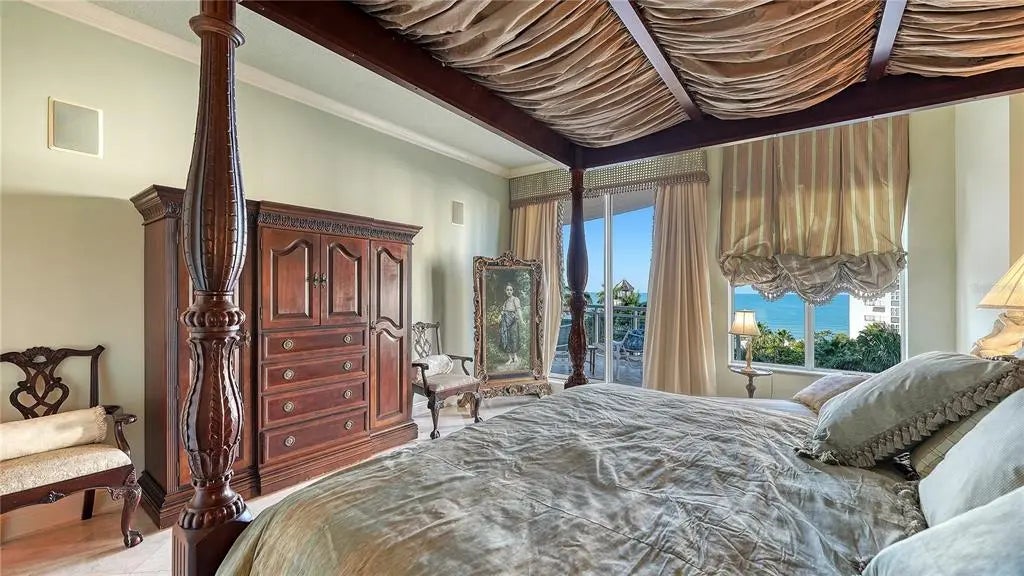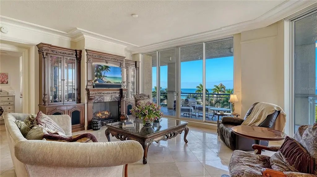 Gulf-Front Luxury at The Beach Residences — Ritz-Carlton Living on Lido Key! Ideally located on the 5th floor of The Beach Residences at the Ritz-Carlton, this expansive three-bedroom Estate residence showcases sweeping Gulf views and the signature lifestyle only Ritz-Carlton ownership provides. With 3,300+ square feet of interior living space and more than 600 square feet of private terrace, this property delivers coastal elegance and remarkable comfort in one of Sarasota’s most exclusive beachfront addresses. A private elevator opens to a welcoming foyer and gallery hall, revealing a dramatic Grand Salon framed by walls of glass and tranquil Gulf panoramas. Marble flooring, refined architectural details, tray ceilings, and custom built-ins elevate the sense of scale and serenity throughout. Designed for effortless entertaining, the open living and dining areas connect seamlessly to an oversized Gulf-facing terrace—perfect for sunset gatherings or quiet mornings with ocean breezes. The gourmet kitchen pairs functionality with style, offering solid-wood cabinetry, stone counters, a center island, and high-end stainless appliances including built-in ovens, gas cooktop with grill, wine refrigeration, and large pantry. A cozy breakfast area with floor-to-ceiling glass makes every meal a waterfront moment. The primary suite is a private retreat, complete with dual walk-in closets, morning kitchen, terrace access, and a luxurious en-suite bath featuring dual vanities, soaking tub, large shower, and private water closet. Two additional guest suites, one is a generous master-sized suite, provide privacy for family and visitors. Additional features include a spacious laundry room, hurricane-rated glass throughout, custom built-ins, and a gas fireplace. Exclusive to this residence, two premium parking spaces and a secure storage unit are included. The available Gold Ritz-Carlton Members Club membership further enhances this offering, providing access to premier golf, spa, and beach club facilities (refundable deposit required). The Beach Residences delivers an unmatched amenities experience: 24-hour concierge, resident services, oceanfront pool and spa, outdoor grills, spacious social lounge, media room, billiards, library, full gym, sauna, massage rooms, and elegant guest suites for overflow accommodations. A private, resident-only beachfront path invites direct access to pristine sand and turquoise waters. Ideally positioned on prestigious Lido Key, the location blends coastal tranquility with immediate convenience. Enjoy nearby dining on St. Armands Circle, boutique shopping, luxury spas, and walkable beach cafes. Sarasota’s celebrated arts and culture—including the Van Wezel, Sarasota Opera House, Orchestra, The Bay Park, and downtown galleries—are just minutes away. Marina Jack, Selby Gardens, Burns Court, and the city's waterfront promenade offer endless recreational options. A rare opportunity to own in one of Florida’s most refined seaside communities, this Gulf-front residence is more than a home—it's a private sanctuary shaped by world-class service, breathtaking vistas, and the effortless elegance only the Ritz-Carlton brand can deliver.