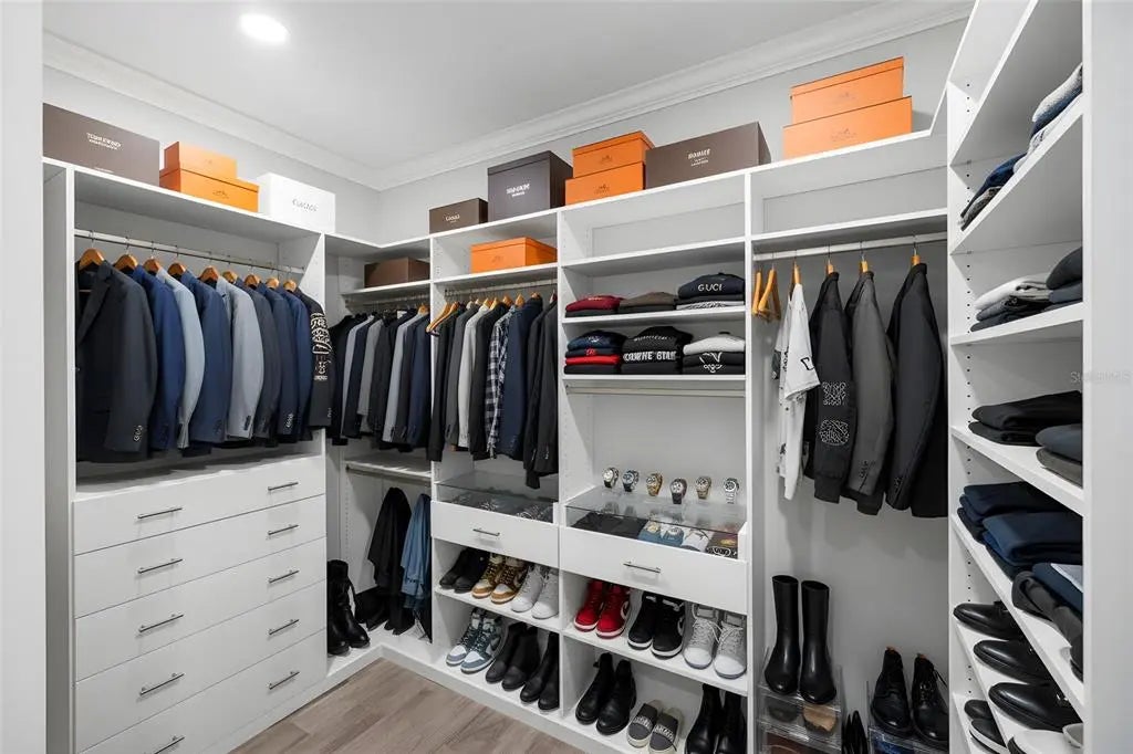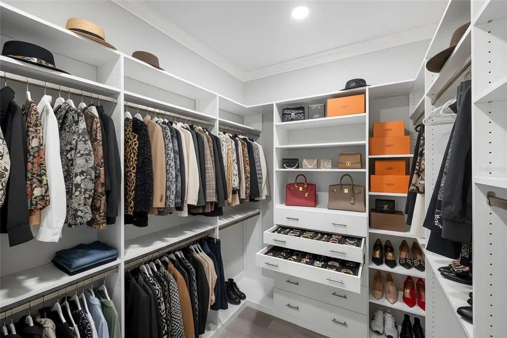 - Interior FeaturesBuilt-in Features, Ceiling Fan(s), Coffered Ceiling(s), High Ceilings, Kitchen/Family Room Combo, Open Floorplan, Primary Bedroom Main Floor, Solid Wood Cabinets, Split Bedroom, Stone Counters, Thermostat, Walk-In Closet(s), Wet Bar