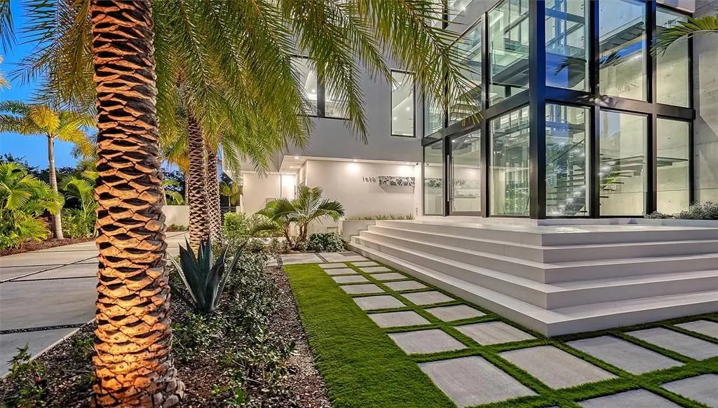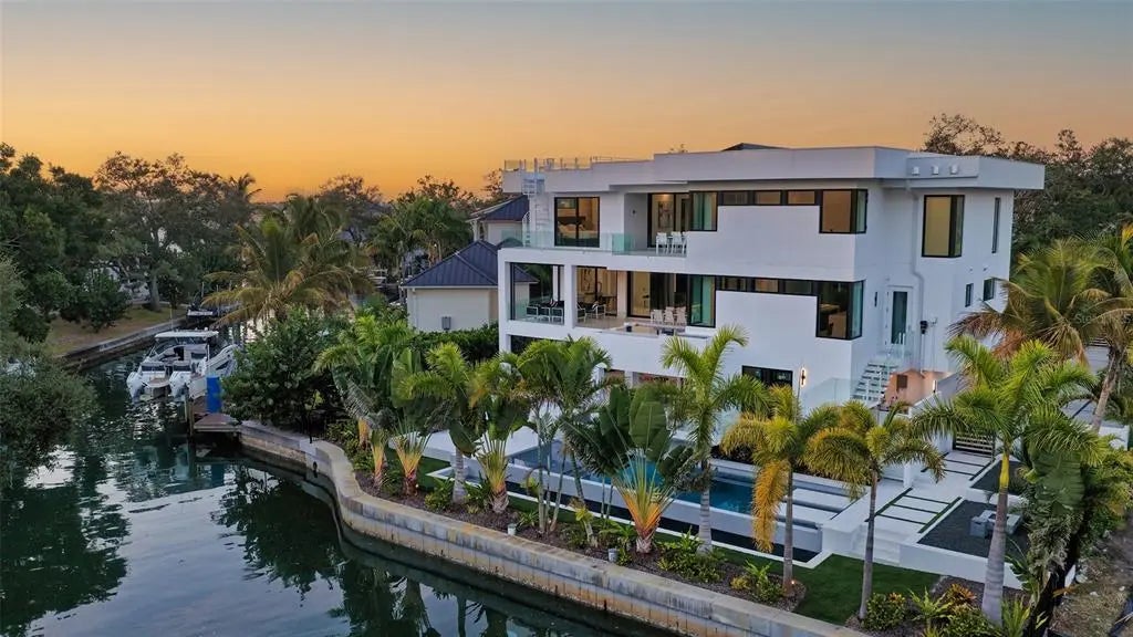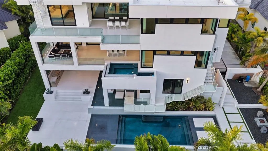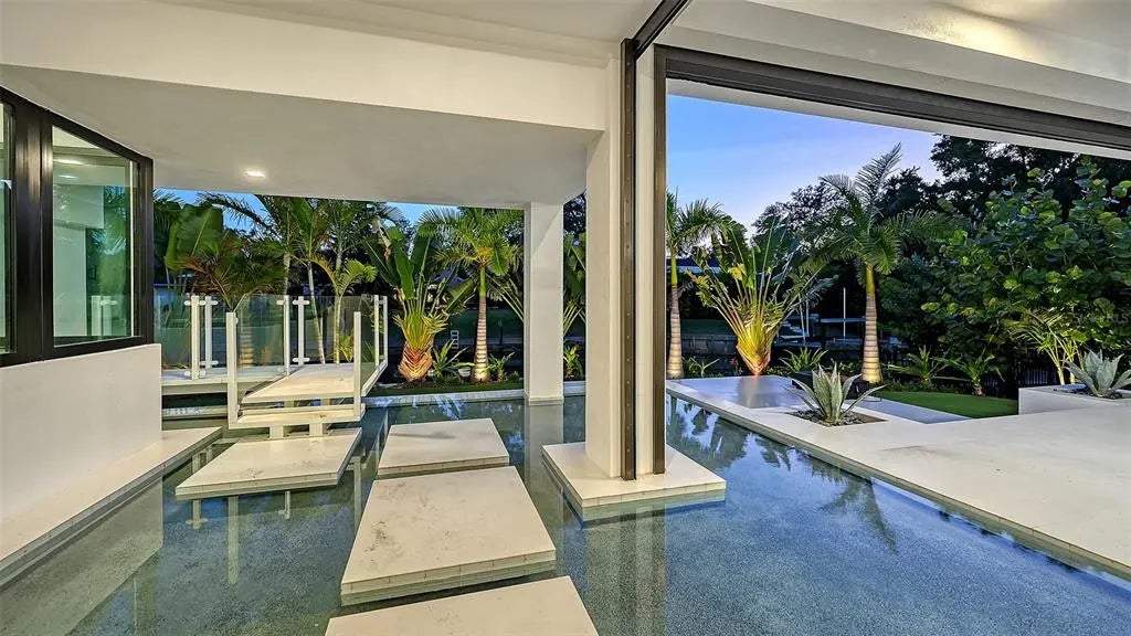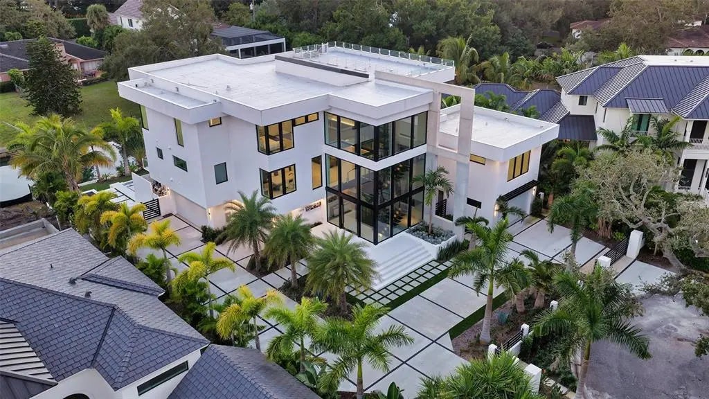 Stunning waterfront three story, coastal modern, single-family waterfront home is the perfect blend of comfort and luxury located in the treasured Cherokee Park neighborhood. Nestled on a street adorned with majestic oak and canopy trees, this exceptional property offers both privacy and grandeur. As you approach this generous lot, you'll be greeted by an electric gate entryway. Choose to park in either the detached two-car garage beneath the guest house or the hidden 6-8 car garage on the side of the house. The garage level features a private gym with a bathroom and an extraordinary outdoor living space that includes both covered and uncovered areas, a stainless steel outdoor kitchen, and a fire pit. Entering the home, you're captivated by a glass box foyer entryway with a custom staircase and state of the art glass elevator. There is also an entryway through the 6+ car garage leading to the elevator. The spacious second-floor living area boasts an open floor plan perfect for any event. The elegant great room features a custom glass floor and firebox, leading to a beautiful open kitchen with custom cabinets, waterfall stone countertops, and Subzero and Wolf appliances. Adjacent to the kitchen is a bonus room and an open yet private dining room, ideal for a wine collector with its floor-to-ceiling glass wine cellar that doubles as an art piece. Behind the kitchen cabinetry, you'll find a separate sizable pantry and laundry room. This floor also features a beautiful balcony accompanied by a glistening hot-tub/dipping pool that waterfalls into your main pool. Make your way to the third story to find 4 on suite bedrooms and a second laundry room. The primary bedroom offers an expansive layout that seamlessly blends comfort and elegance. The true highlight is the gorgeous balcony overlooking the pool that leads to a staircase up to the breathtaking rooftop. From here, you will enjoy panoramic views of the spectacular Sarasota. Whether you’re hosting a sunset soiree or savoring peaceful morning coffee, this rooftop oasis provides an extraordinary vantage point. This seamless indoor-outdoor flow and the captivating scenery make this property a true gem for those seeking both luxury and tranquility in a prime location.