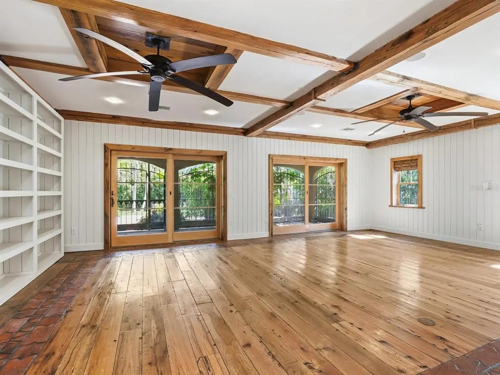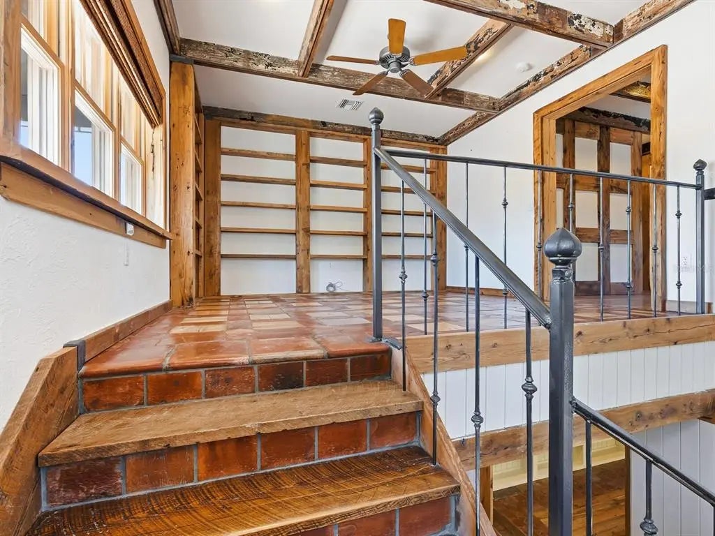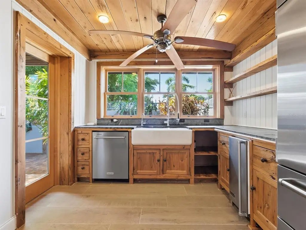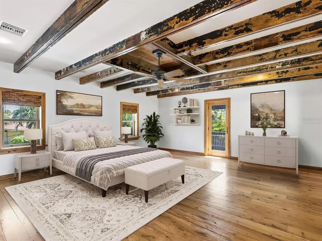 One or more photo(s) has been virtually staged. Hidden behind lush plantings is this beautifully redesigned and amazingly private two-story home boasting over 3900 sq ft of interior living space all moments away from the shops & cafes of St. Armands Circle, the beaches of Lido Key & downtown Sarasota. As you enter this hideaway of peace and tranquility you are greeted by a fountained courtyard garden through gates of aged iron. From there the interiors will call to the imagination as it evokes the visions of a bastide in Provence or a country home in the hills of Scotland. Imperfection is curated and intentional. Rooms flow easily enhanced by wide plank reclaimed wood floors, white ship lap walls framed with wood accents, reclaimed wood beams artfully placed throughout, thick roughhewn interior doors with patinaed hardware, an eclectic kitchen design with soap stone counters, side tables and oven backsplash, a double farm sink, a new 10- burner dual fuel gas range with two ovens, a Sub-Zero fridge with a glass door & four bottom draws to name just a few of the many appealing details. A grand front room leads to a beautiful staircase of wood and clay tiles with a landing at the center of the house leading you to the primary suite, encompassing the entire second floor. Here we have a library/seating room lined with bookshelves, roughhewn wide plank wood floors, a spacious bedroom with a Julliet balcony, two walk-in closets and bath with a tub, large quartz shower with horizontal subway tiles, dual shower heads & handheld and two vanities with surface mount sinks and quartz counters sitting on retrofitted antique cabinets. There is a loggia spanning the width of the house opening on to an exceptionally large backyard bursting with lush tropical foliage. The nearly 12,000 sq ft lot is 160 ft deep. Intricately laid clay tiles form multiple walkways and an extensive lounging area. Beautifully weathered custom wrought iron gates abound not only on the drive entry but also on the courtyard and on the arched window openings of the loggia. Aged clay tiles surround windows and doors, even the garage door. Custom crafted metal awnings adorn the windows. Exterior custom metal lanterns and sconces echo the same intentional aging. There are two tankless water heaters, a whole house water purifier and a well for the yard. This home will captivate you.