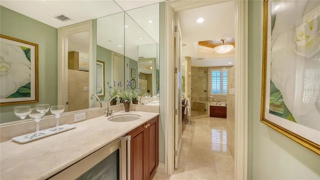Set high above the sand on the seventh floor of Orchid Beach Club, this executive Lido Key beach residence showcases sweeping Gulf-to-bay and downtown Sarasota views the moment you step inside. Designed for elevated coastal living, the nearly 3,000-square-foot layout offers three bedrooms, three full baths, private elevator access, turnkey furnishings option available, and multiple terraces that create a true indoor-outdoor lifestyle. A residents-only elevator opens directly into your private lobby, where double iron filigree doors reveal a sophisticated interior filled with natural light. High cove ceilings with inset lighting, custom millwork, wood paneling, motorized window treatments, and thoughtfully updated finishes establish a sense of modern elegance throughout the home. Walls of impact glass capture unobstructed Gulf, bay, and city vistas, enhancing every living space. At the heart of the residence, the gourmet kitchen blends design with function, offering quartz countertops, sleek cabinetry, an island with seating, breakfast bar, and top-tier Bosch and Dacor appliances—including a six-burner gas range and warming drawer. The kitchen flows effortlessly into the great room and dining area, creating an ideal setting for hosting or relaxed everyday living. The Gulf-front primary suite serves as a peaceful retreat, complete with terrace access, two walk-in closets, and a beautifully renovated bath with marble-inspired finishes, dual vanities, soaking tub, and large shower. Two private guest suites—positioned in a split layout—provide comfortable accommodations for visitors, including one with terrace access and another with its own secluded balcony. Three terraces extend the living experience outdoors. The expansive bay-facing terrace offers a full summer kitchen with new (2024) built-in gas grill, large dining area, and generous seating space—perfect for sunset dinners or morning coffee overlooking the water. The Gulf-facing terrace is reserved for the primary suite and third bedroom, while the second guest suite enjoys its own private balcony. Orchid Beach Club is an exclusive Gulf-front community of only 54 residences, known for concierge-level service and resort-style amenities. Residents enjoy a secure building, 24-hour gated entrance, attentive concierge staff, and a beautifully appointed clubhouse with social room, library, billiards, catering kitchen, and lounge. The wellness center includes a fitness facility, sauna, spa room, and massage services. Outdoors, the Gulf-side pool and spa are surrounded by a spacious sun deck, with direct access to a private stretch of Lido Beach’s soft sands and turquoise water. Ideally situated near St. Armands Circle, Longboat Key, and downtown Sarasota, the location offers immediate access to fine dining, boutique shopping, theaters, galleries, boating marinas, and cultural venues including the Van Wezel Performing Arts Hall and Sarasota Opera House. With world-class amenities, coastal scenery, and a premier waterfront address, this Orchid Beach Club residence delivers the best of Lido Key living.