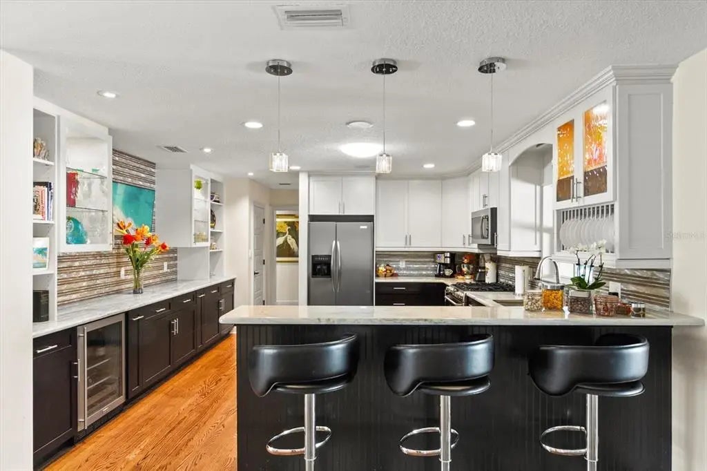 This revitalized 2,550 sq' (+/-) single level home is in coveted Harbor Acres and within walking distance to the quaint Southside Village, Sarasota Bay and the energizing downtown area. Bistros, gourmet markets, art galleries and all things exciting will be yours to explore. With remodeling beginning in 2016 to Miami Dade Hurricane code regulations, improvements include the addition of a 750 sq' (+/-) Primary Suite with full bathroom for one and a 3/4 bath for another, both with walk-in closets thru-outs, modern lighting and plumbing fixtures, refurbished oak flooring, granite counters , security system, whole-house stereo speakers, new appliances, 426 sq' screened porch for outdoor entertaining, paver circular driveway with additional parking pull-outs, landscaping and dramatic lighting and a custom made art piece which is also an outdoor water feature. A new roof completed the project in 2022. The plan features a living area, separate dining room and kitchen in the center of the home, which separates the primary bedroom from the additional 2 bedrooms, for privacy. There is a storage building for outdoor accessories, a roomy 2-car, solid structure carport, water well for the sprinkler system and spray foam insulation in the attic. Not too big, not too small, no elevators, no shared parking, optional HOA dues of $125 a year and a one-of-a-kind opportunity, in a once in a lifetime location.