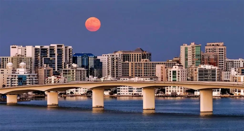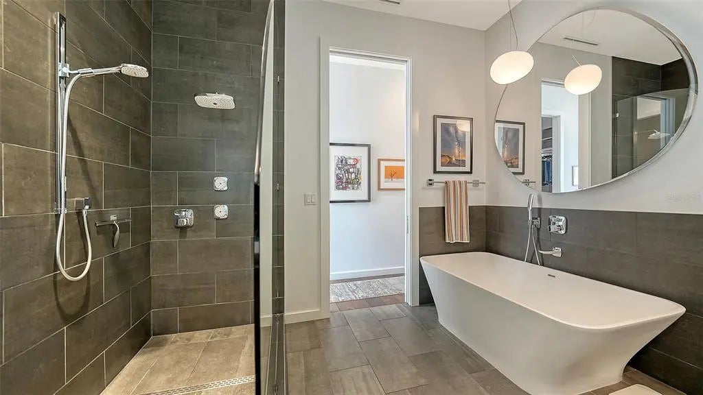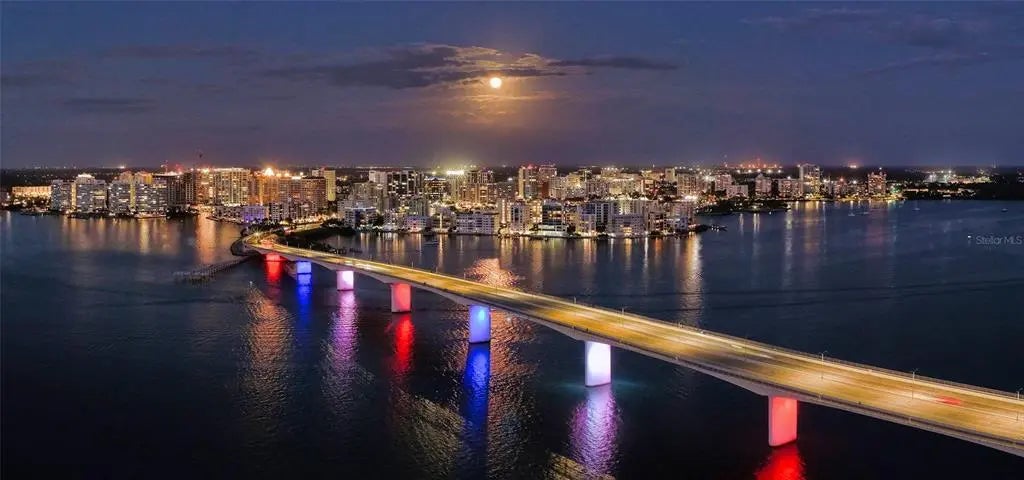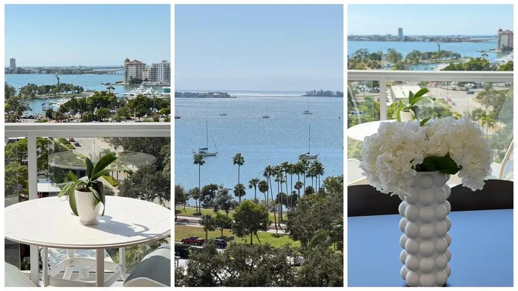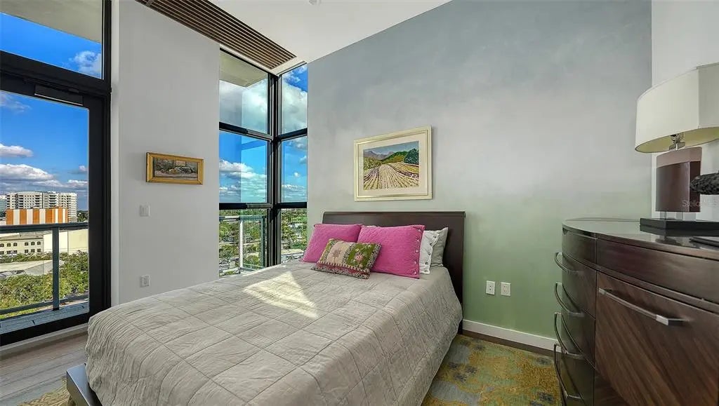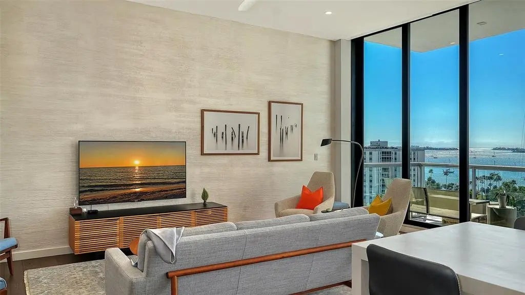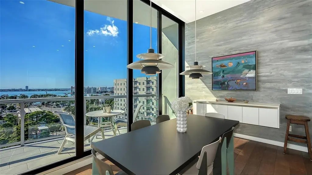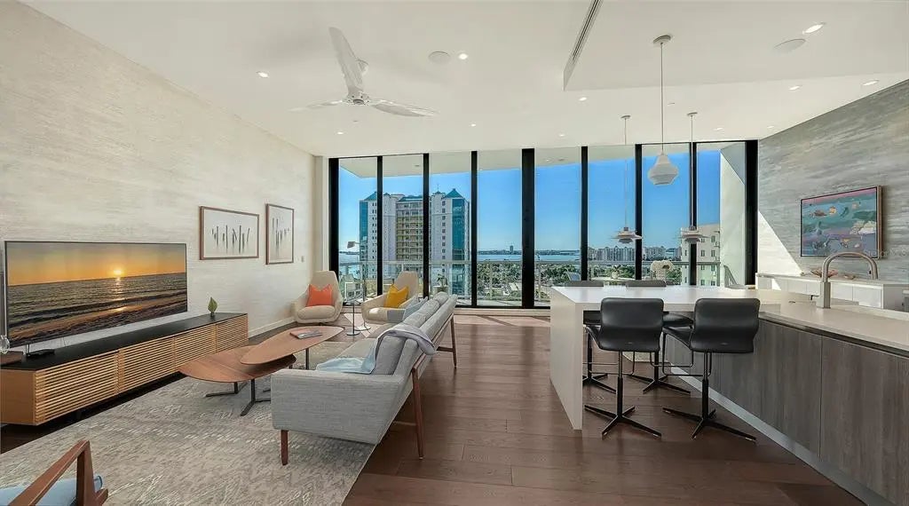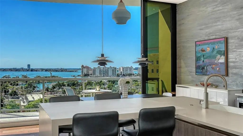 Welcome to Penthouse 3 at Sansara, where urban elegance meets coastal sophistication in the heart of downtown Sarasota. Perched above the vibrant Burns Court district, this coveted residence is located within Sansara’s exclusive 10-story boutique building, home to only 17 private units and mere steps from fine dining, charming boutiques, art galleries, and the stunning Sarasota Bayfront. This residence is being sold turnkey furnished with the exception of artwork. Designed to captivate from the moment you enter, this penthouse showcases floor-to-ceiling windows that frame sweeping views of the bay and city skyline, while soaring ceilings evoke an immediate sense of serenity and openness. European oak hardwood floors, designer and recessed lighting, Sonos sound system, and Lutron Luxury motorized solar roller shades elevate every detail. Contemporary design elements and exquisite finishes seamlessly blend sophistication with comfort. The expansive great room provides a refined backdrop for everyday living and effortless entertaining, highlighted by an incredible retractable wall that creates true indoor-outdoor flow. The gourmet kitchen is a culinary masterpiece with custom European cabinetry featuring motorized automatic opening and closing, pull-out pantry, quartz countertops, designer iridescent glass tile backsplash, and top-of-the-line appliances including a Sub-Zero refrigerator and Wolf 48" gas range. Retreat to the serene primary suite complete with private balcony access, a custom walk-in closet, and a spa-inspired en-suite bath boasting a floating dual vanity, walk-in shower, and freestanding soaking tub. Two additional bedrooms, each with a walk-in closet (one currently used as an office), offer versatility and comfort, complemented by two additional full bathrooms. This highly sought-after gem includes two dedicated private garages with extra storage within the building’s secure, under-building garage. Sansara’s amenity suite delivers resort-style living at its finest: heated saltwater pool and spa, poolside cabana, gas fire pit, outdoor kitchen and grill, private gym, and state-of-the-art 24- hour camera and building access for peace of mind. Escape to the serenity of luxury penthouse living high above the city, at the iconic Sansara.