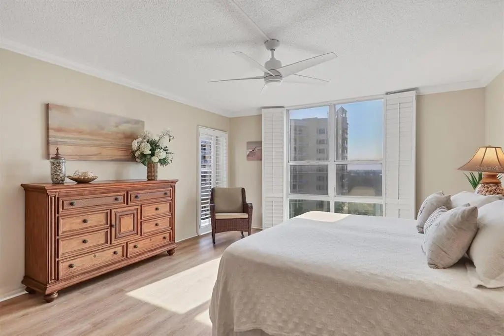 Welcome to Lido Beach Club, one of Lido Key’s most beloved and beautifully maintained Gulf-front communities. Perched on the 10th floor, this 1,421-square-foot residence at 1212 Benjamin Franklin Drive, Unit 1003, delivers beach views of the Gulf of Mexico, Sarasota Bay, and the sparkling coastline beyond — visible from every room. This bright, airy condo offers two spacious en-suite bedrooms, each generous enough to serve as a primary retreat. Luxury vinyl plank and tile flooring run throughout, giving the home a clean, cohesive feel. The open gathering areas are centered around the panoramic scenery, showcased through walls of glass accented by wood-framed sliding plantation panels. Step outside to the 30-foot balcony, wrapped in wrought iron for that timeless coastal touch. From here, enjoy gentle breezes, sweeping vistas, and even a peek at the Ritz-Carlton Beach Club next door. Florida living doesn’t get much finer. The kitchen features granite countertops, a stainless three-door refrigerator, new microwave, and solid cabinetry with pull-out drawers and a pantry. The counter’s peninsula design allows for barstool seating — perfect for casual bites or chatting with company while you cook. A convenient in-unit stackable washer and dryer adds everyday practicality. Both bathrooms have been tastefully remodeled with quartz countertops, integrated sinks, and updated showers with a brand new water heater to ensure you have dependable hot water and energy-efficient comfort for years to come. This tropical oaisis is being sold turnkey furnished. Lido Beach Club itself sits right on the sand, offering a private beach, a beachside pool, tiki tables, grilling areas, and front-row seats to Sarasota’s postcard-perfect sunsets. Additional community features include a large club room perfect for parties and gatherings, fitness center, and recently renovated hallways with a stylish, contemporary look. An on-site property manager rounds out the peace of mind. All of this comes with unbeatable walkability to the world famous St. Armands Circle and a quick hop over the John Ringling Bridge to downtown Sarasota, where dining, theater, arts, and entertainment await.