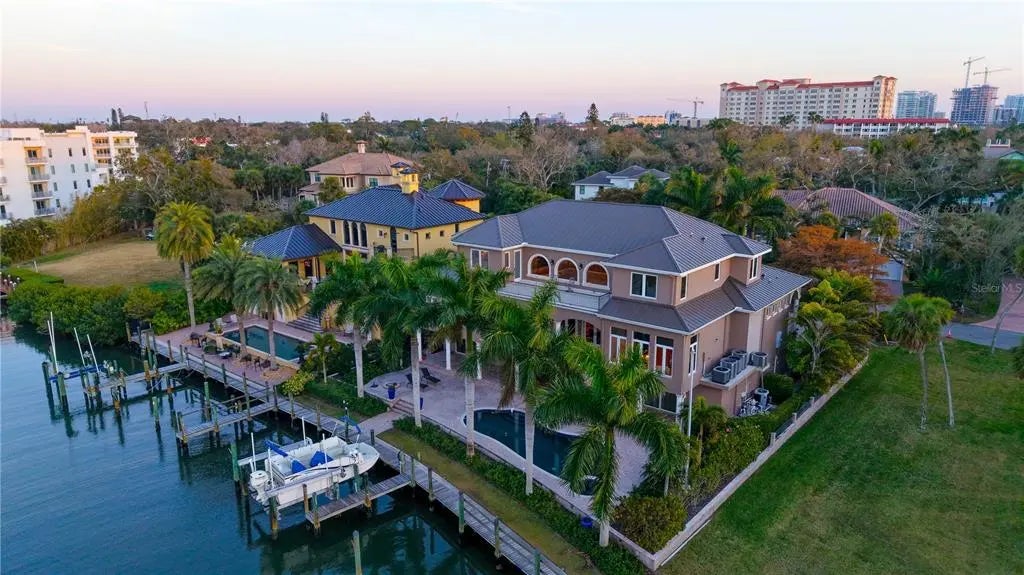 What if your next home gave you private boat access, sunset terraces, and the energy of Downtown Sarasota just minutes away? Located within the gated enclave of Whitakers Landing and less than a mile to downtown, this remarkable waterfront estate rests along the serene waters of Whitaker Bayou with direct access to Sarasota Bay, dockage, and a 16,000 pound boat lift. Built in 2006 and meticulously maintained, the residence offers over 5,300 square feet of beautifully finished interior space, a brand new metal roof, and high end finishes throughout. The grand living and dining rooms showcase soaring cathedral ceilings and a dramatic wraparound promenade, creating an unforgettable setting for entertaining, while walls of windows and French doors open to tiled terraces that capture tranquil water views and seamless indoor outdoor living. The gourmet kitchen is thoughtfully designed with custom cabinetry, premium appliances, a breakfast bar, and a wine bar that flows effortlessly into a spacious family room and casual dining area. The primary suite provides a private retreat with wood floors, dual closets, a spa inspired marble bath, two private terraces, and a nearby office. Four expansive guest suites, including two with private ensuite baths, offer comfort and privacy. A full first floor flex space opens directly to the pool lanai, offering exceptional versatility for a fitness studio, game room, art space, or additional lounge area designed around your lifestyle. An elevator services all levels for added convenience, and a spacious four car garage provides ample room for vehicles and storage. Just moments from Sarasota Bay Park, acclaimed dining, arts venues, and SRQ Airport, this estate delivers gated privacy, premier boating access, and unmatched proximity to the cultural heart of Sarasota. Schedule your private showing today and experience waterfront living at its finest.