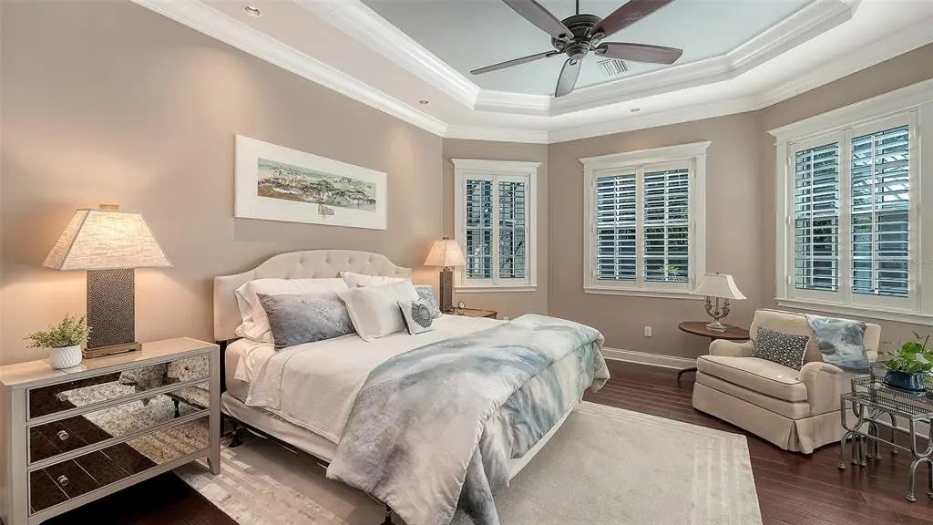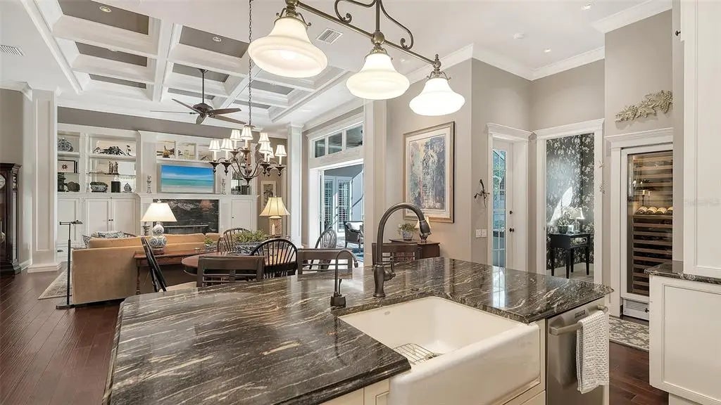- Interior FeaturesBuilt-in Features, Coffered Ceiling(s), Crown Molding, Eating Space In Kitchen, In Wall Pest System, Kitchen/Family Room Combo, Open Floorplan, Primary Bedroom Main Floor, Stone Counters, Thermostat, Walk-In Closet(s), Window Treatments